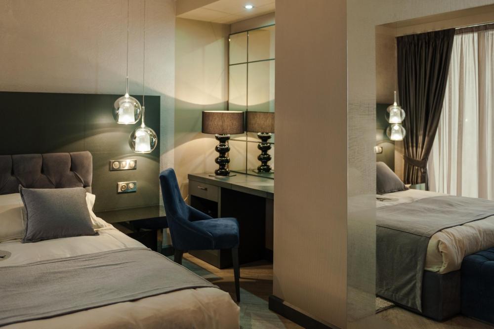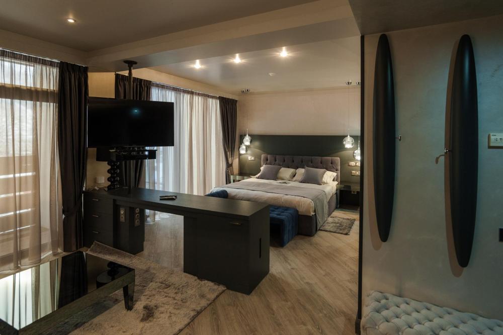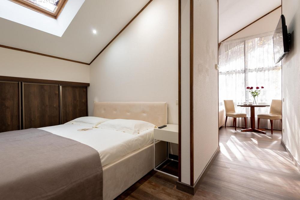 Номера категории "Студио Премиум" в отеле Villa Adriano - просторные однокомнатные номера, площадью 36-50 м2, с визуально разделенной зоной гостиной и спальней, которые позволят в полной мере насладится отдыхом в нашем отеле.