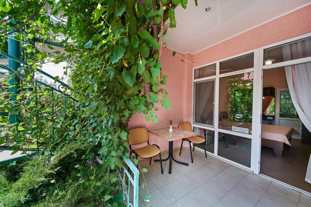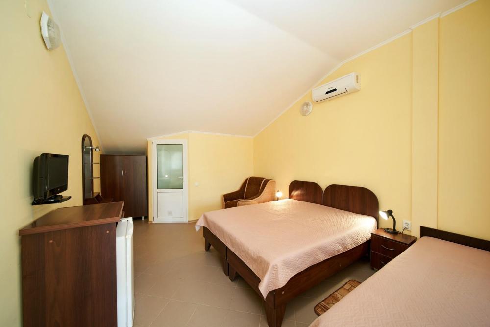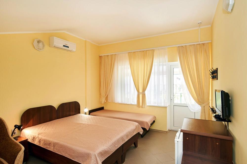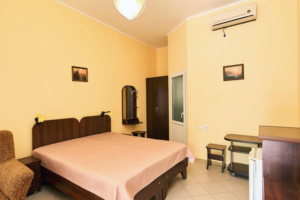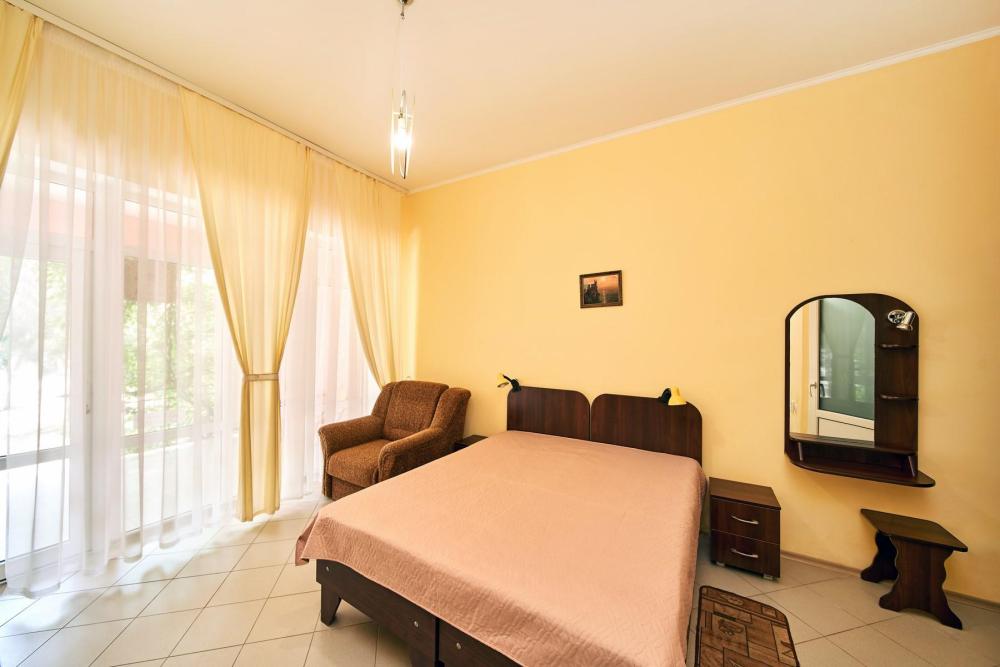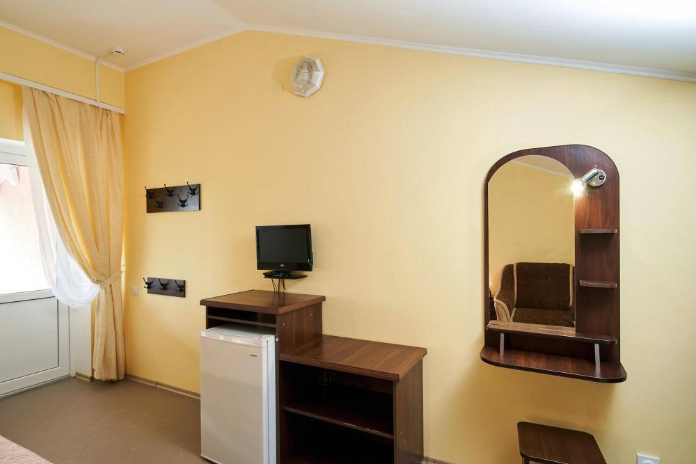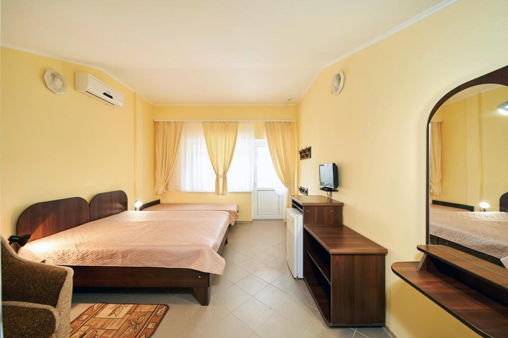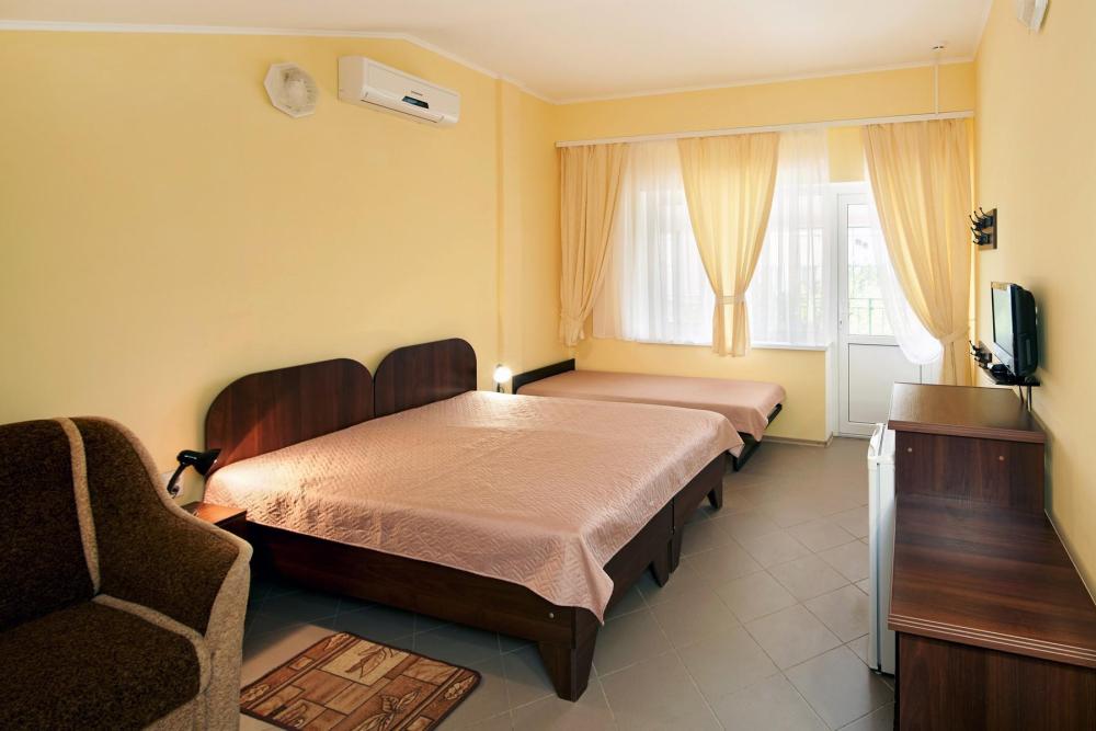 Номер стандарт - это однокомнатный номер со всеми удобствами. Номера данного типа находятся на 1 и 2 этажах. Вход в номер идет через террасу увитую зеленью. Номера на 1 этаже имеют свою небольшую индивидуальную террасу, номера на втором этаже имеют большую общую террасу на 2 номера - отличный вариант для дружной компании из нескольких семей. Номер оборудован кондиционером, телевизором с ЖК-экраном, спутниковым ТВ, холодильником. В номере есть вся необходимая для уютного проживания мебель - две односпальные кровати сделанные на заказ, поэтому при их соединении идет матрас плотно к матрасу без щели, сверху матрасов - единый топпер и обязательно наматрасник. Прикроватные тумбочки, светильники, тумба под телевизор, журнальный столик, столик с зеркалом для дам, шкаф, стулья, фен. Дополнительное спальное место в номере - это кресло-кровать. В номере есть электрочайник и вся необходимая посуда для чаепития. Номер имеет свой санузел, круглосуточное обеспечение горячей и холодной водой. По предварительной договоренности в номере может быть установлена детская кроватка - бесплатно. Гостям предоставляются тонкие летние одеяла, по три полотенца на спальное место. Комплексная услуга проживания включает в себя проживание в номере, уборка номера через день, смена белья 1 раз в 6 дней, а также пользование детской игровой площадкой, детской комнатой, открытым бассейном, шахматами, шашками и другими играми, Wi-Fi на всей территории отеля.