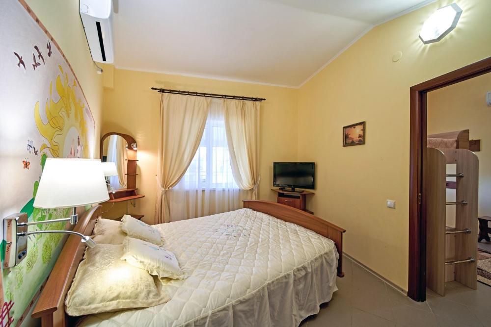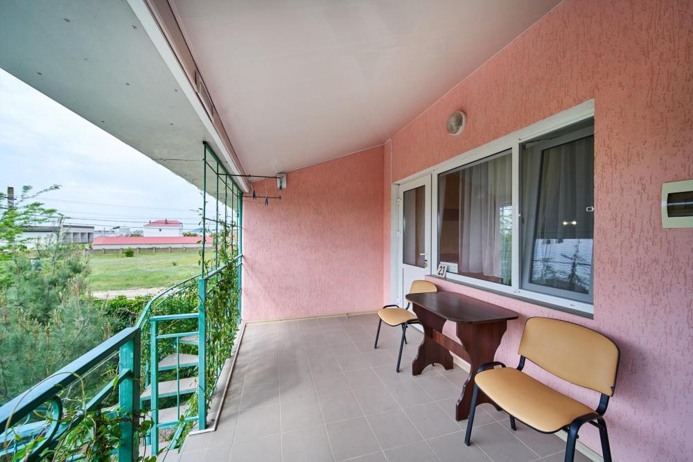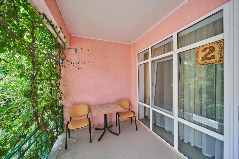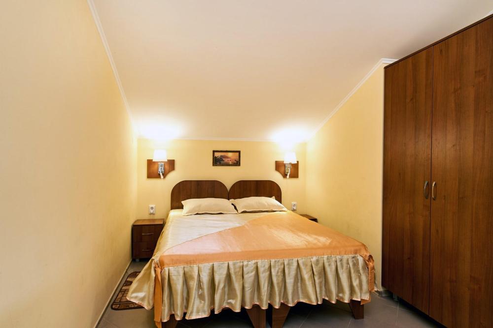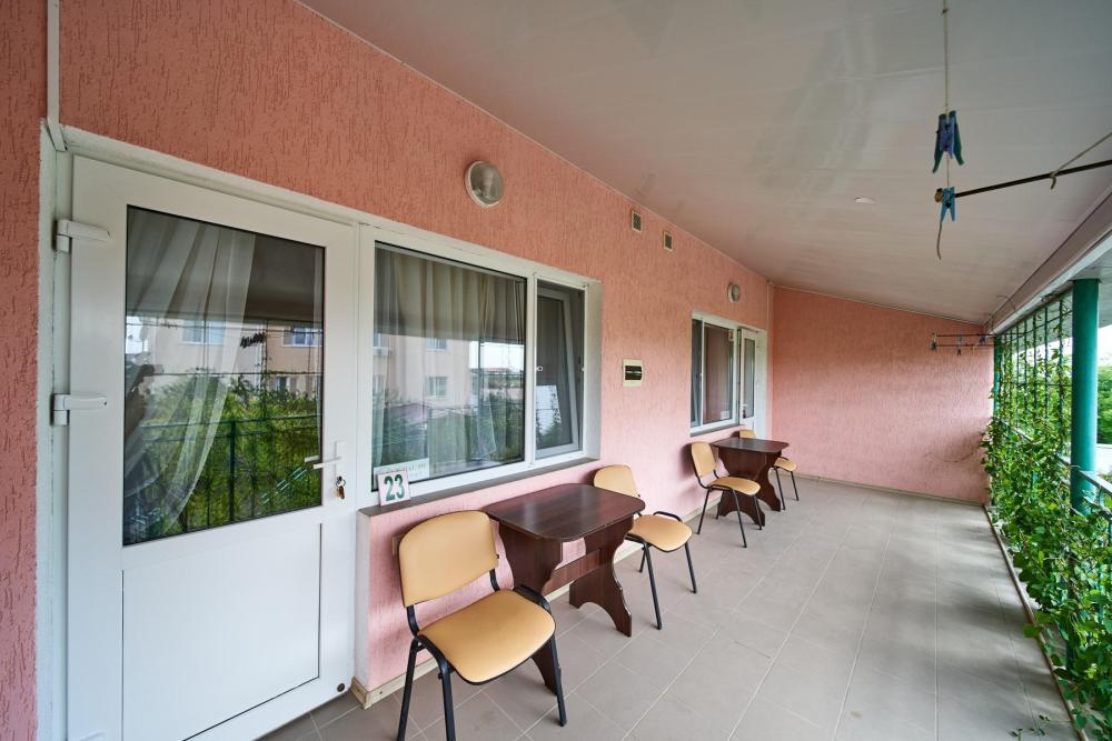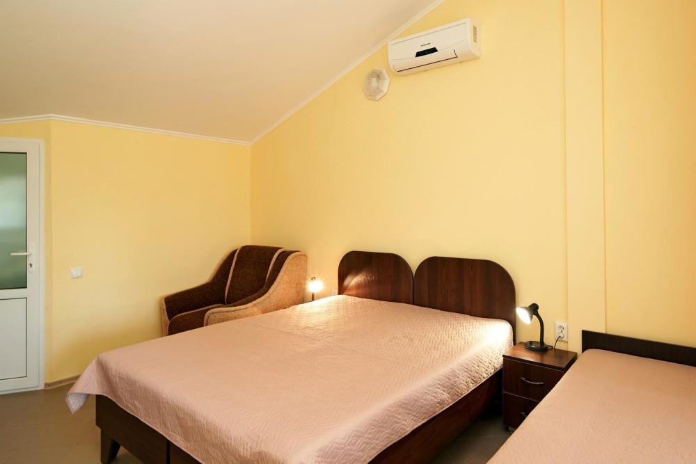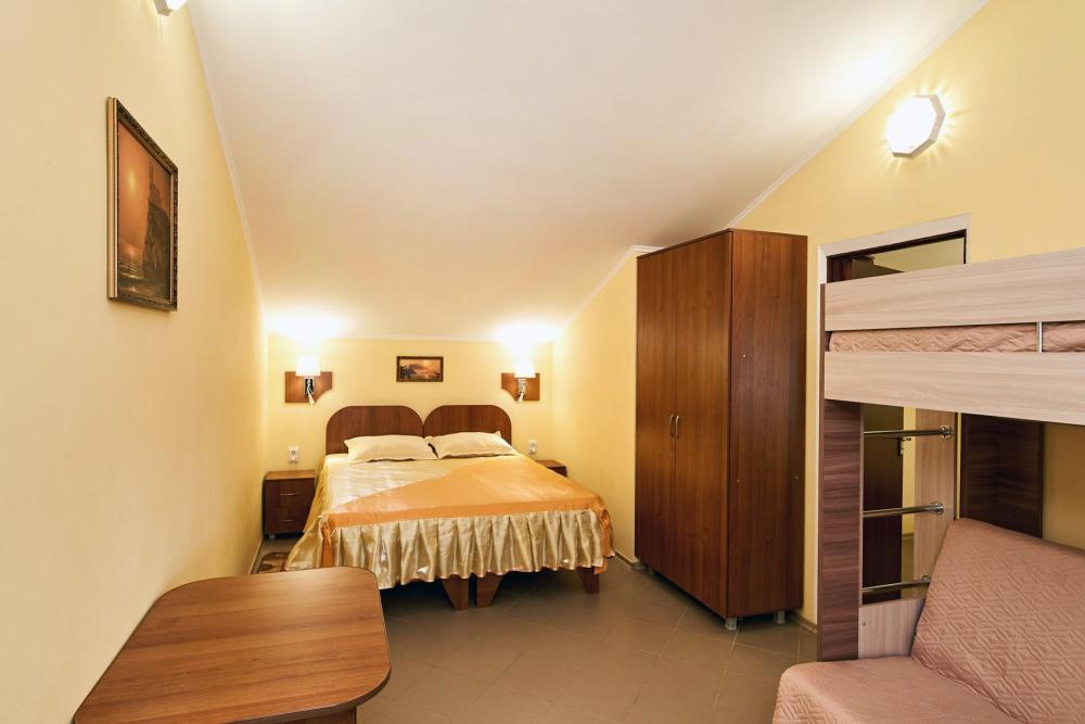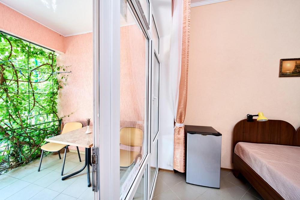 Номер стандарт - это однокомнатный номер со всеми удобствами. Номера данного типа находятся на 1 и 2 этажах. Вход в номер идет через террасу увитую зеленью. Номера на 1 этаже имеют свою небольшую индивидуальную террасу, номера на втором этаже имеют большую общую террасу на 2 номера - отличный вариант для дружной компании из нескольких семей. Номер оборудован кондиционером, телевизором с ЖК-экраном, спутниковым ТВ, холодильником. В номере есть вся необходимая для уютного проживания мебель - две односпальные кровати сделанные на заказ, поэтому при их соединении идет матрас плотно к матрасу без щели, сверху матрасов - единый топпер и обязательно наматрасник. Прикроватные тумбочки, светильники, тумба под телевизор, журнальный столик, столик с зеркалом для дам, шкаф, стулья, фен. Дополнительное спальное место в номере - это кресло-кровать. В номере есть электрочайник и вся необходимая посуда для чаепития. Номер имеет свой санузел, круглосуточное обеспечение горячей и холодной водой. По предварительной договоренности в номере может быть установлена детская кроватка - бесплатно. Гостям предоставляются тонкие летние одеяла, по три полотенца на спальное место. Комплексная услуга проживания включает в себя проживание в номере, уборка номера через день, смена белья 1 раз в 6 дней, а также пользование детской игровой площадкой, детской комнатой, открытым бассейном, шахматами, шашками и другими играми, Wi-Fi на всей территории отеля.