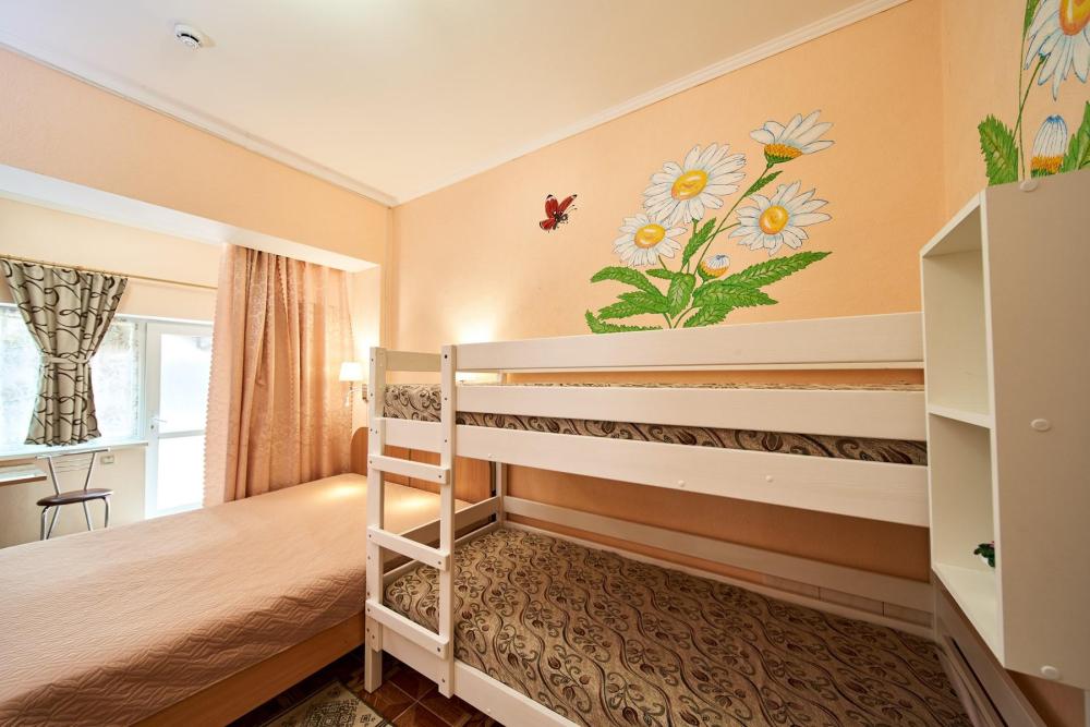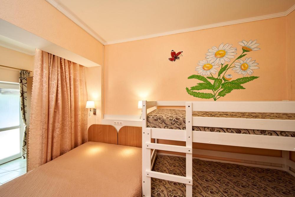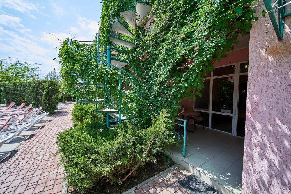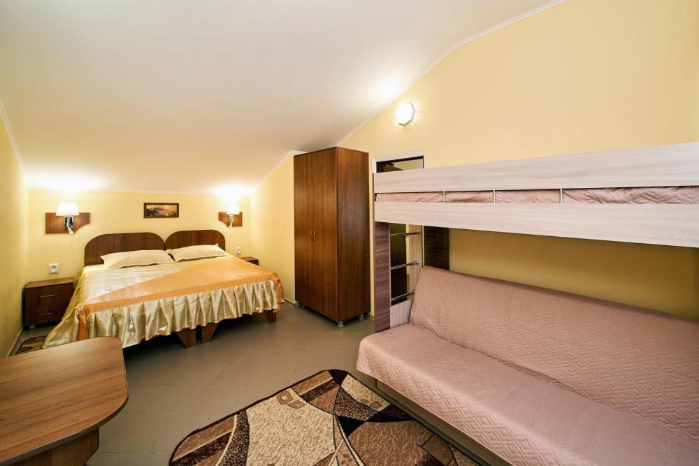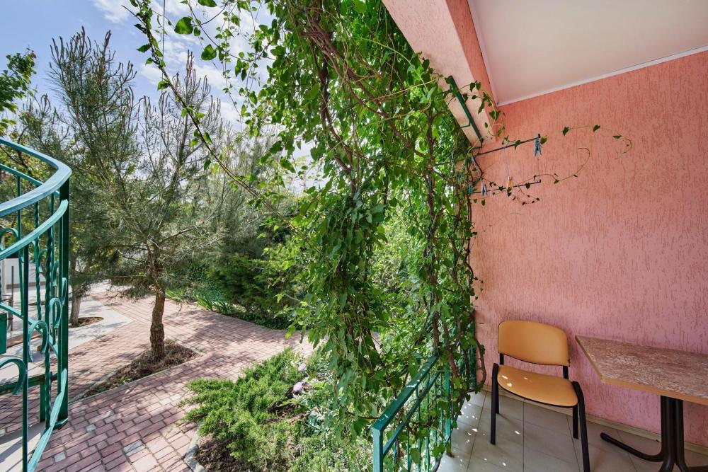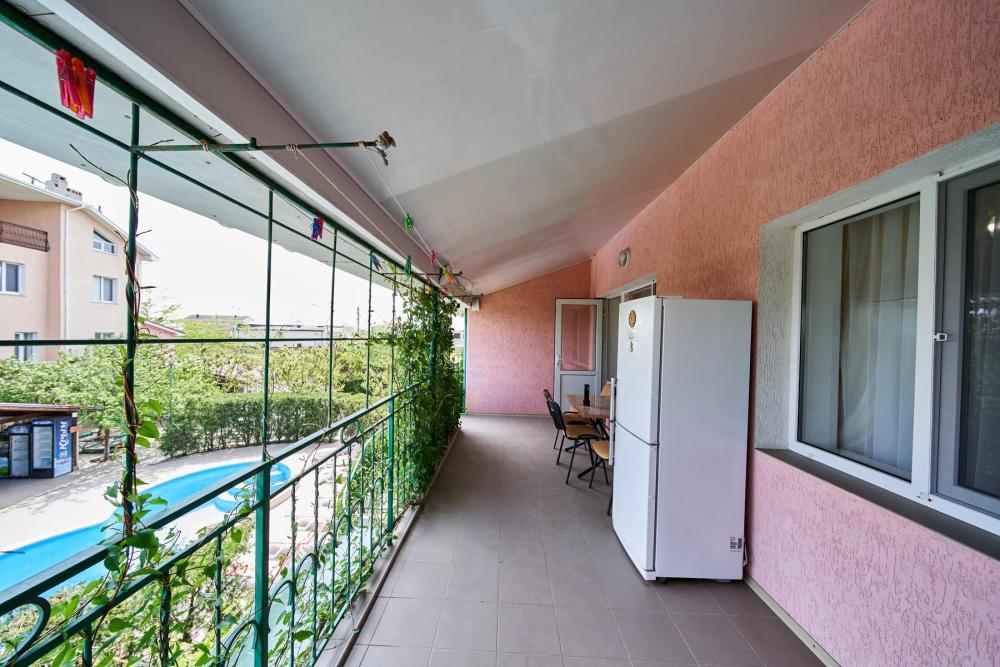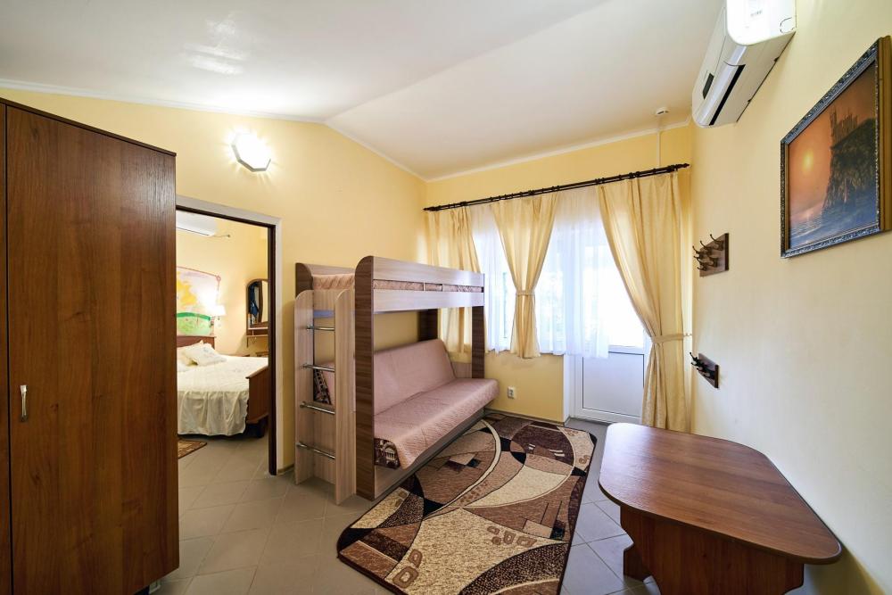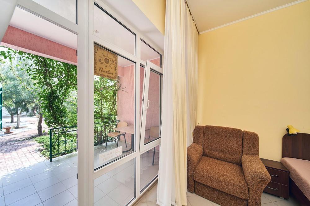 Номер стандарт - это однокомнатный номер со всеми удобствами. Номера данного типа находятся на 1 и 2 этажах. Вход в номер идет через террасу увитую зеленью. Номера на 1 этаже имеют свою небольшую индивидуальную террасу, номера на втором этаже имеют большую общую террасу на 2 номера - отличный вариант для дружной компании из нескольких семей. Номер оборудован кондиционером, телевизором с ЖК-экраном, спутниковым ТВ, холодильником. В номере есть вся необходимая для уютного проживания мебель - две односпальные кровати сделанные на заказ, поэтому при их соединении идет матрас плотно к матрасу без щели, сверху матрасов - единый топпер и обязательно наматрасник. Прикроватные тумбочки, светильники, тумба под телевизор, журнальный столик, столик с зеркалом для дам, шкаф, стулья, фен. Дополнительное спальное место в номере - это кресло-кровать. В номере есть электрочайник и вся необходимая посуда для чаепития. Номер имеет свой санузел, круглосуточное обеспечение горячей и холодной водой. По предварительной договоренности в номере может быть установлена детская кроватка - бесплатно. Гостям предоставляются тонкие летние одеяла, по три полотенца на спальное место. Комплексная услуга проживания включает в себя проживание в номере, уборка номера через день, смена белья 1 раз в 6 дней, а также пользование детской игровой площадкой, детской комнатой, открытым бассейном, шахматами, шашками и другими играми, Wi-Fi на всей территории отеля.