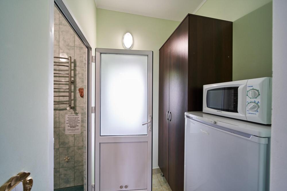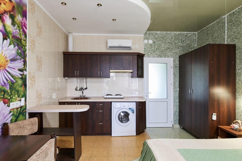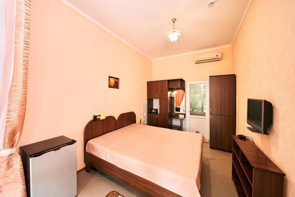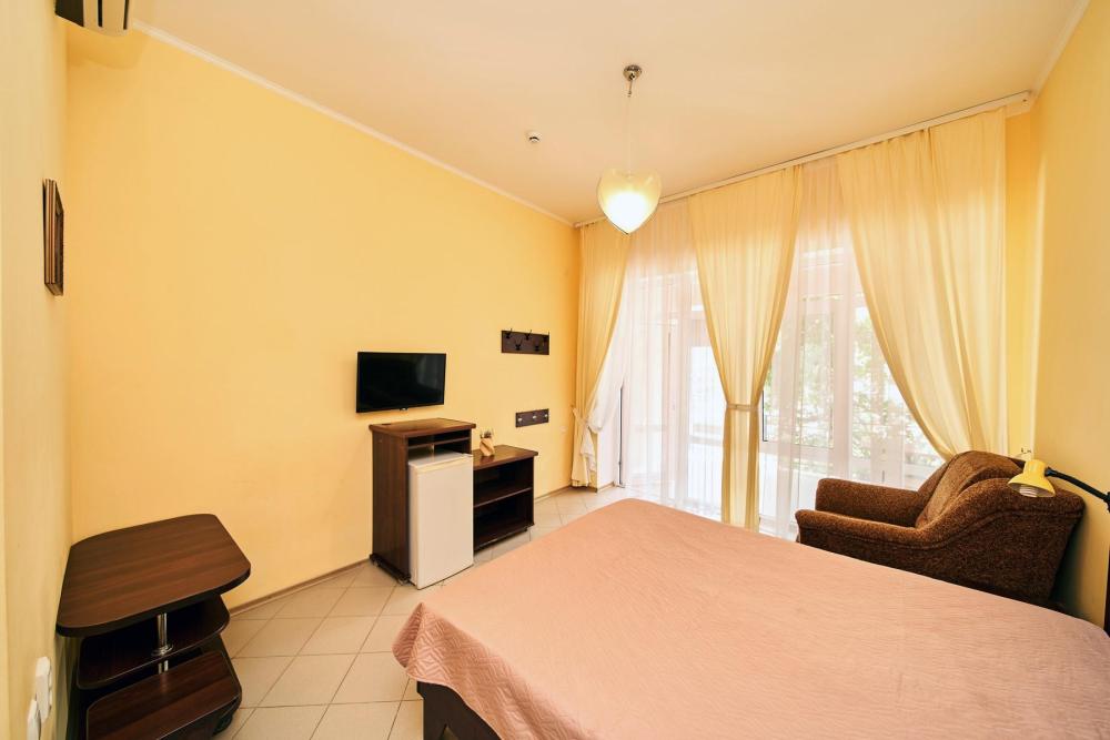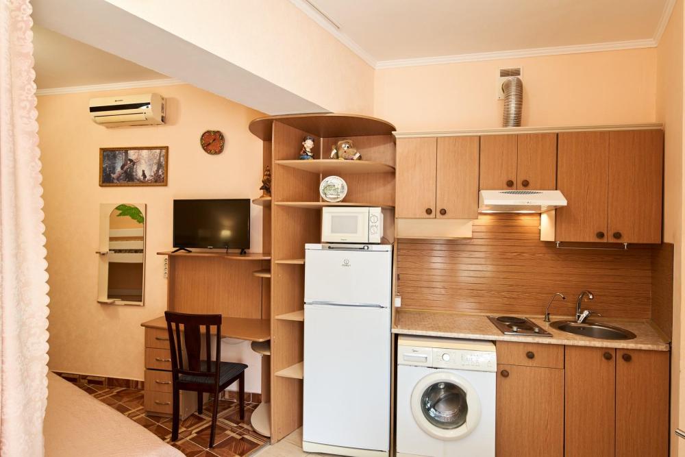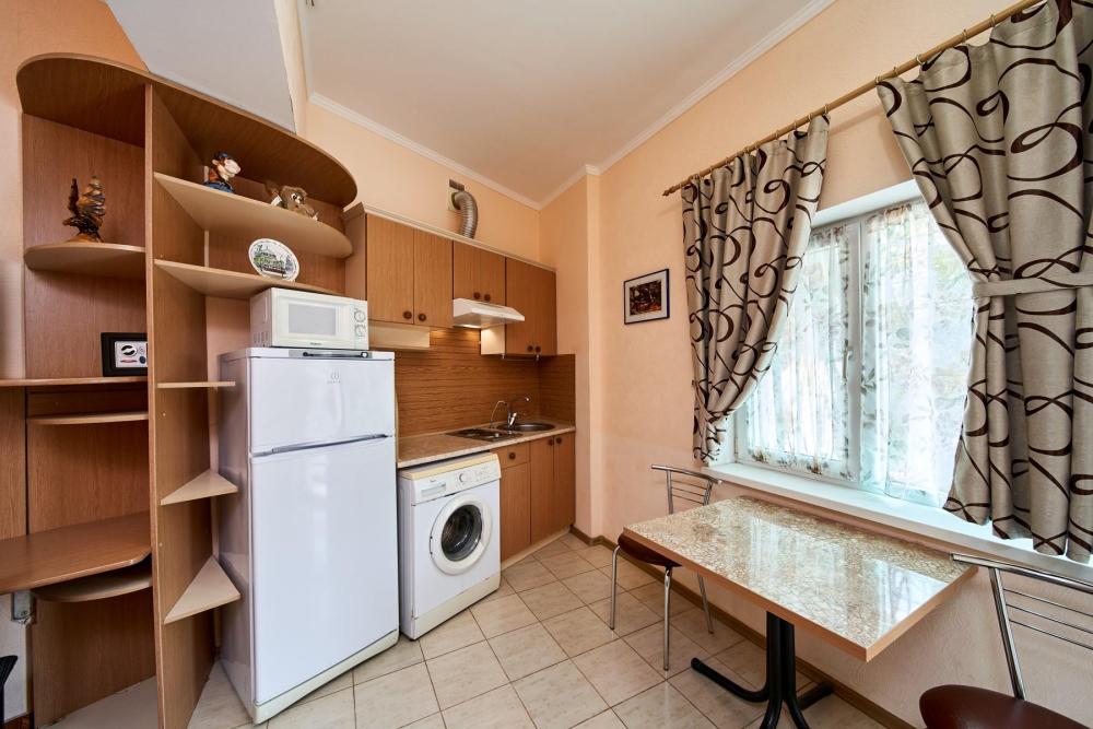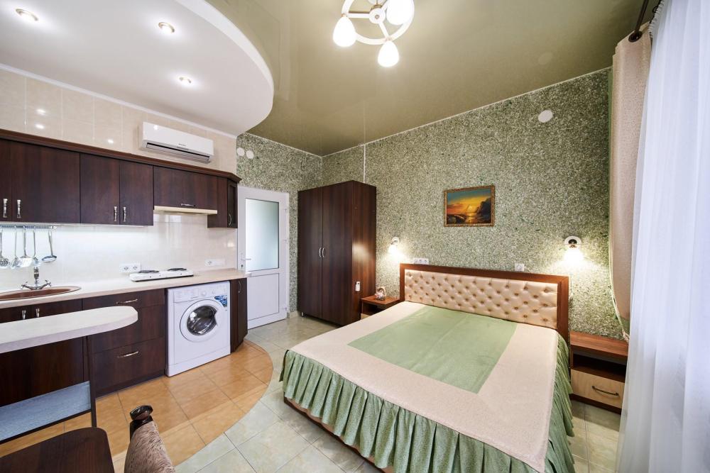 Номер стандарт с кухней-студией - это однокомнатный номер со всеми удобствами, а также кухонной зоной. Номер данного типа находятся на 1 этаже. Вход в номер идет через навес из винограда. Номер оборудован кондиционером, телевизором с ЖК-экраном, спутниковым ТВ. В номере есть вся необходимая для уютного проживания мебель - две односпальные кровати сделанные на заказ, поэтому при их соединении идет матрас плотно к матрасу без щели, сверху - топпер 160*190 и наматрасник, прикроватная тумбочка, светильник, тумба под телевизор, журнальный столик, столик с зеркалом для дам, шкаф, стул, фен. Дополнительное спальное место в номере - это кресло-кровать. А также в номере есть кухонная зона: кухонная стенка, холодильник, стиральная машина, микроволновая печь, встроенная двухконфорочная электроплита, электрочайник, обеденный стол и стулья. Есть вся необходимая посуда для приготовления пищи. Номер имеет свой санузел, круглосуточное обеспечение горячей и холодной водой. По предварительной договоренности в номере может быть установлена детская кроватка - бесплатно. Гостям предоставляются тонкие летние одеяла, по три полотенца на спальное место. Комплексная услуга проживания включает в себя проживание в номере, уборка номера через день, смена белья 1 раз в 6 дней, а также пользование детской игровой площадкой, детской комнатой, открытым бассейном, шахматами, шашками и другими играми, Wi-Fi на всей территории отеля.