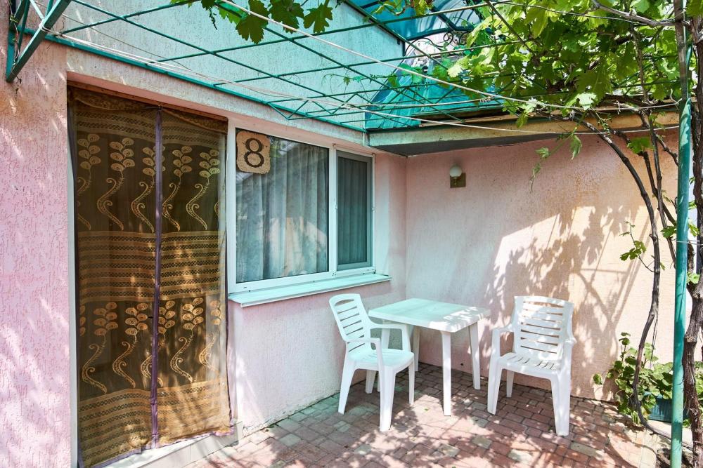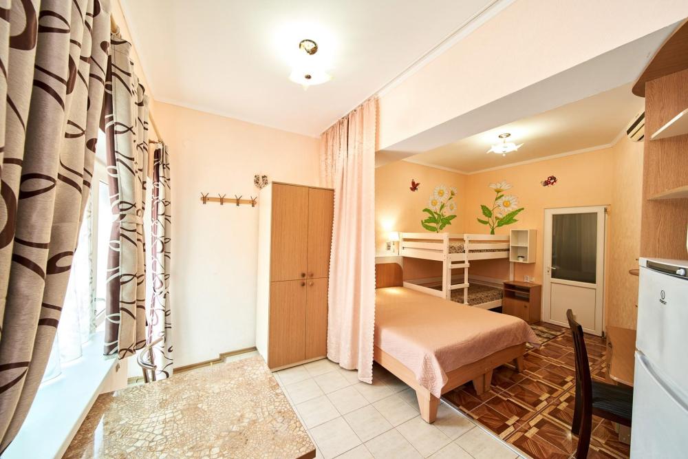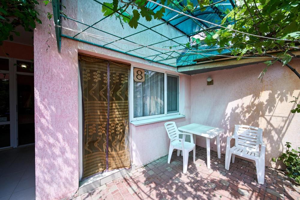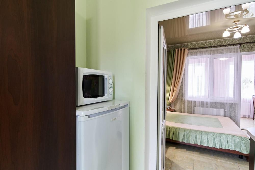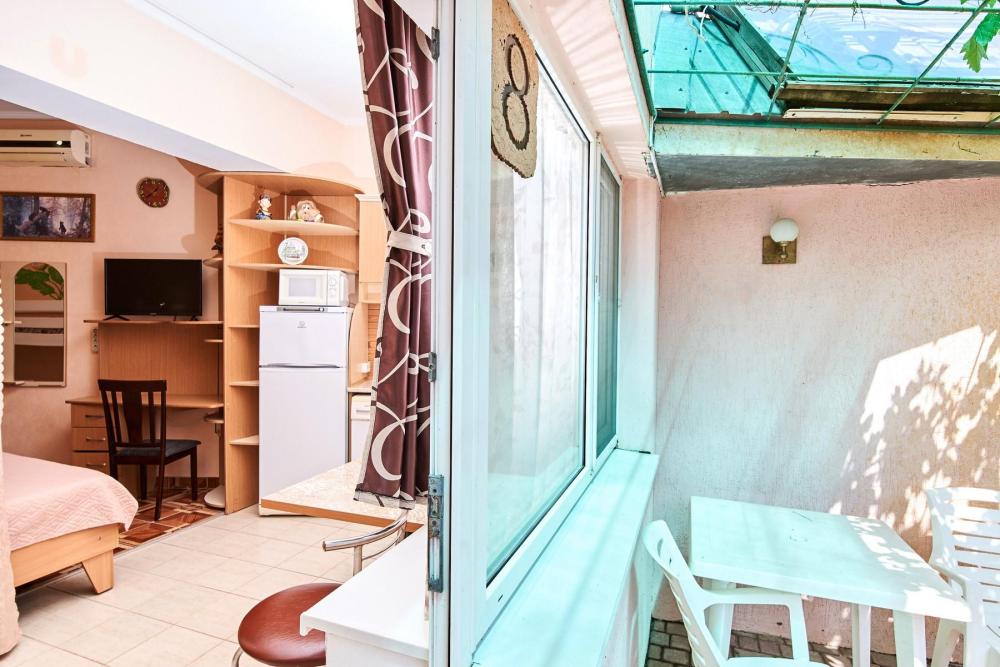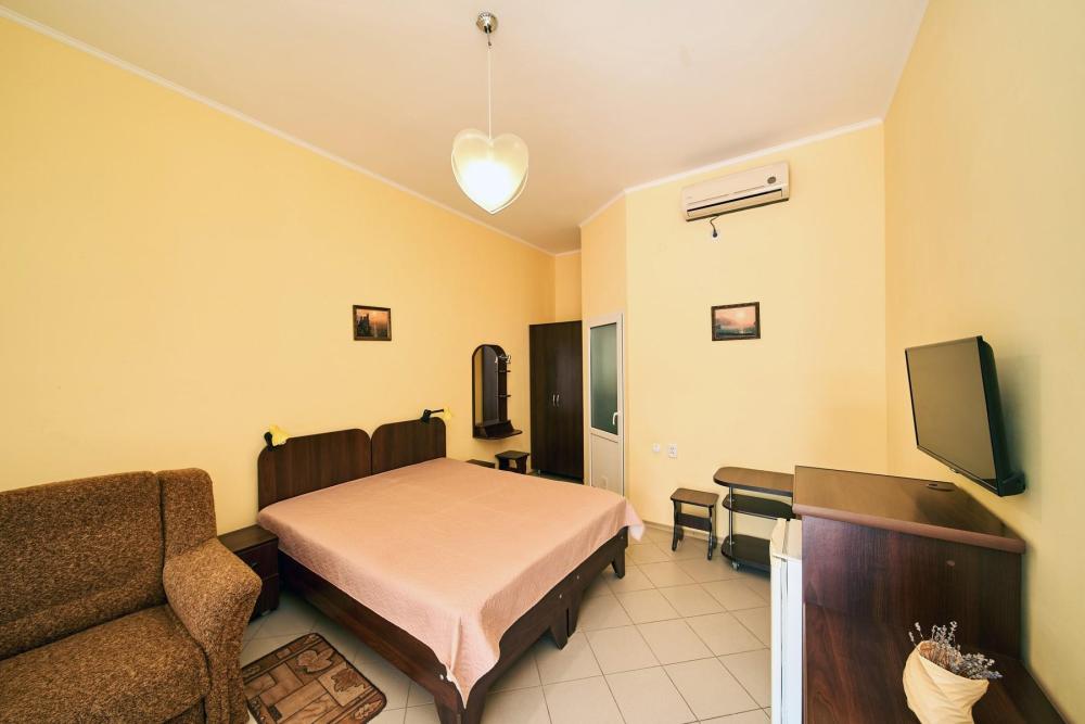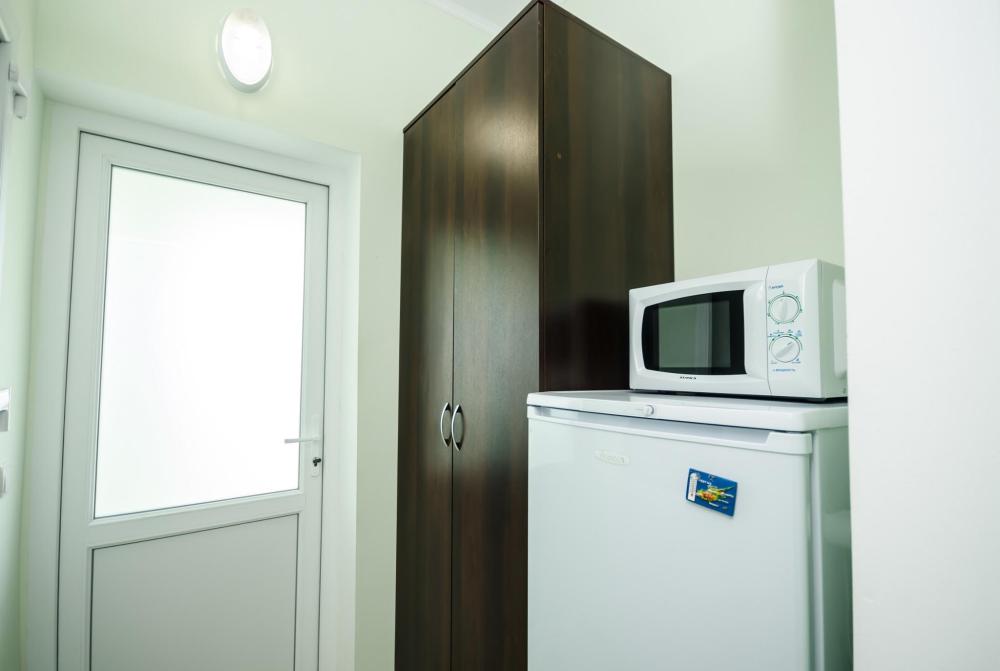 Номер стандарт с кухней-студией - это однокомнатный номер со всеми удобствами, а также кухонной зоной. Номер данного типа находятся на 1 этаже. Вход в номер идет через навес из винограда. Номер оборудован кондиционером, телевизором с ЖК-экраном, спутниковым ТВ. В номере есть вся необходимая для уютного проживания мебель - две односпальные кровати сделанные на заказ, поэтому при их соединении идет матрас плотно к матрасу без щели, сверху - топпер 160*190 и наматрасник, прикроватная тумбочка, светильник, тумба под телевизор, журнальный столик, столик с зеркалом для дам, шкаф, стул, фен. Дополнительное спальное место в номере - это кресло-кровать. А также в номере есть кухонная зона: кухонная стенка, холодильник, стиральная машина, микроволновая печь, встроенная двухконфорочная электроплита, электрочайник, обеденный стол и стулья. Есть вся необходимая посуда для приготовления пищи. Номер имеет свой санузел, круглосуточное обеспечение горячей и холодной водой. По предварительной договоренности в номере может быть установлена детская кроватка - бесплатно. Гостям предоставляются тонкие летние одеяла, по три полотенца на спальное место. Комплексная услуга проживания включает в себя проживание в номере, уборка номера через день, смена белья 1 раз в 6 дней, а также пользование детской игровой площадкой, детской комнатой, открытым бассейном, шахматами, шашками и другими играми, Wi-Fi на всей территории отеля.