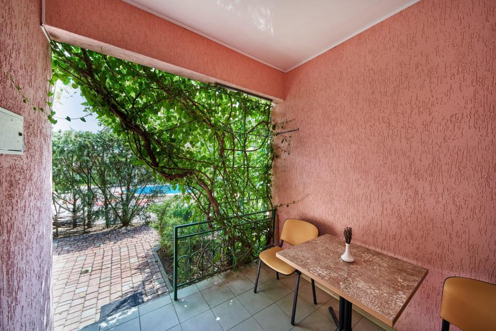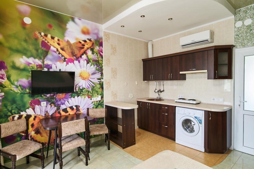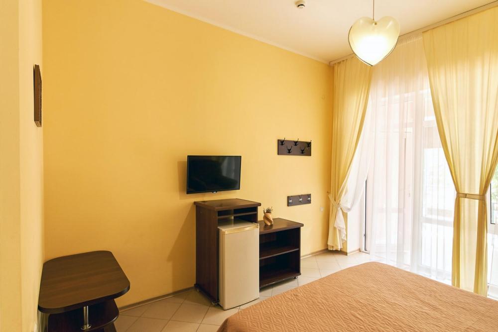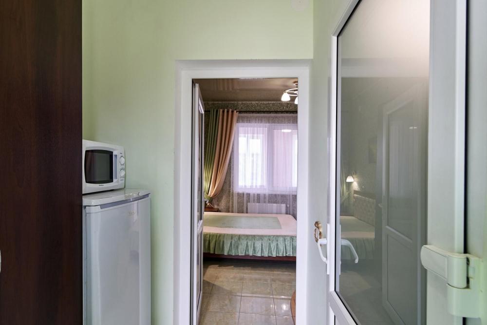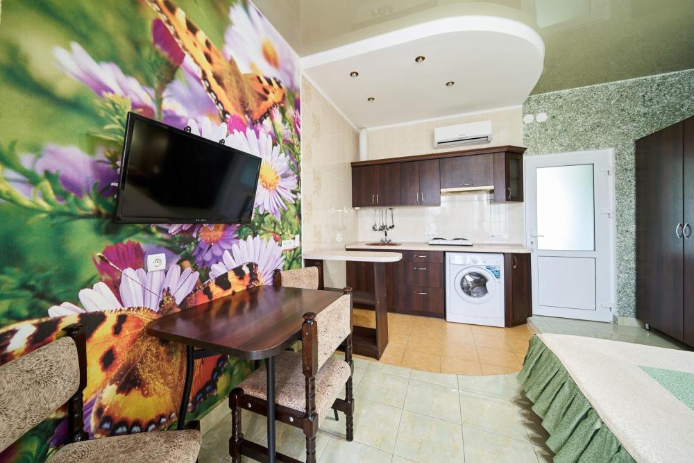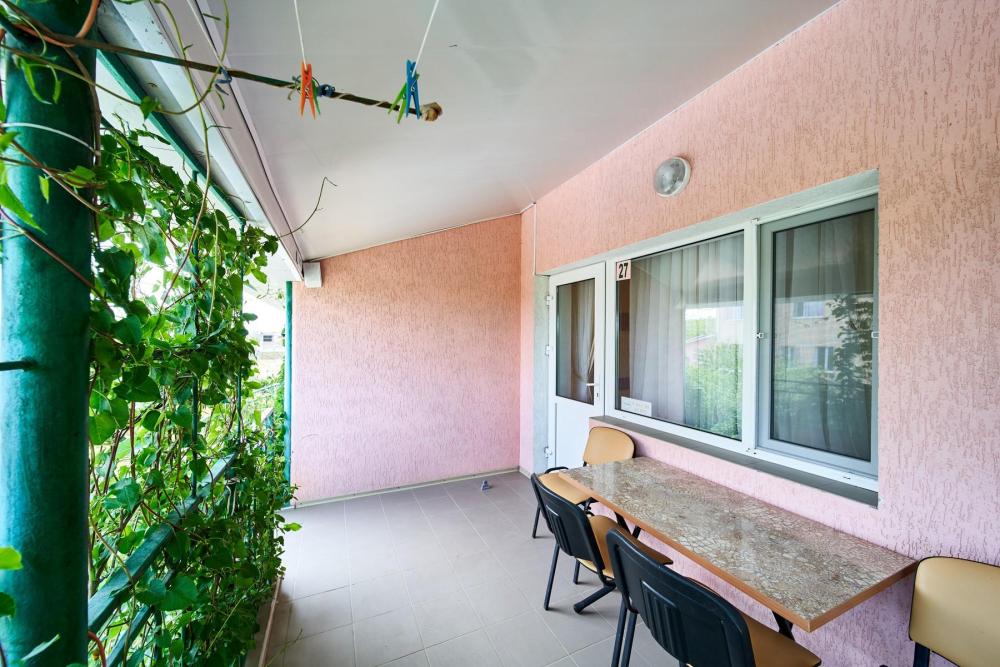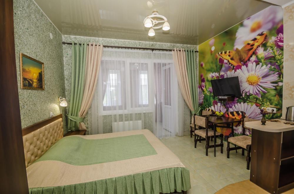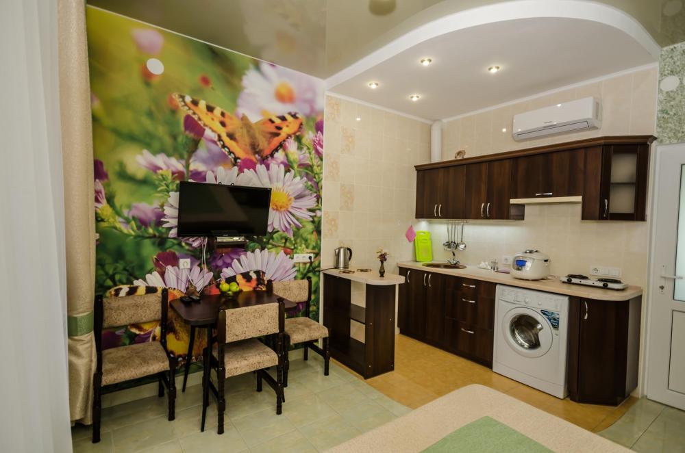 Номер стандарт с кухней-студией - это однокомнатный номер со всеми удобствами, а также кухонной зоной. Номер данного типа находятся на 1 этаже. Вход в номер идет через навес из винограда. Номер оборудован кондиционером, телевизором с ЖК-экраном, спутниковым ТВ. В номере есть вся необходимая для уютного проживания мебель - две односпальные кровати сделанные на заказ, поэтому при их соединении идет матрас плотно к матрасу без щели, сверху - топпер 160*190 и наматрасник, прикроватная тумбочка, светильник, тумба под телевизор, журнальный столик, столик с зеркалом для дам, шкаф, стул, фен. Дополнительное спальное место в номере - это кресло-кровать. А также в номере есть кухонная зона: кухонная стенка, холодильник, стиральная машина, микроволновая печь, встроенная двухконфорочная электроплита, электрочайник, обеденный стол и стулья. Есть вся необходимая посуда для приготовления пищи. Номер имеет свой санузел, круглосуточное обеспечение горячей и холодной водой. По предварительной договоренности в номере может быть установлена детская кроватка - бесплатно. Гостям предоставляются тонкие летние одеяла, по три полотенца на спальное место. Комплексная услуга проживания включает в себя проживание в номере, уборка номера через день, смена белья 1 раз в 6 дней, а также пользование детской игровой площадкой, детской комнатой, открытым бассейном, шахматами, шашками и другими играми, Wi-Fi на всей территории отеля.