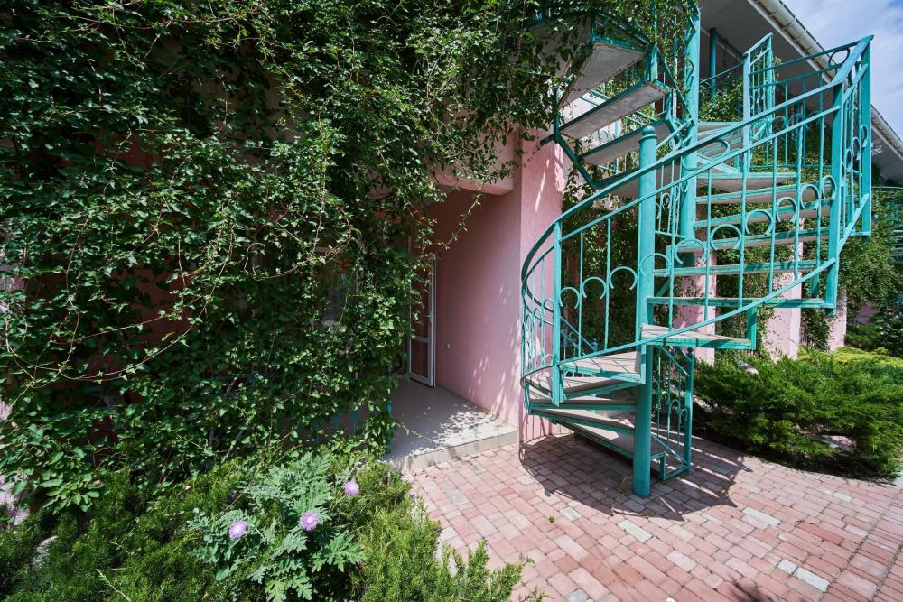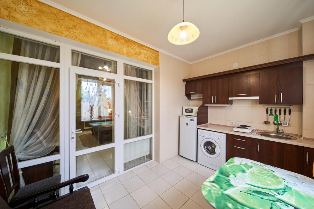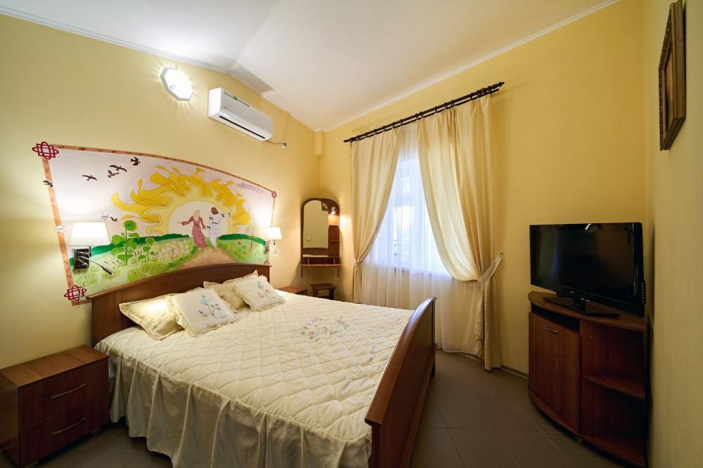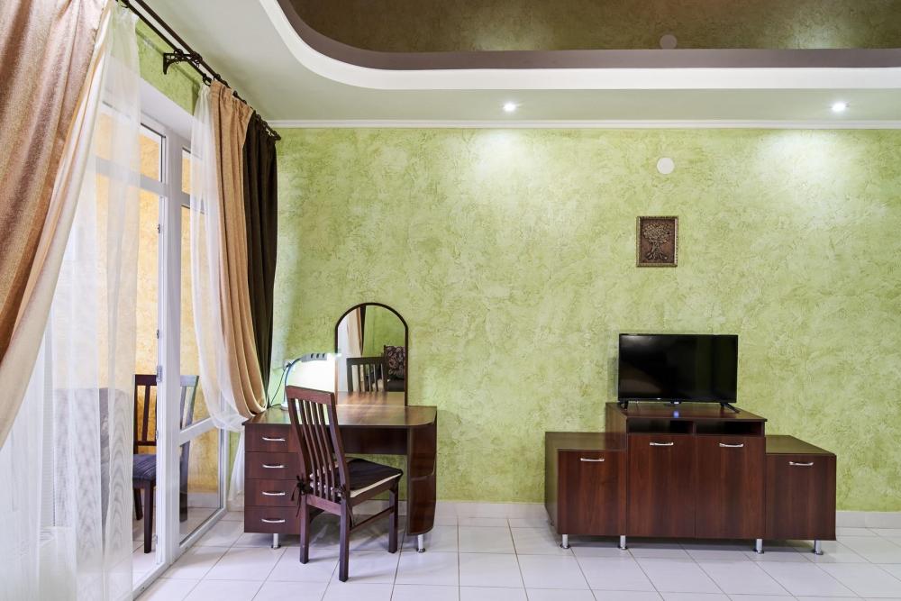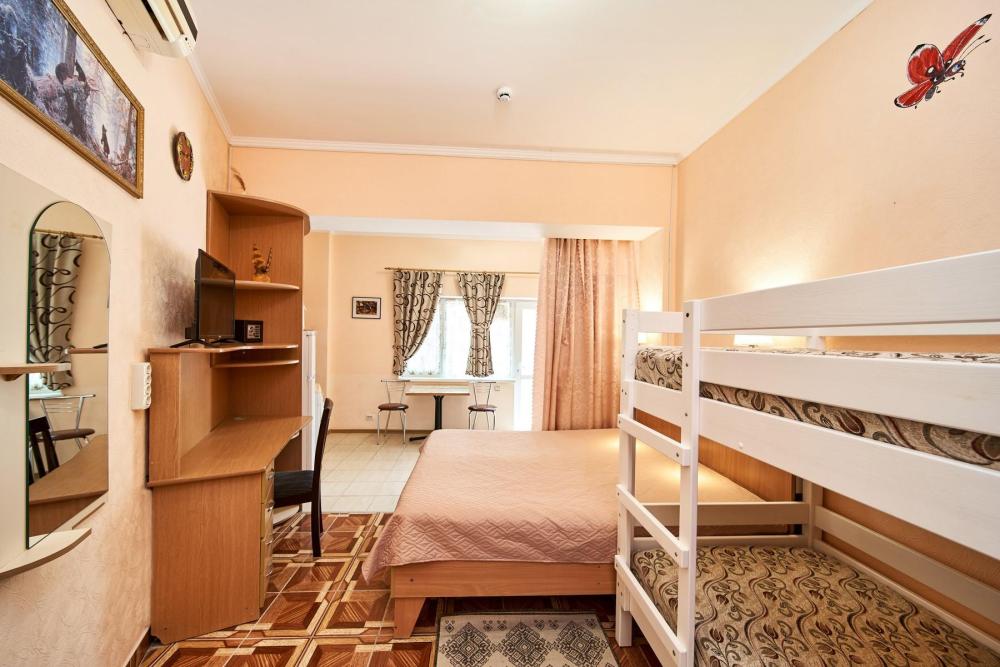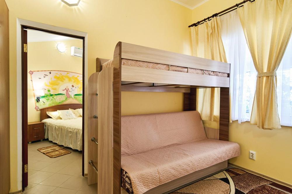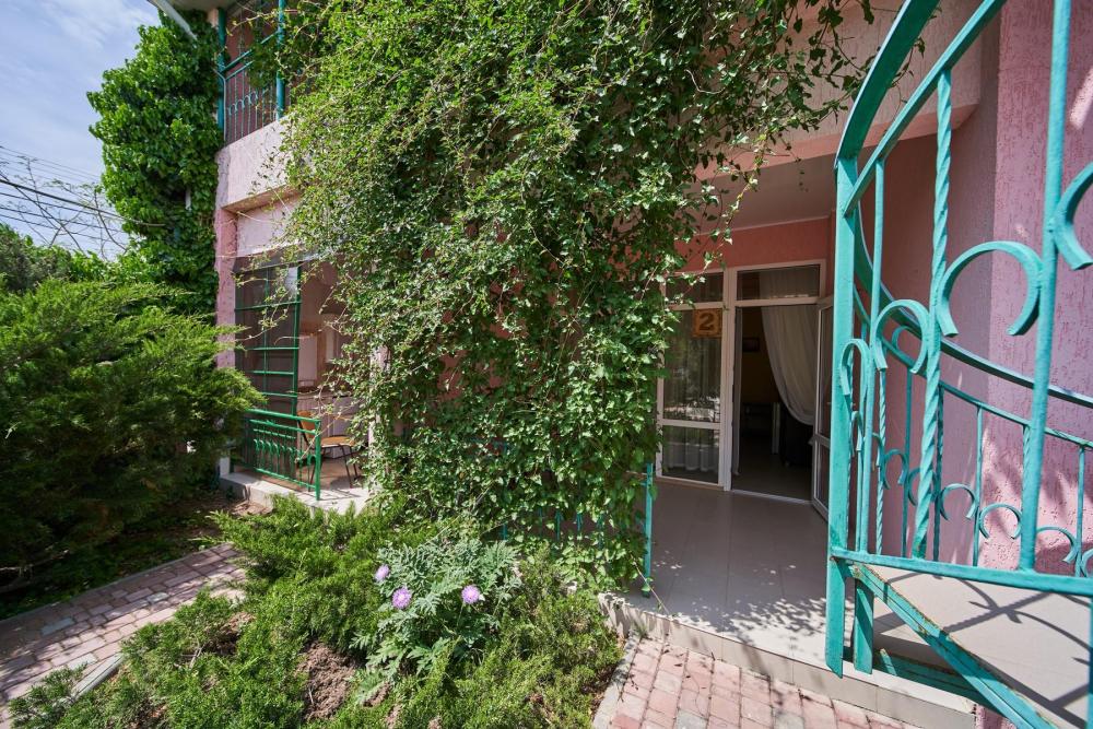 Номер стандарт с кухней-студией - это однокомнатный номер со всеми удобствами, а также кухонной зоной. Номер данного типа находятся на 1 этаже. Вход в номер идет через навес из винограда. Номер оборудован кондиционером, телевизором с ЖК-экраном, спутниковым ТВ. В номере есть вся необходимая для уютного проживания мебель - две односпальные кровати сделанные на заказ, поэтому при их соединении идет матрас плотно к матрасу без щели, сверху - топпер 160*190 и наматрасник, прикроватная тумбочка, светильник, тумба под телевизор, журнальный столик, столик с зеркалом для дам, шкаф, стул, фен. Дополнительное спальное место в номере - это кресло-кровать. А также в номере есть кухонная зона: кухонная стенка, холодильник, стиральная машина, микроволновая печь, встроенная двухконфорочная электроплита, электрочайник, обеденный стол и стулья. Есть вся необходимая посуда для приготовления пищи. Номер имеет свой санузел, круглосуточное обеспечение горячей и холодной водой. По предварительной договоренности в номере может быть установлена детская кроватка - бесплатно. Гостям предоставляются тонкие летние одеяла, по три полотенца на спальное место. Комплексная услуга проживания включает в себя проживание в номере, уборка номера через день, смена белья 1 раз в 6 дней, а также пользование детской игровой площадкой, детской комнатой, открытым бассейном, шахматами, шашками и другими играми, Wi-Fi на всей территории отеля.