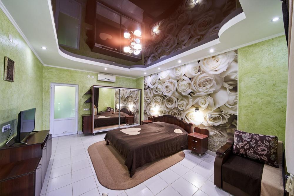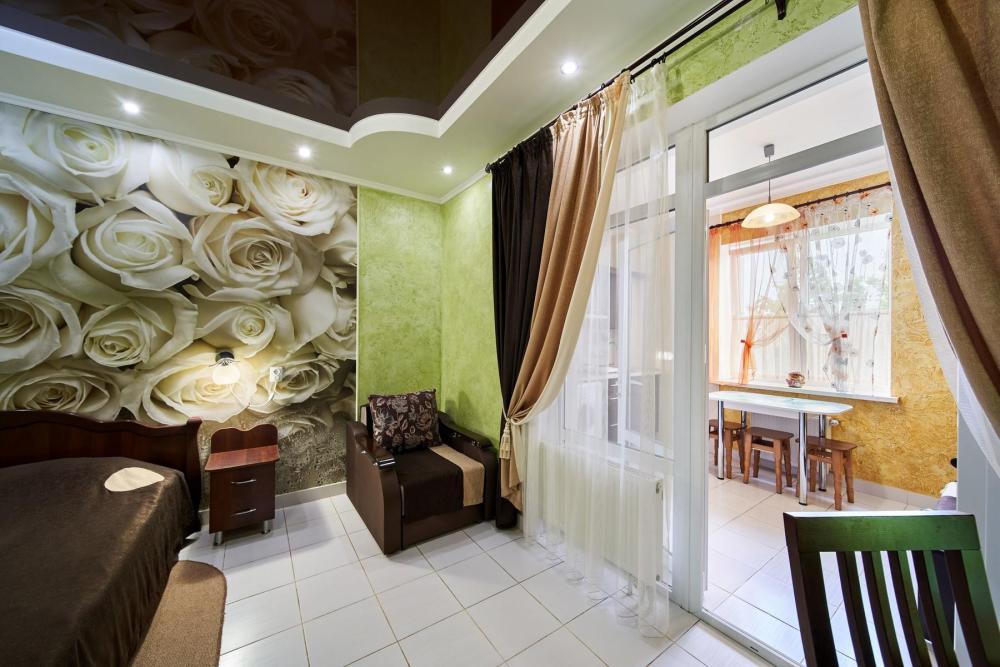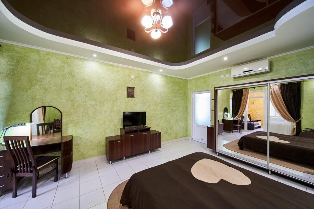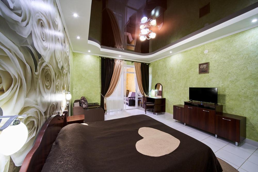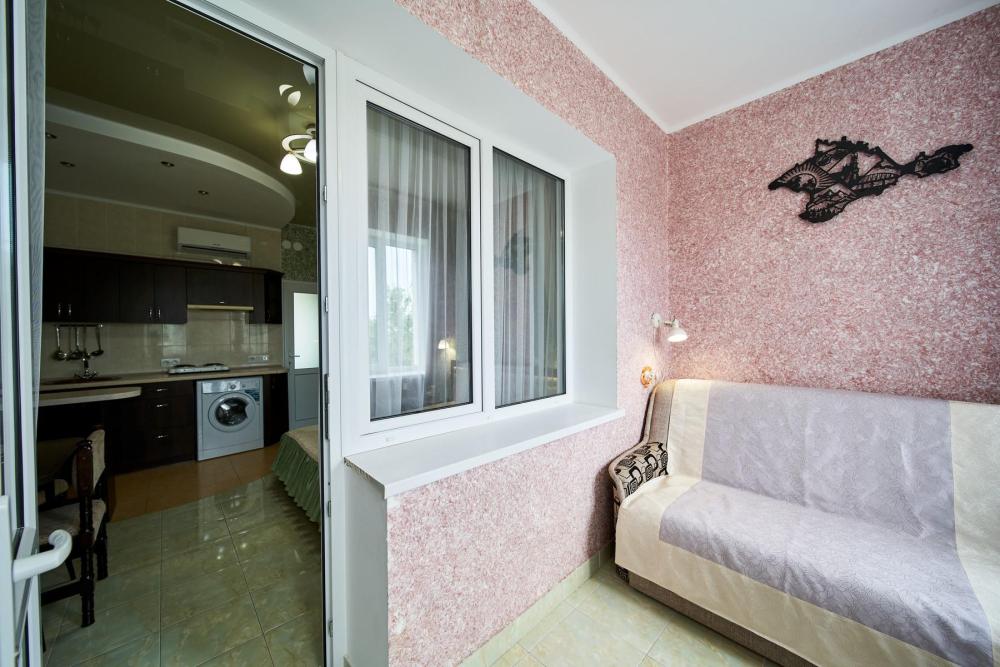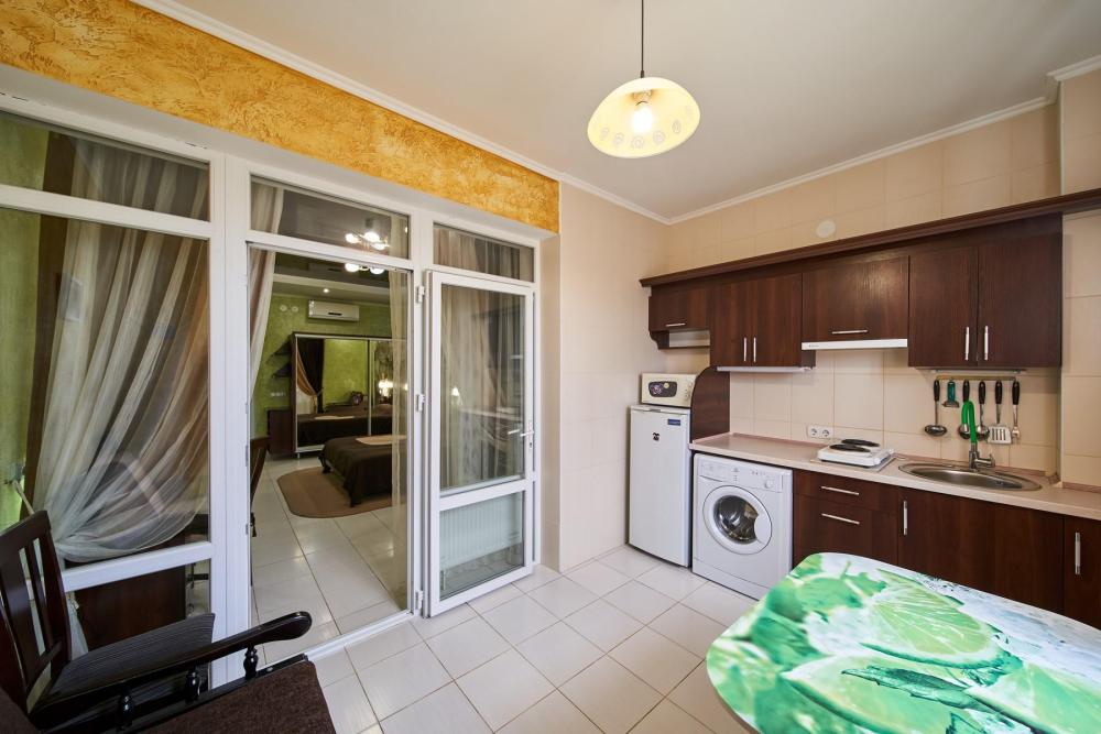 Номер двухкомнатный, одна комната - просторная спальня, вторая комната - полноценная кухня. В спальне большая двуспальная кровать, зеркальный шкаф-купе, телевизор с большим ЖК экраном, рабочий стол с зеркалом для макияжа , кресло-кровать, кондиционер и романтическое настроение. В кухне: кухонная стенка с вытяжкой, встроенная двухконфорочная электроплита, стиральная машина, микроволновая печь, холодильник, обеденный стол и раскладной 2-х спальный диванчик. Вход в номер идет через небольшой коридор, из которого вход в спальную комнату и санузел Санузел имеет гигиенический душ и обычный душ.