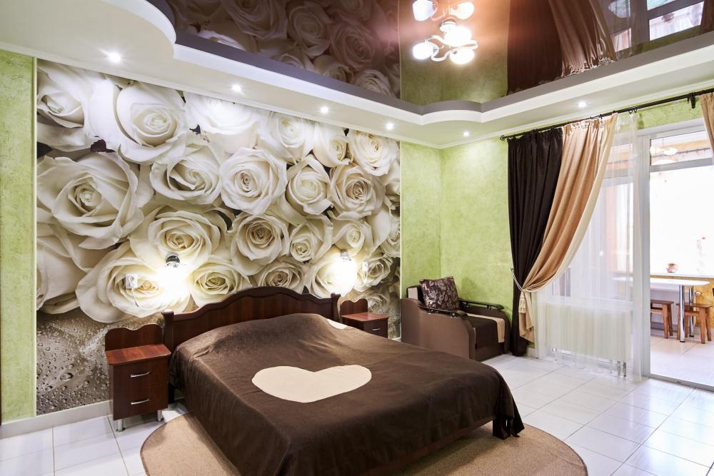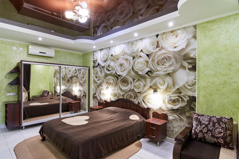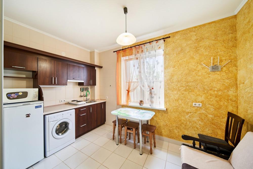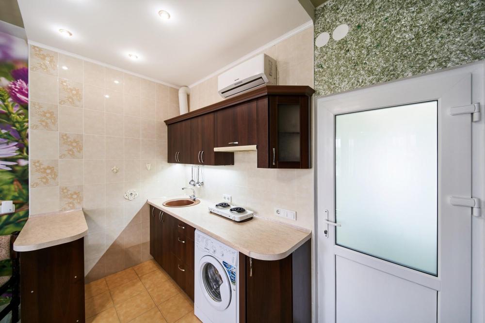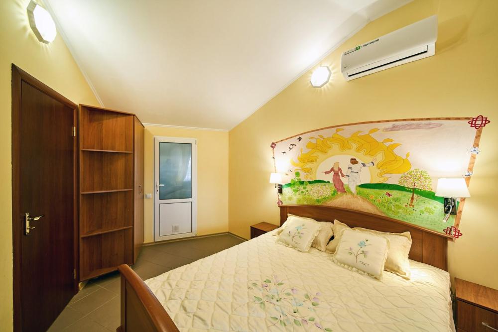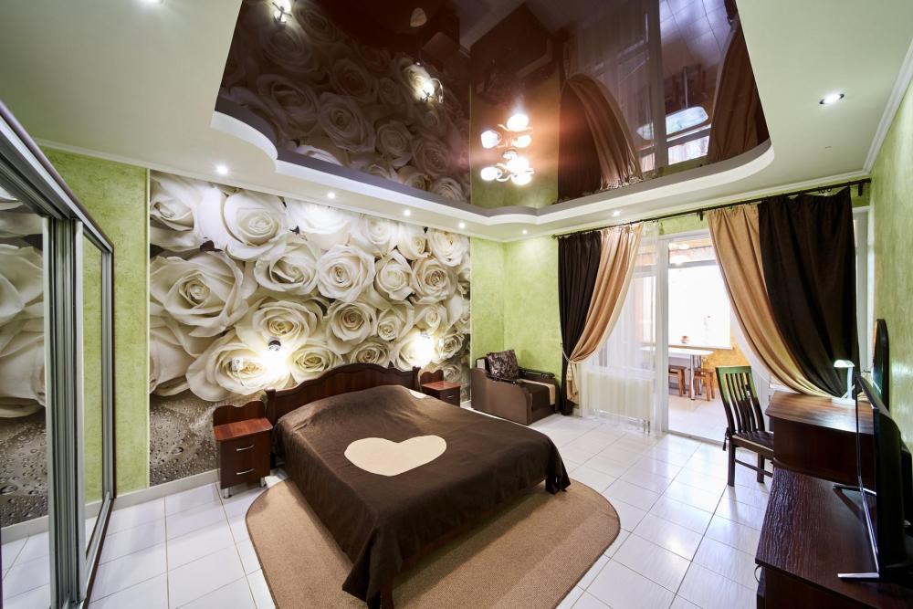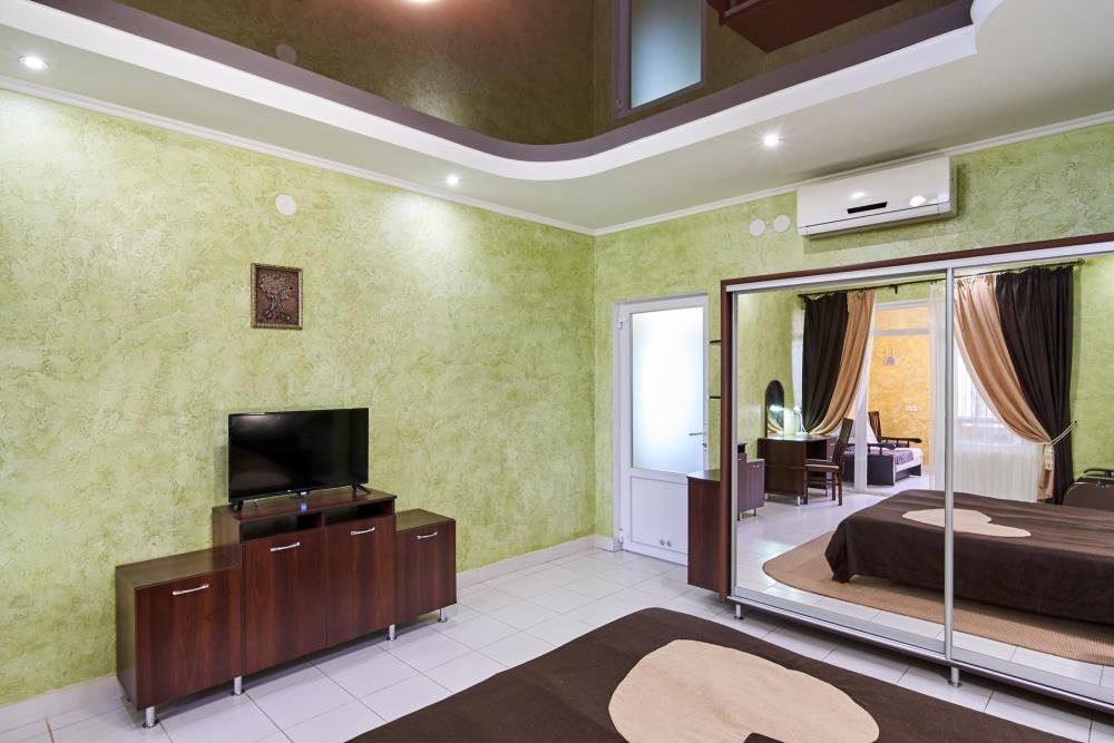 Номер двухкомнатный, одна комната - просторная спальня, вторая комната - полноценная кухня. В спальне большая двуспальная кровать, зеркальный шкаф-купе, телевизор с большим ЖК экраном, рабочий стол с зеркалом для макияжа , кресло-кровать, кондиционер и романтическое настроение. В кухне: кухонная стенка с вытяжкой, встроенная двухконфорочная электроплита, стиральная машина, микроволновая печь, холодильник, обеденный стол и раскладной 2-х спальный диванчик. Вход в номер идет через небольшой коридор, из которого вход в спальную комнату и санузел Санузел имеет гигиенический душ и обычный душ.