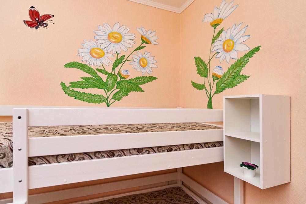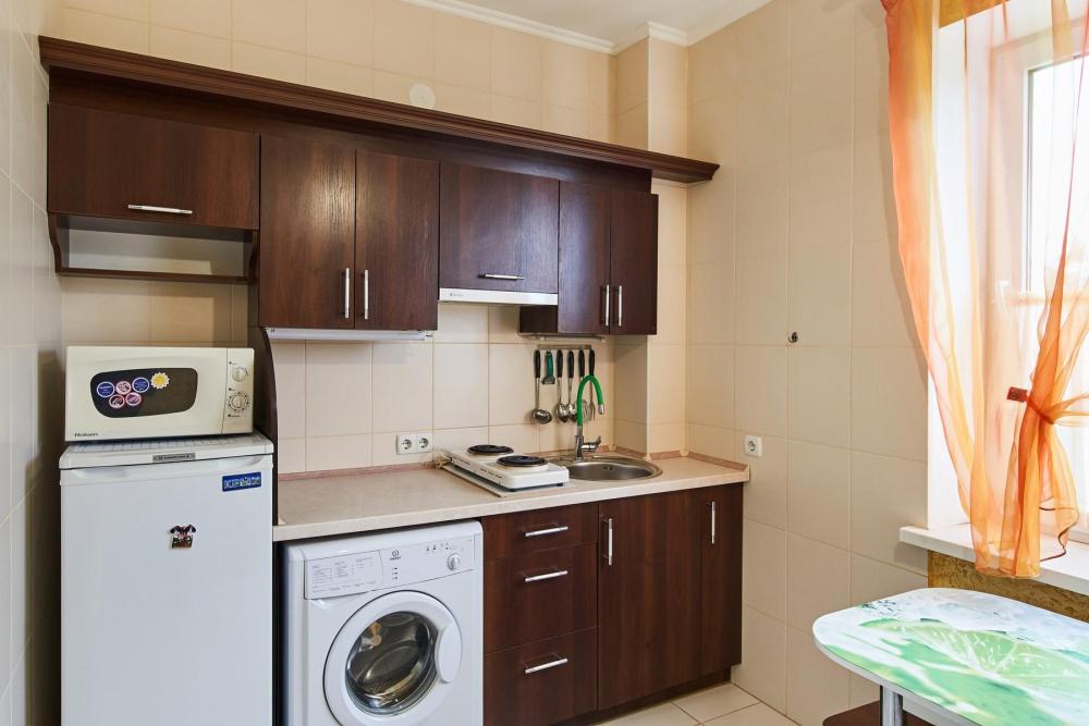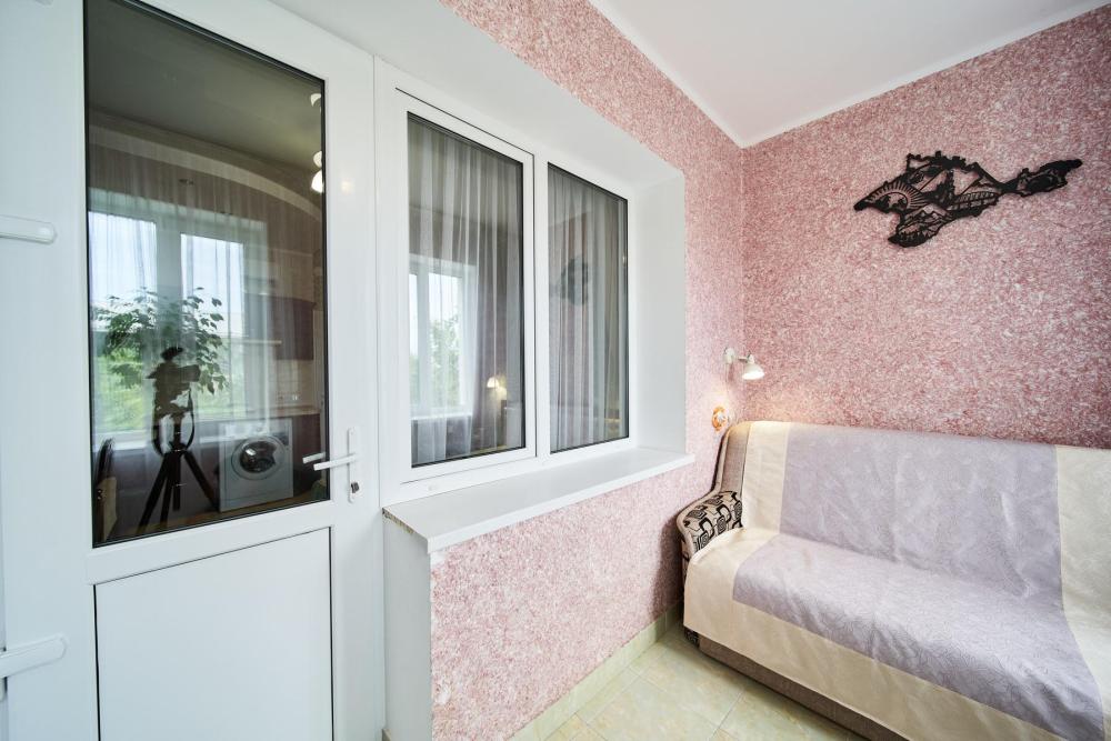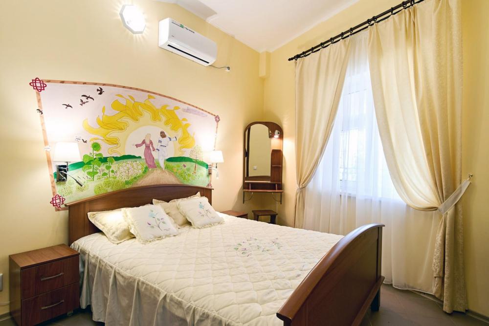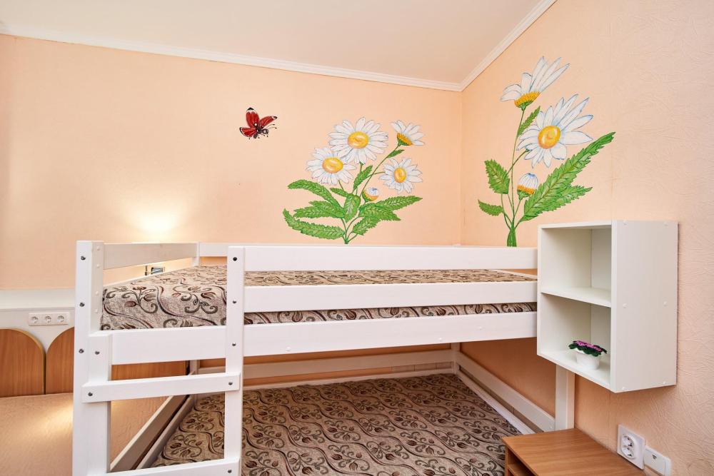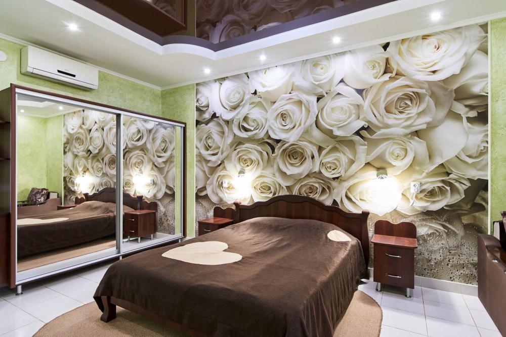 Номер двухкомнатный, одна комната - просторная спальня, вторая комната - полноценная кухня. В спальне большая двуспальная кровать, зеркальный шкаф-купе, телевизор с большим ЖК экраном, рабочий стол с зеркалом для макияжа , кресло-кровать, кондиционер и романтическое настроение. В кухне: кухонная стенка с вытяжкой, встроенная двухконфорочная электроплита, стиральная машина, микроволновая печь, холодильник, обеденный стол и раскладной 2-х спальный диванчик. Вход в номер идет через небольшой коридор, из которого вход в спальную комнату и санузел Санузел имеет гигиенический душ и обычный душ.