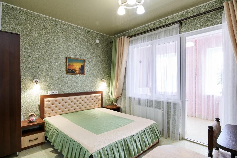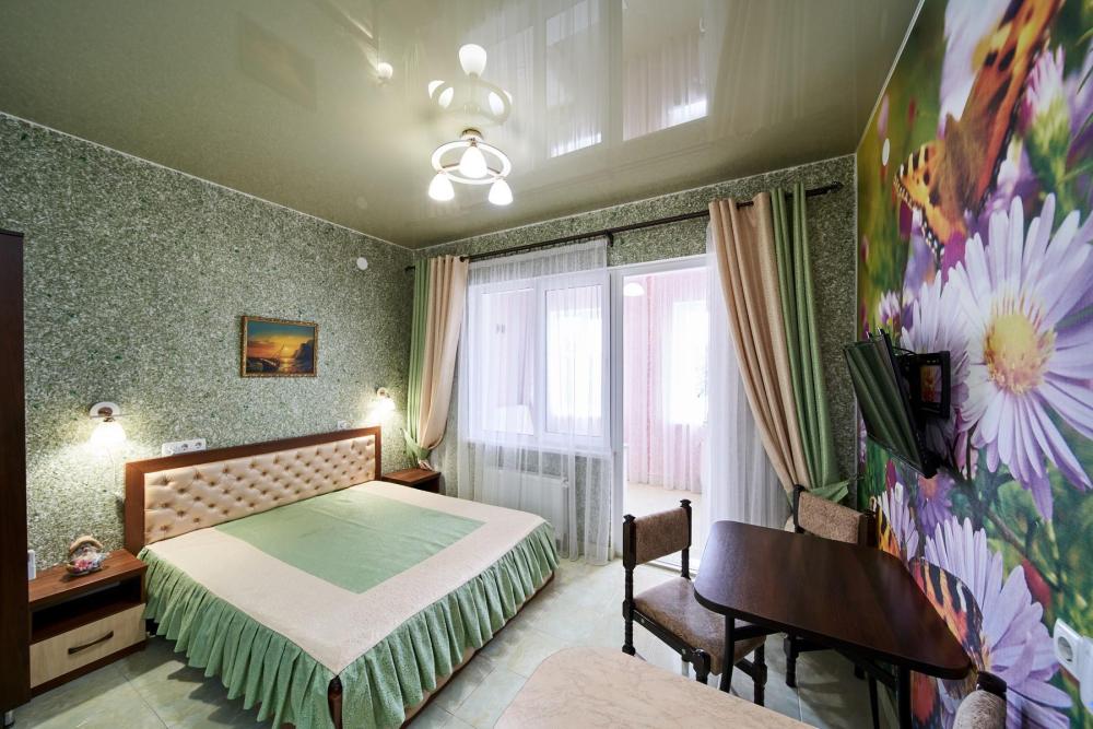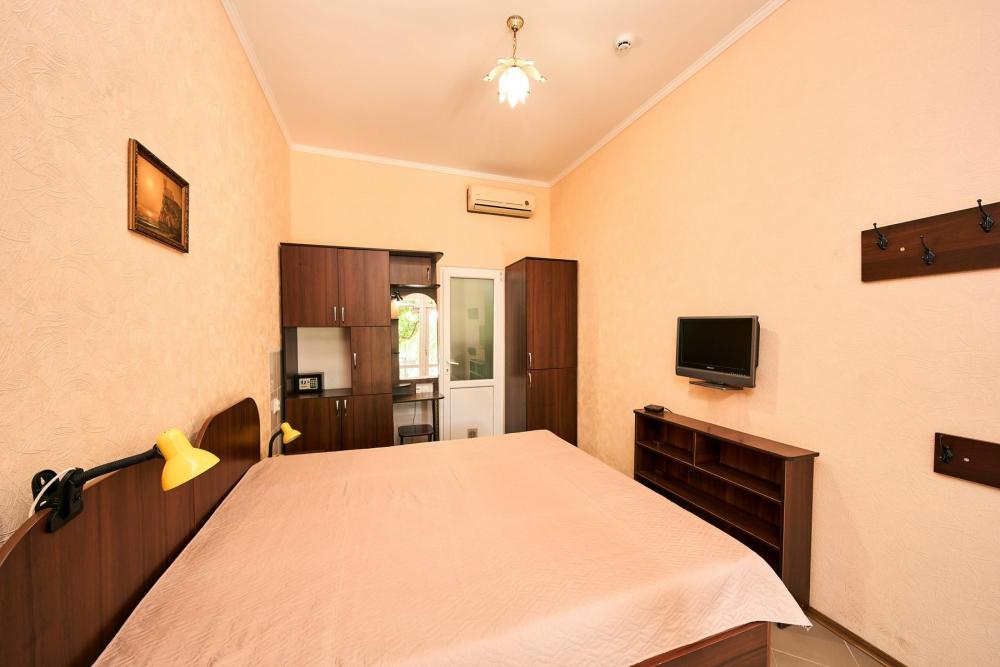Номер стандарт двухместный - это однокомнатный номер со всеми удобствами. Номер данного типа находятся на 1 этаже и имеет два спальных места. Вход в номер идет через индивидуальную террасу увитую зеленью. Площадь двухместного стандарта составляет 16 м.кв., площадь террасы 7 м.кв. Этот номер отлично подойдет для одноместного и двухместного размещения. Номер оборудован кондиционером, телевизором с ЖК-экраном, спутниковым ТВ, холодильником. В номере есть вся необходимая для уютного проживания мебель - две односпальные кровати сделанные на заказ, поэтому при их соединении идет матрас плотно к матрасу без щели, сверху матрасов - топпер 160*190 и наматрасник. Прикроватная тумбочка, светильник, тумба под телевизор, журнальный столик, столик с зеркалом для дам, шкаф, стул, фен, электрочайник и вся необходимая посуда для чаепития. Номер имеет свой санузел, круглосуточное обеспечение горячей и холодной водой. По предварительной договоренности в номере может быть установлена детская кроватка - бесплатно. Гостям предоставляются тонкие летние одеяла, по три полотенца на спальное место. Комплексная услуга проживания включает в себя проживание в номере, уборка номера через день, смена белья 1 раз в 6 дней, а также пользование детской игровой площадкой, детской комнатой, открытым бассейном, шахматами, шашками и другими играми, Wi-Fi на всей территории отеля.