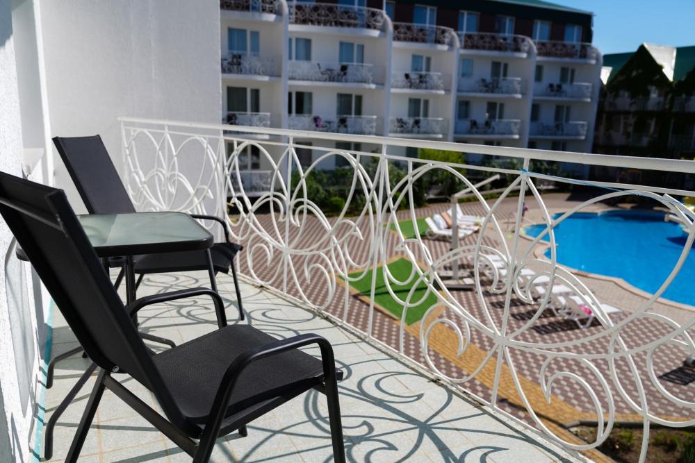 Номер оборудован кондиционером, телевизором, холодильником. В номерах есть балконы с видом на бассейн. Удобства номера: Wi-fi, холодильник, телевизор, кондиционер, душ. Кровати: 2 односпальных, 1 двуспальная