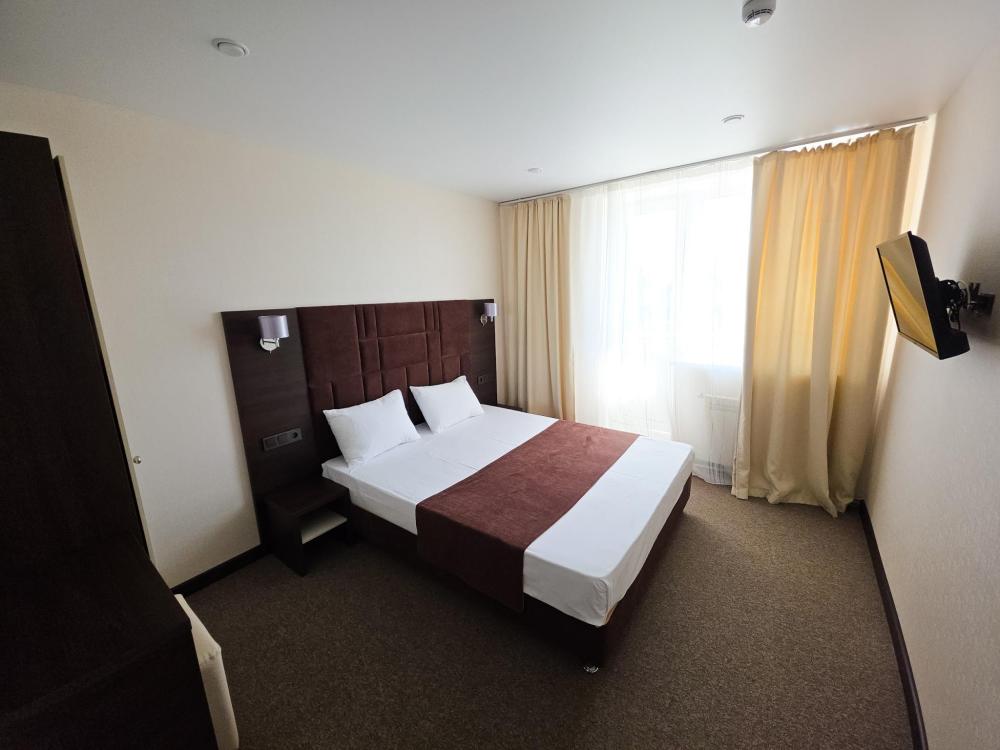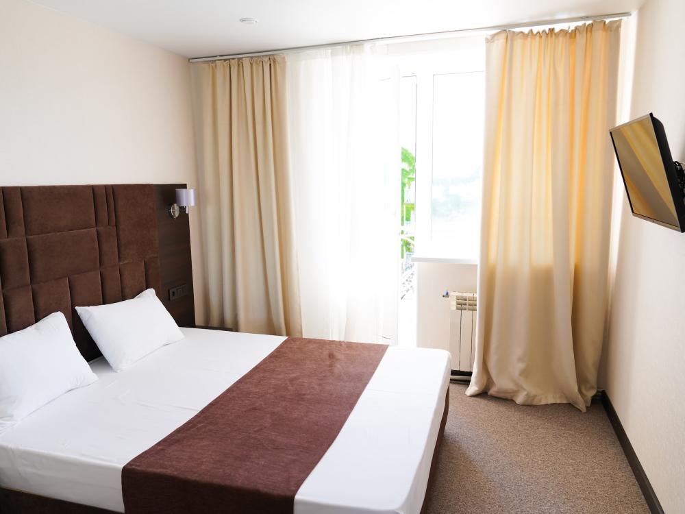 Просторный однокомнатный номер представлен элегантной спальной зоной с двуспальной кроватью, гостиной зоной с комфортабельным диваном — идеальное сочетание для ценителей уюта и комфорта. Номера идеально подходят для семейного отдыха и длительного пребывания в нашем отеле. Все номера данной категории имеют выход на балкон, с которого открывается великолепный вид на внутренний двор отеля и бассейн. Для Вашего комфорта балкон оснащен столом и стульями.