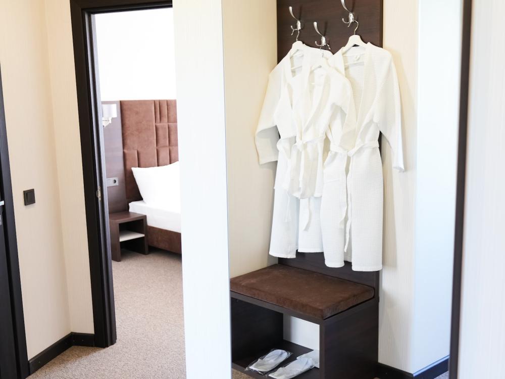 Просторный двухкомнатный номер представлен спальней комнатой с двуспальной кроватью, гостиной с комфортабельным диваном и креслом кроватью — идеальное сочетание для ценителей уюта и комфорта. Номера идеально подходят для семейного отдыха и длительного пребывания в нашем отеле. Все номера данной категории имеют выход на балкон, с которого открывается великолепный вид на внутренний двор отеля и бассейн. Для Вашего комфорта балкон оснащен столом и стульями.