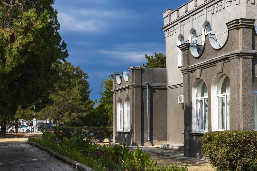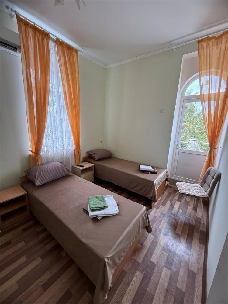Номер трехместный однокомнатный или двухкомнатный без удобств в корпусе номер 8 (замок). Удобства на блок (на 2 номера) в коридоре между номерами (душ,туалет,умывальник). Так же в холле корпуса-замка есть гладильная комната. В номере есть вся необходимая гостиничная мебель, телевизор с плоским экраном и кондиционер. На всей территории корпуса работает бесплатный WI-FI.