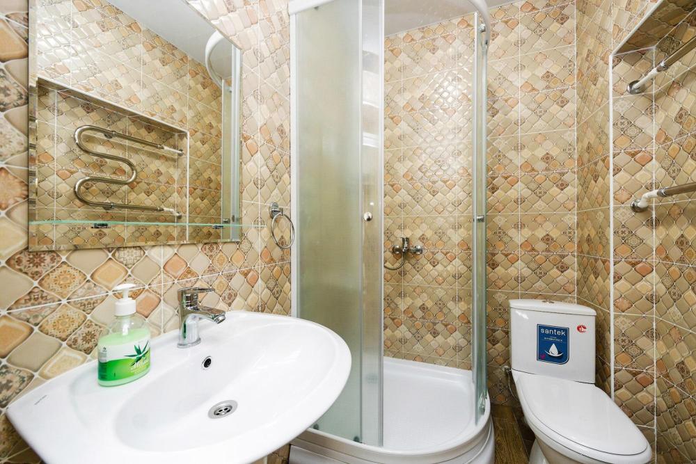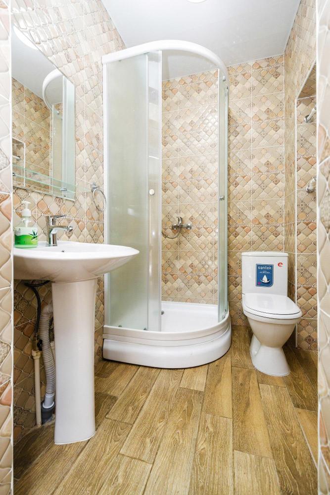 Номера оборудованы:1 двуспальной кроватью и 1 односпальной кроватью, кондиционером, телевизором, холодильником, комплектом гостиничной мебели; Санузел: туалет, умывальник, душ; В санузле имеются: мыло, туалетная бумага;