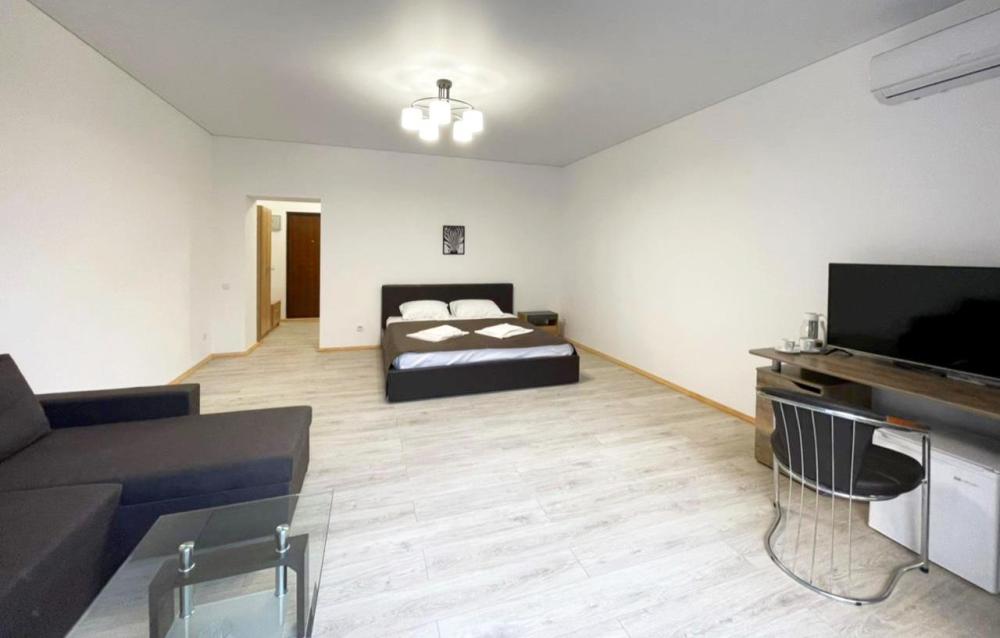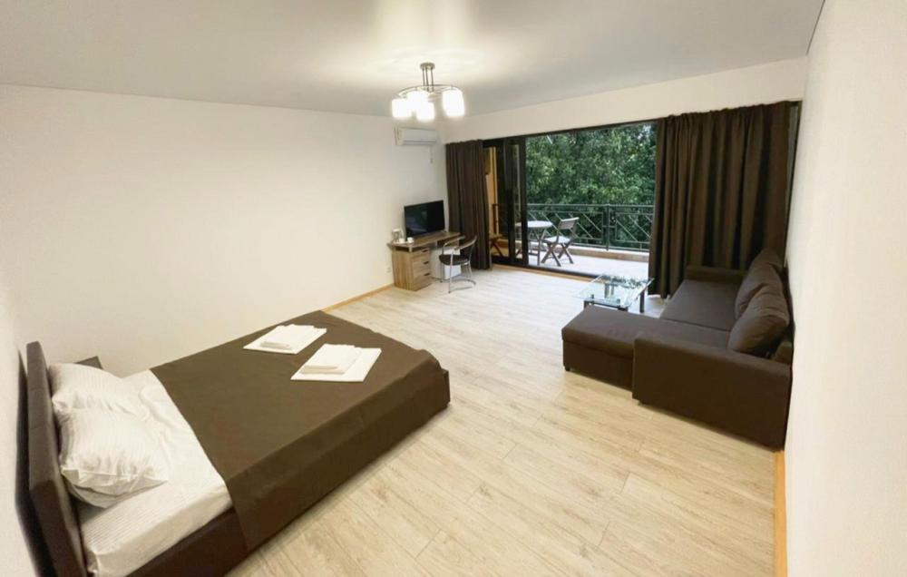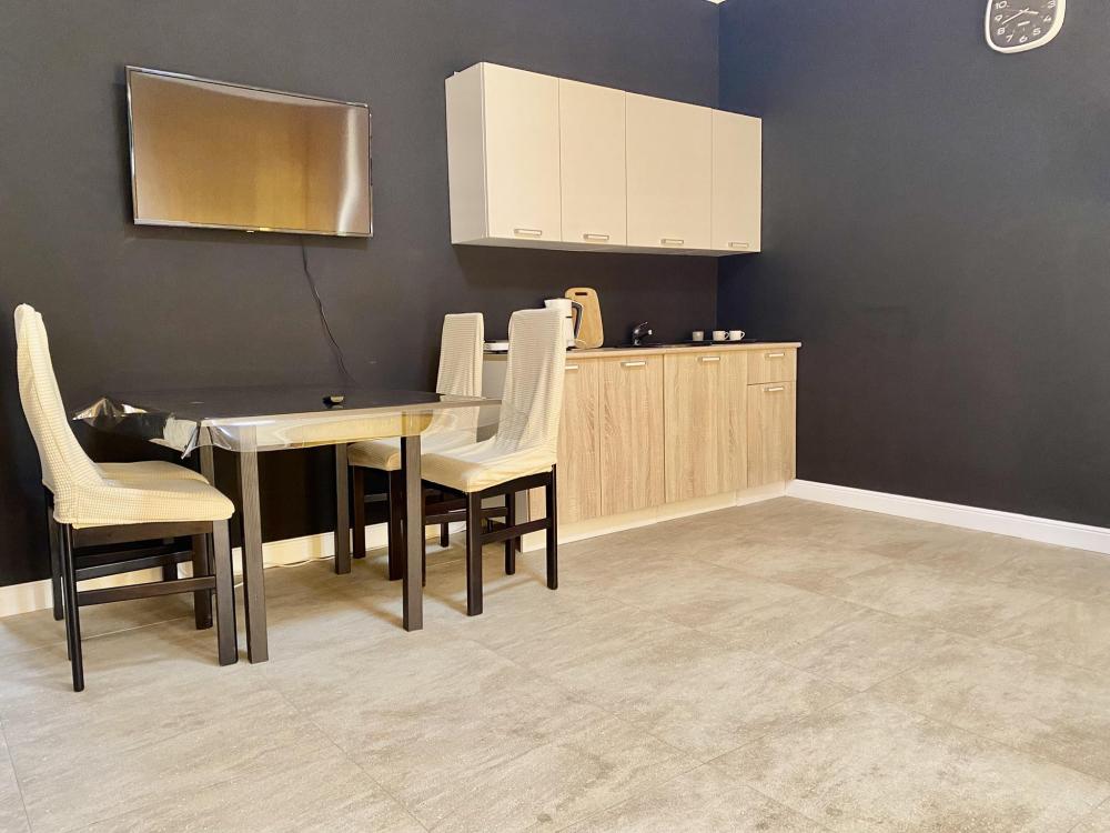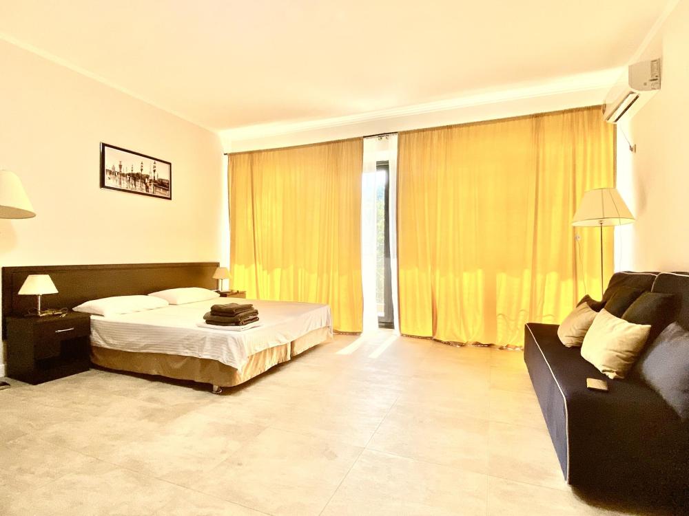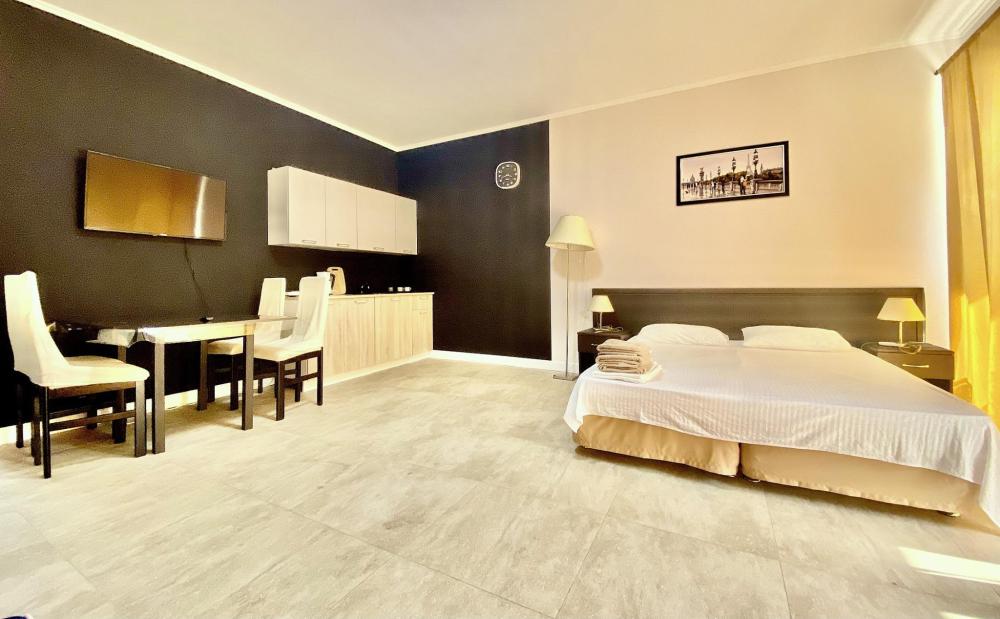 Апартаменты-студия — (вместимость до 5 человек) — в номере своя кухня (варочная панель, холодильник, чайник, посуда), кабельное тв, сушилка для белья, фен, кондиционер.
