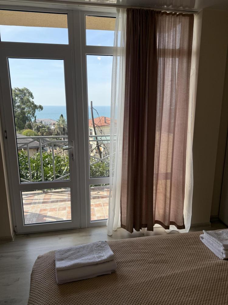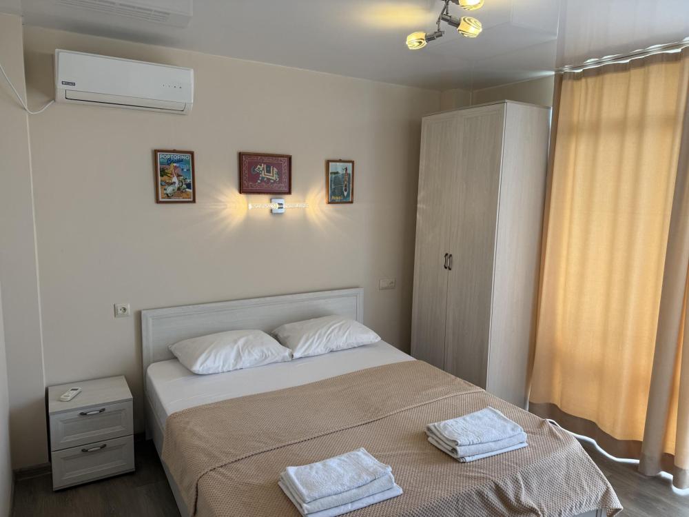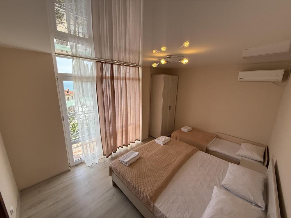 Стандартный четырехместный номер. В номере двуспальная кровать и две односпальные кондиционер, шкаф, собственная ванная комната. Выход на балкон с видом на море и горы.