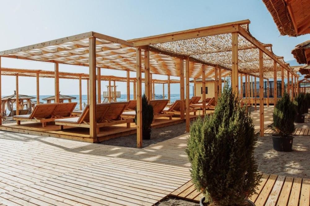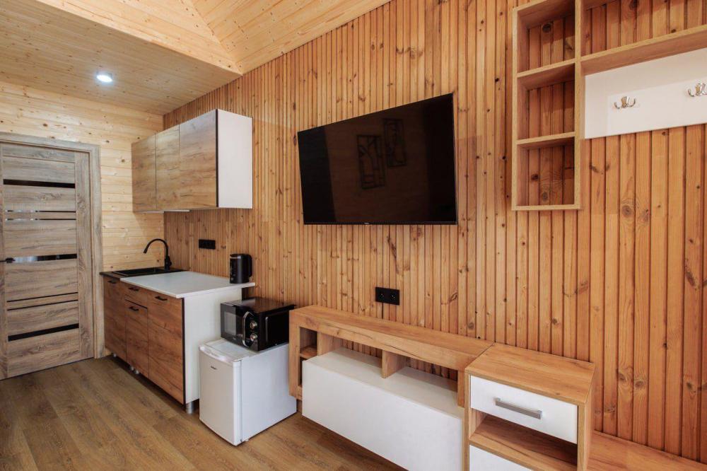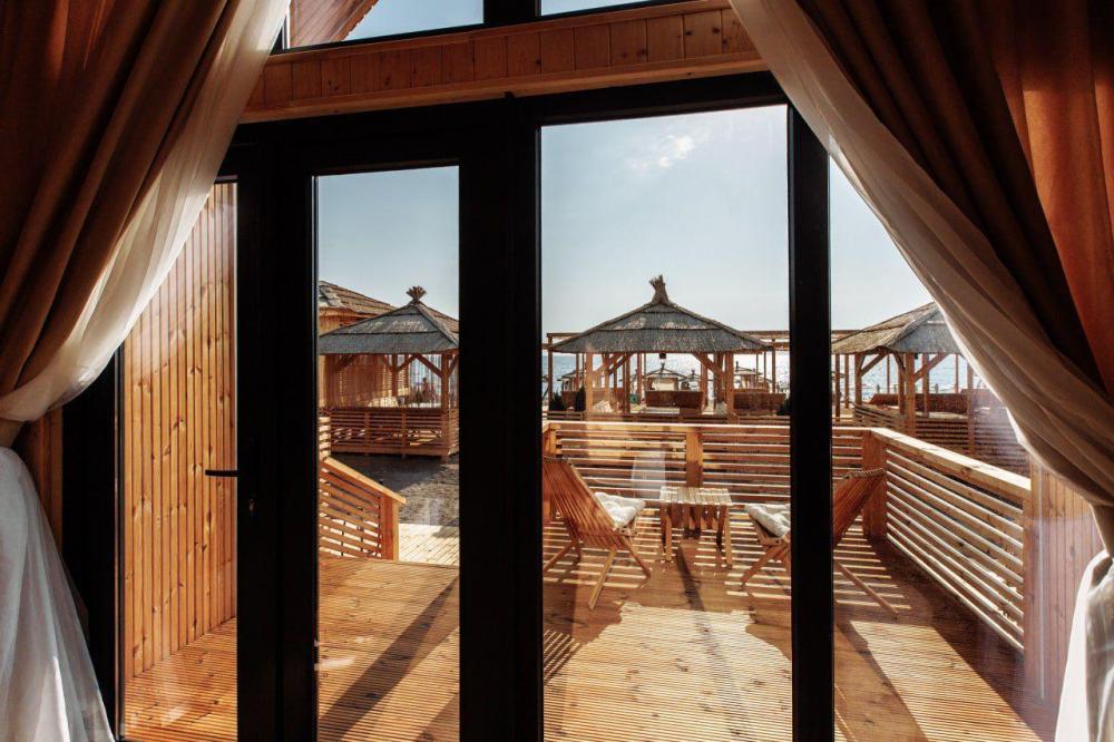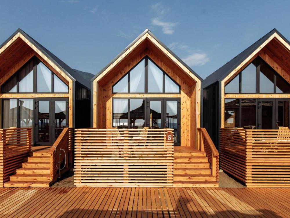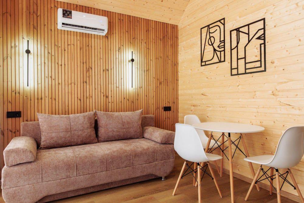 Уютный деревянный коттедж с панорамными окнами и прямым выходом на террасу — идеальное место для отдыха у моря. Интерьер выполнен в современном эко-стиле с акцентом на натуральные материалы и тёплые тона древесины. Удобства в номере: отдельная спальня с комфортной двуспальной кроватью, кондиционером и мягким освещением; просторная зона отдыха с диваном, обеденным столом, телевизором со Smart TV и кондиционером; полностью оборудованная кухня (холодильник, микроволновка, чайник, мойка, индукционная плита, столовые приборы и посуда); современная ванная комната с душевой зоной «тропический дождь» и гигиеническими принадлежностями. Предоставляются пляжные полотенца, халаты и тапочки; стильная терраса с мебелью для отдыха на свежем воздухе; вид на море или на горы.