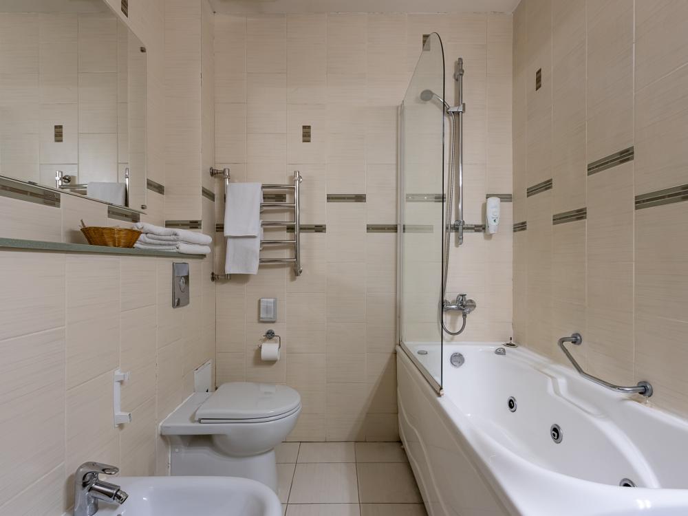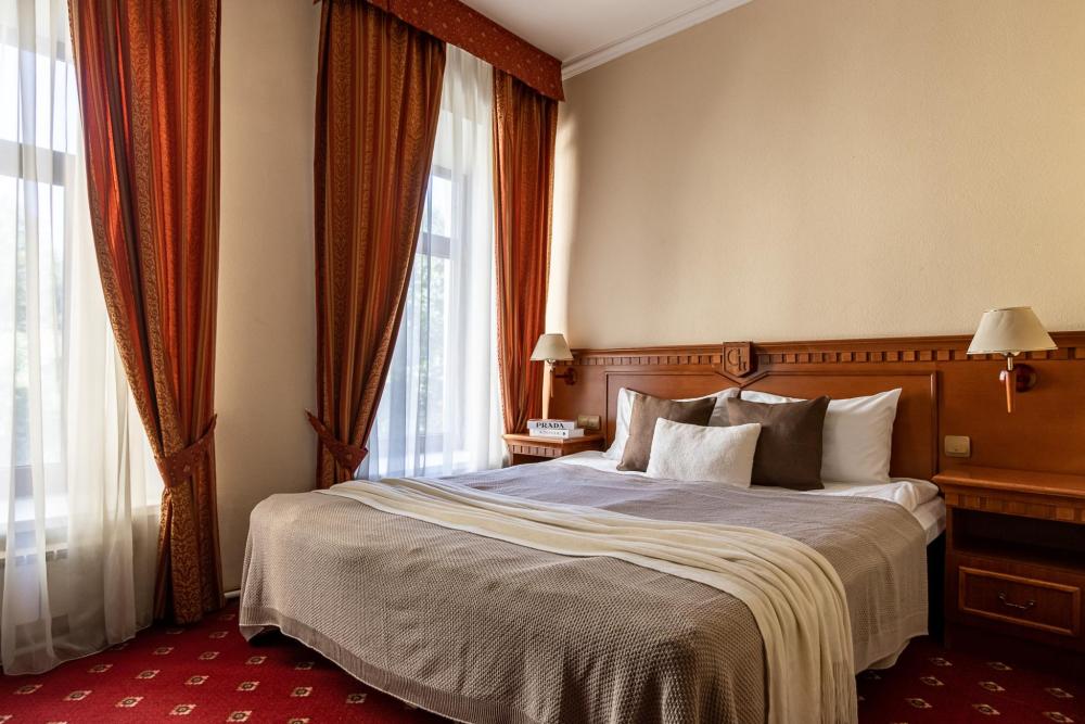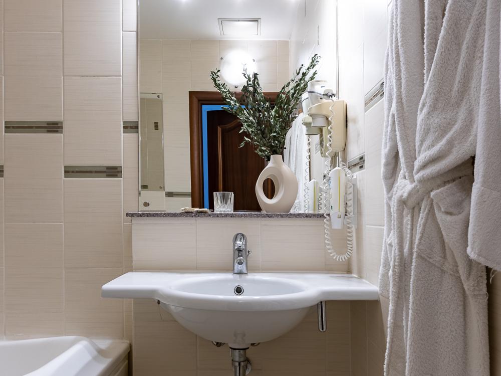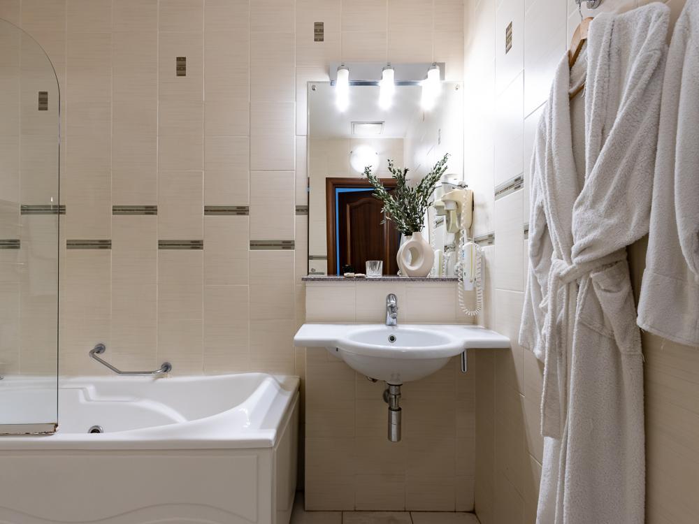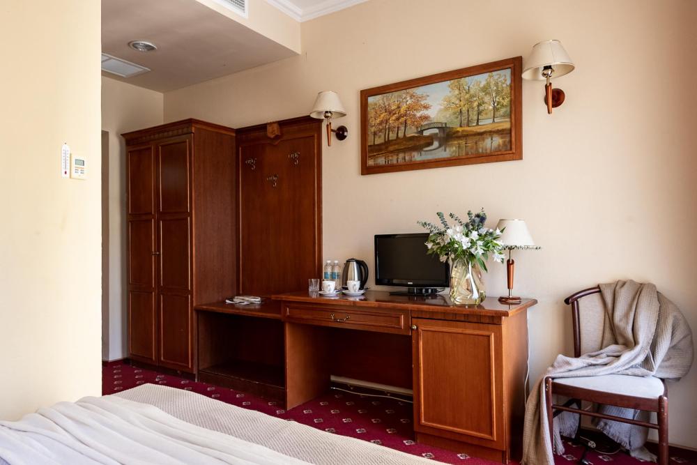 В номерах этой категории у нас есть две односпальные кровати, сдвинутые вместе, которые образуют одну большую двуспальную кровать. Двуспальная кровать только в люксах и полулюксах. К услугам гостей телевизор, телефон и бесплатный Wi-Fi. В ванной комнате также есть фен и средства личной гигиены.