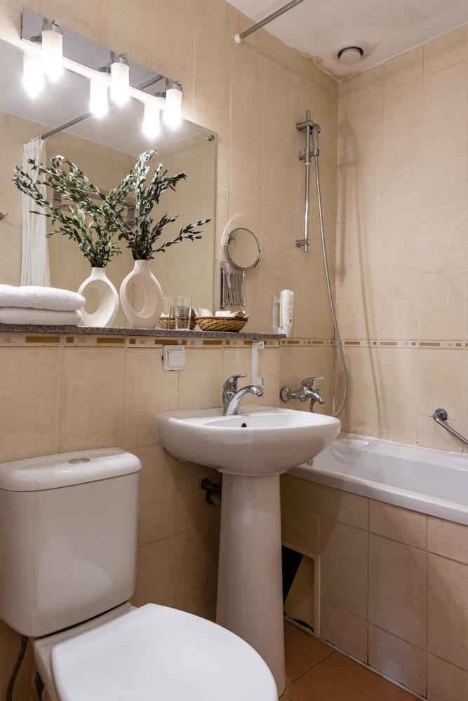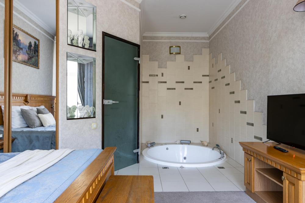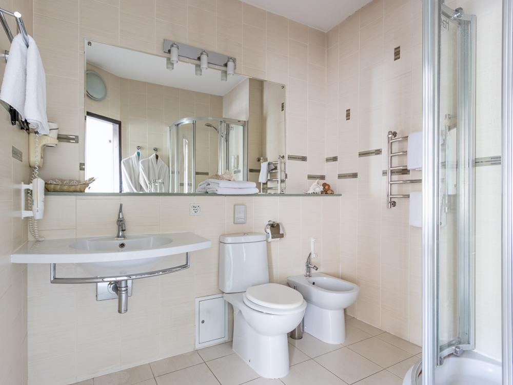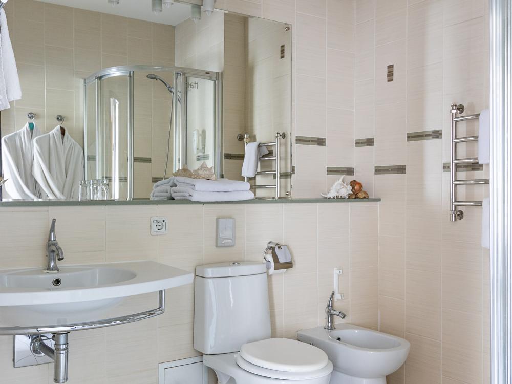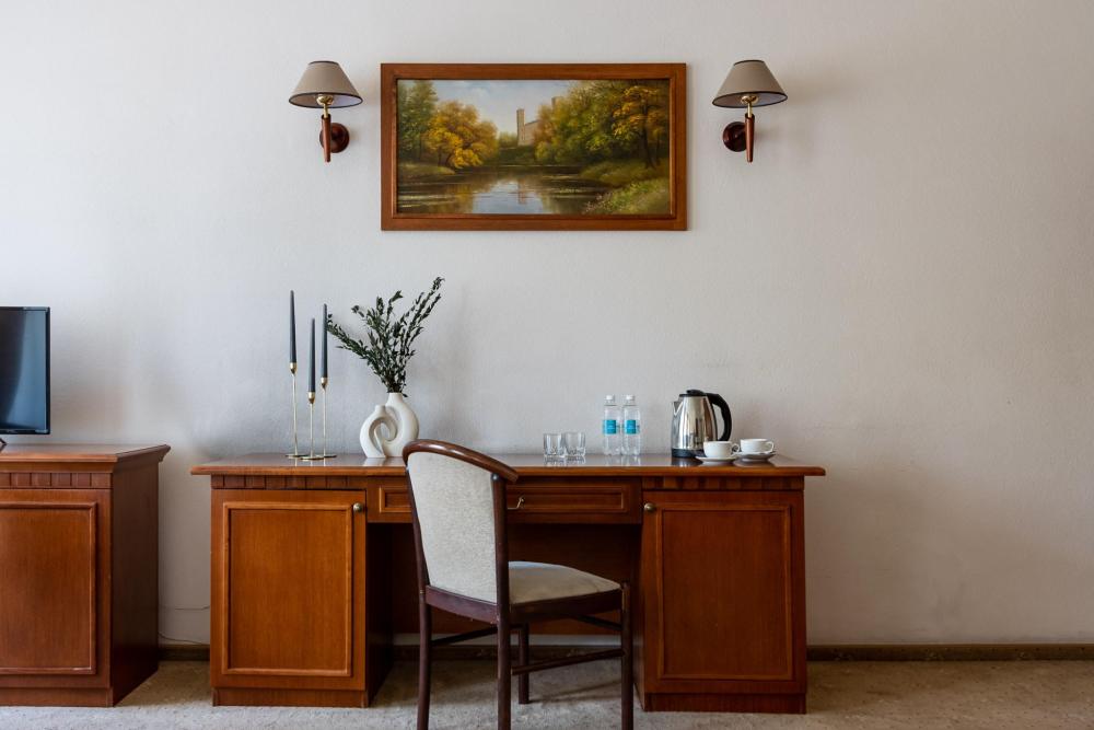 В номерах этой категории у нас есть две односпальные кровати, сдвинутые вместе, которые образуют одну большую двуспальную кровать. Двуспальная кровать только в люксах и полулюксах. К услугам гостей телевизор, телефон и бесплатный Wi-Fi. В ванной комнате также есть фен и средства личной гигиены.