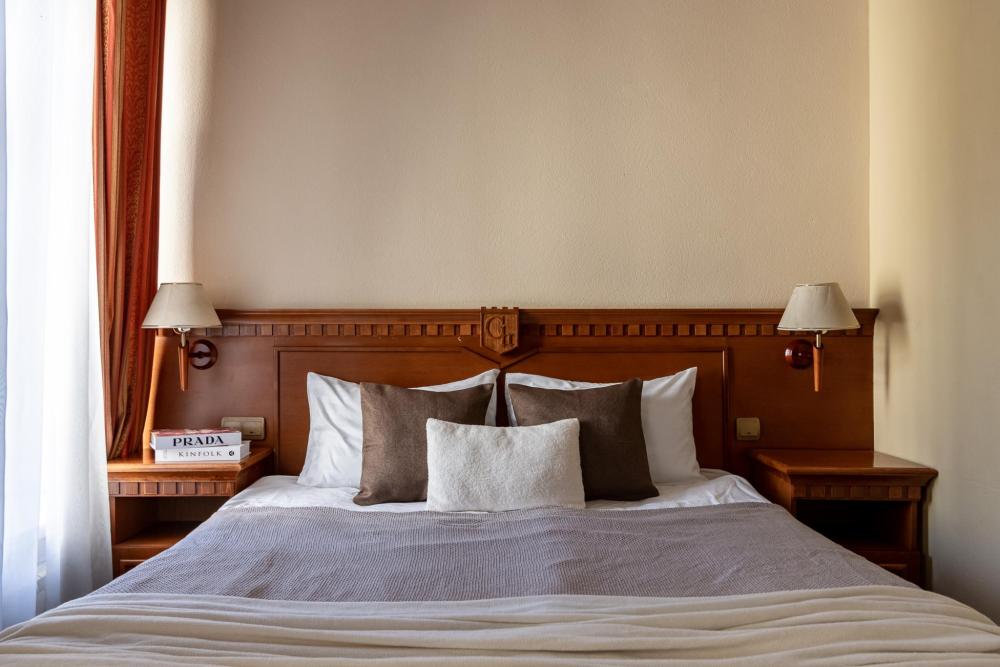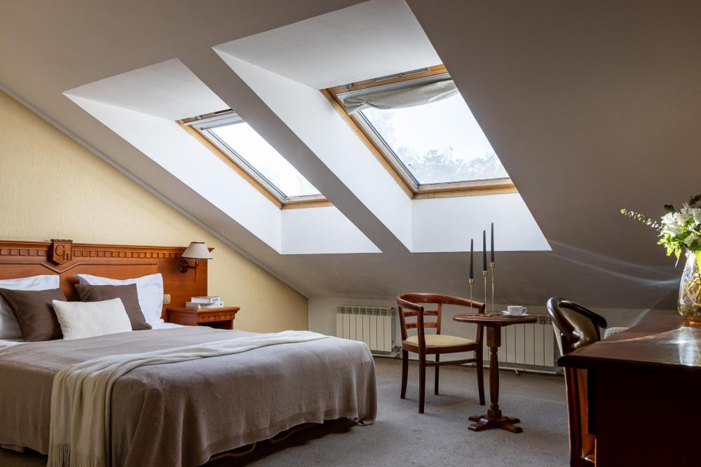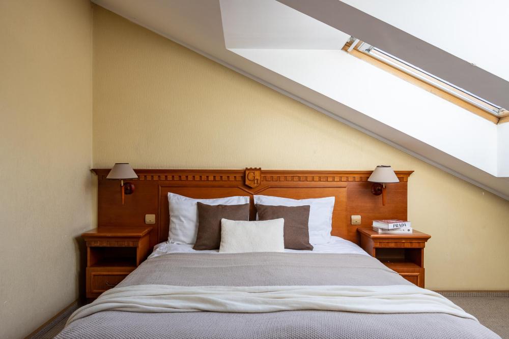Светлые, просторные мансардные номера категории «Стандарт», площадью 24-28 м² , создают особое ощущение комфорта и уюта. Внутренняя отделка выполнена в спокойных пастельных тонах. Номера этой категории не отличаются от стандартных по площади и комплектации, их особенность — мансардные окна, которые создают более камерную и романтичную атмосферу.