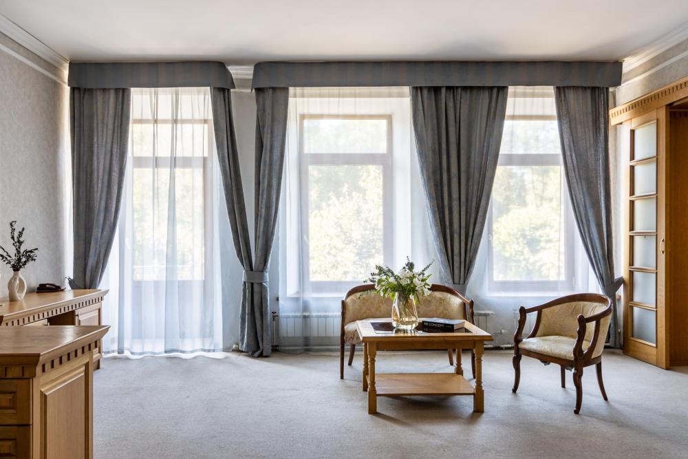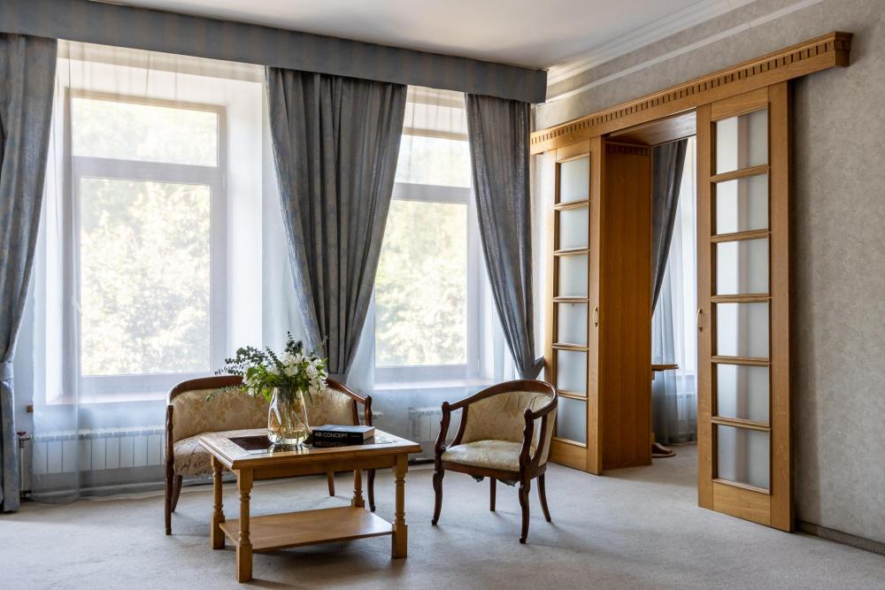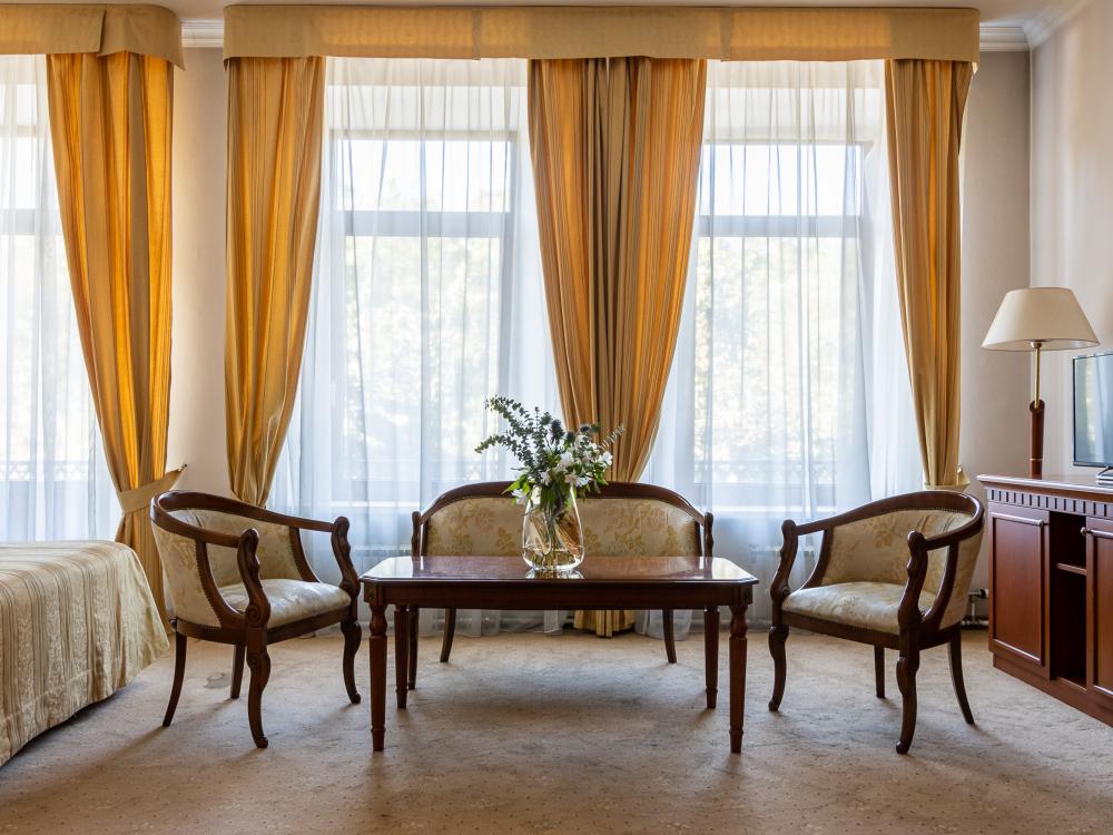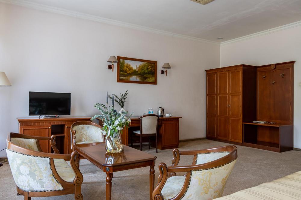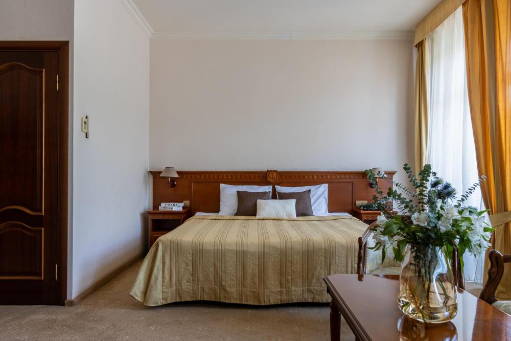 Из окон номера Сьют открывается панорамный вод на парк. Просторный и светлый номер, условно разделенный на гостиную и спальную зоны. К услугами гостей большая двуспальная кровать, кондиционер, телевизор, телефон и холодильник. В ванной комнате установлена ванная, предоставляются халаты, тапочки и комплект полотенец.