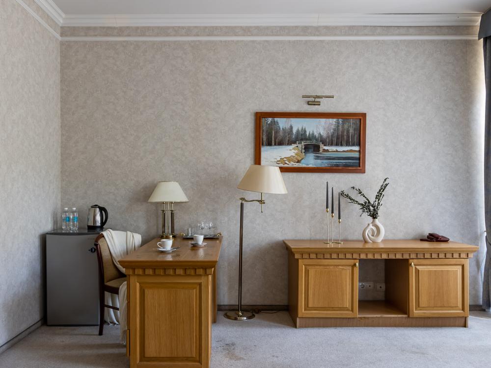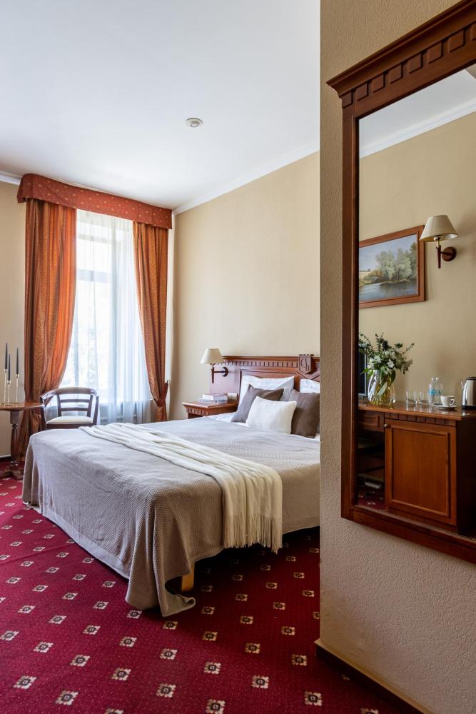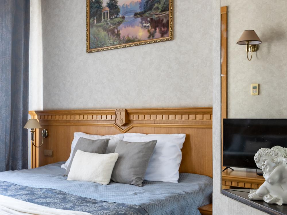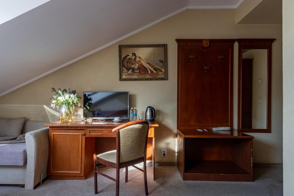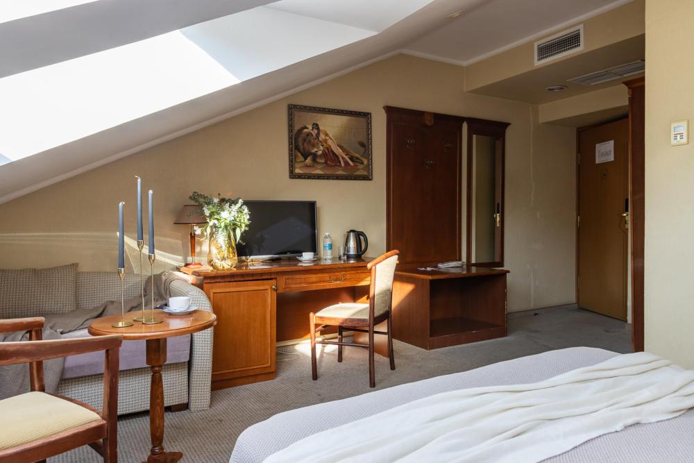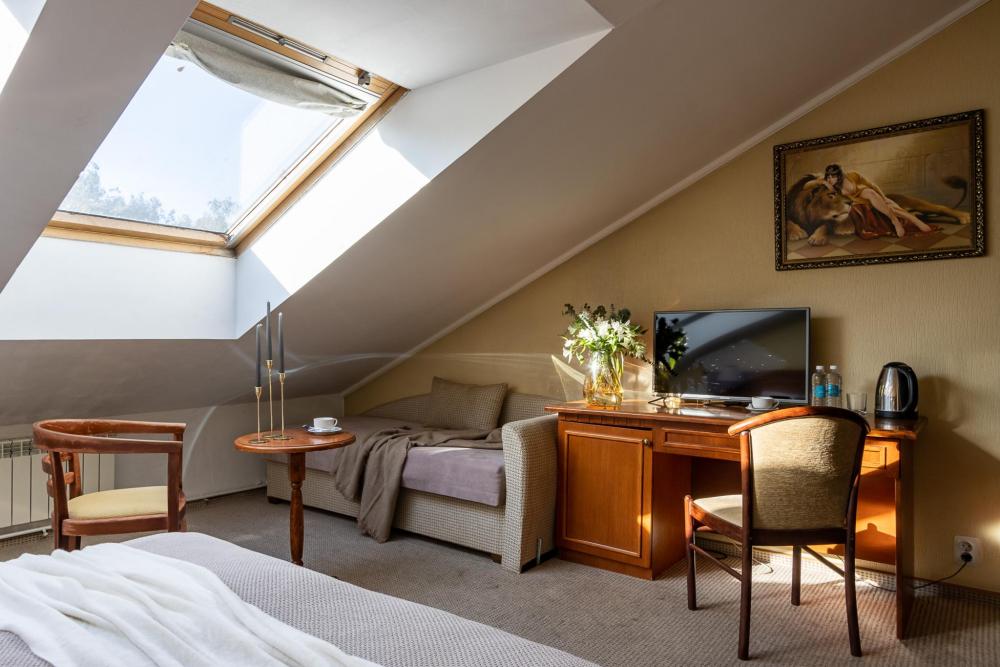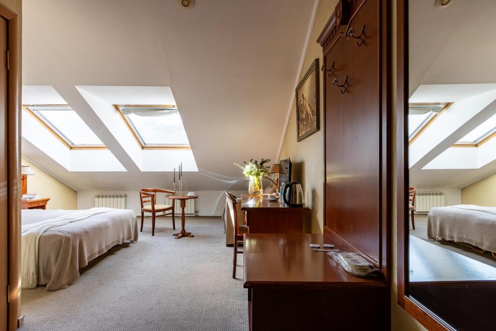 Просторные номера категории «Стандарт+», площадью 27 м², условно разделены на гостиную и спальню. Особенность — мансардные окна, которые создают более камерную и романтичную атмосферу. Рабочее место хорошо оборудовано – письменный стол, настольная лампа, продуманное расположение и число розеток. Номер декорирован произведениями живописи с изображением красивых уголков Гатчины, элегантное оформление интерьера создает стильную атмосферу. Спокойные цвета, приятные ткани сделают отдых по-настоящему комфортным.