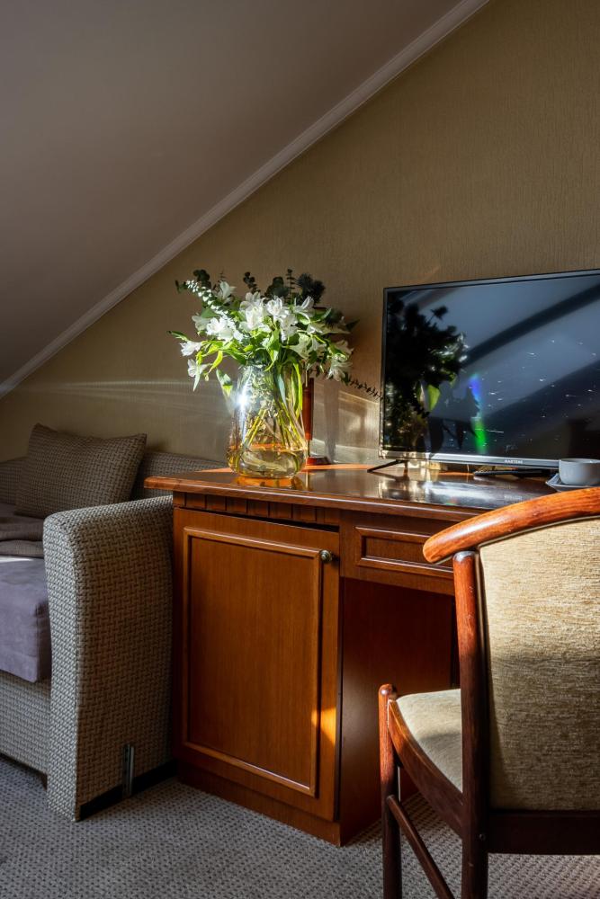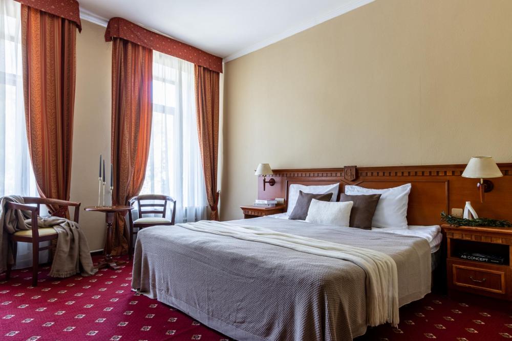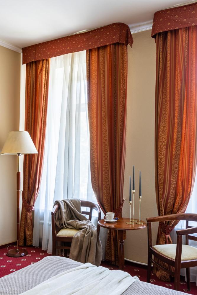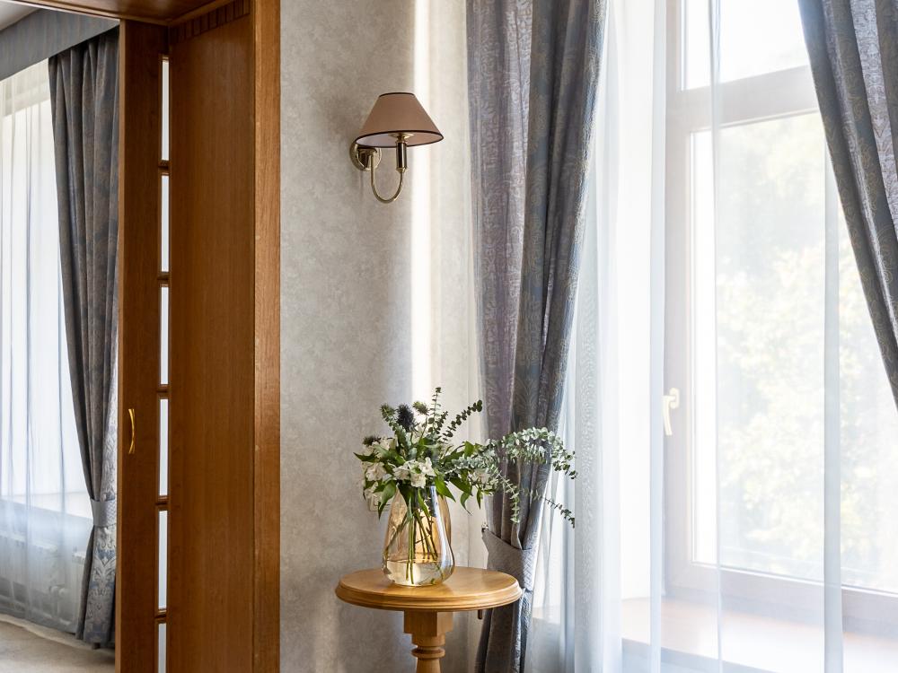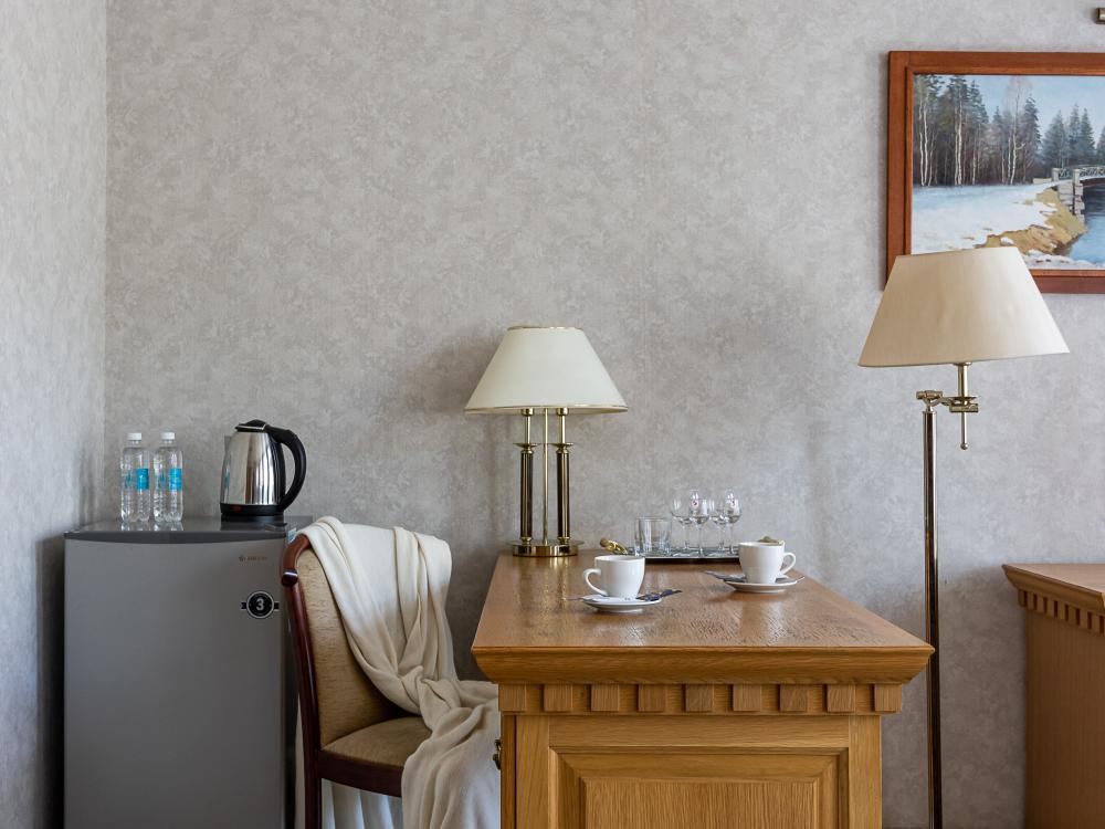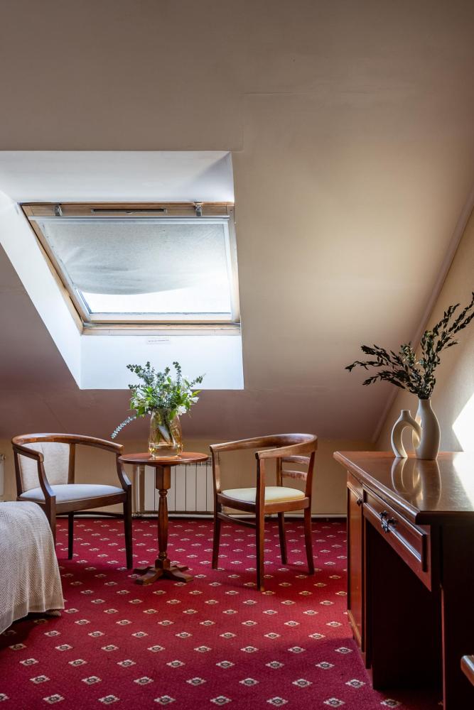 Просторные номера категории «Стандарт+», площадью 27 м², условно разделены на гостиную и спальню. Особенность — мансардные окна, которые создают более камерную и романтичную атмосферу. Рабочее место хорошо оборудовано – письменный стол, настольная лампа, продуманное расположение и число розеток. Номер декорирован произведениями живописи с изображением красивых уголков Гатчины, элегантное оформление интерьера создает стильную атмосферу. Спокойные цвета, приятные ткани сделают отдых по-настоящему комфортным.