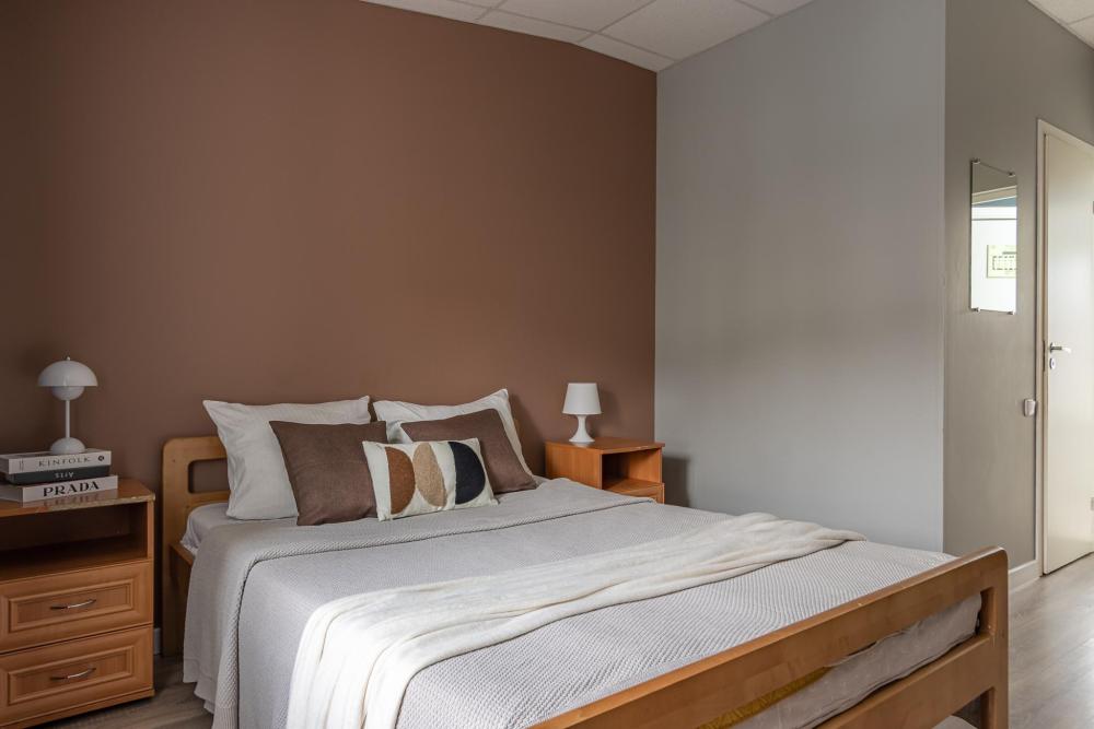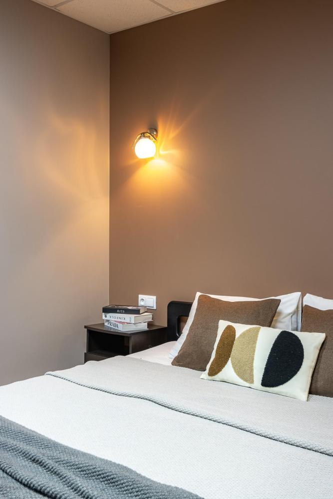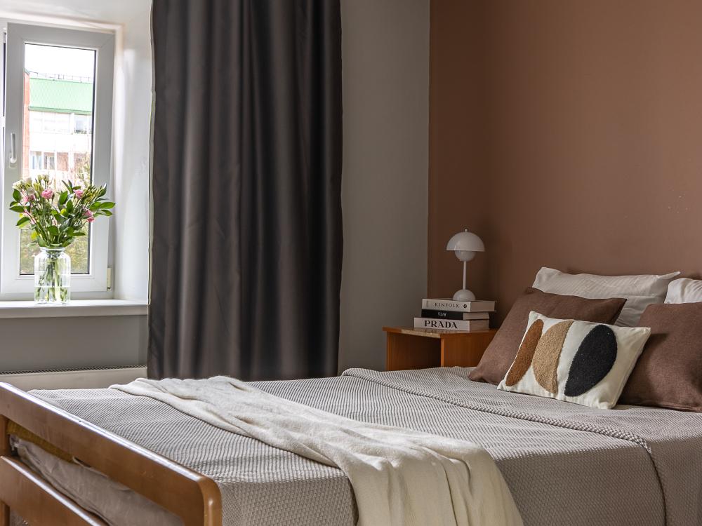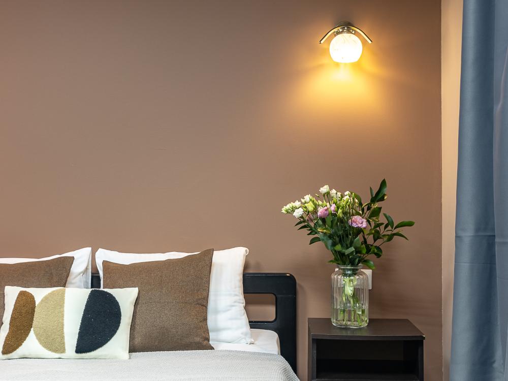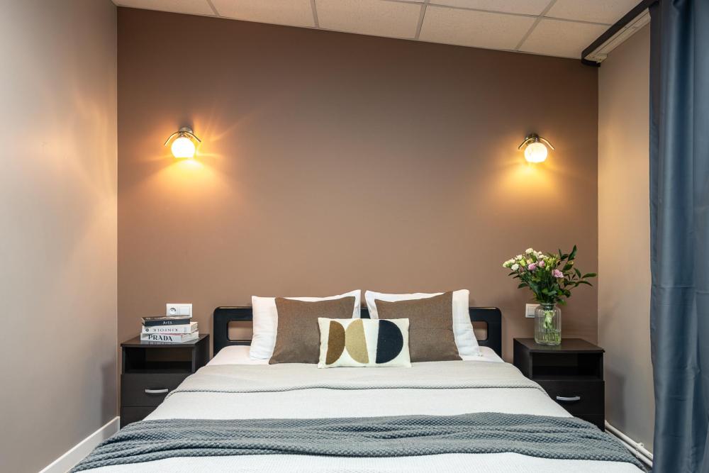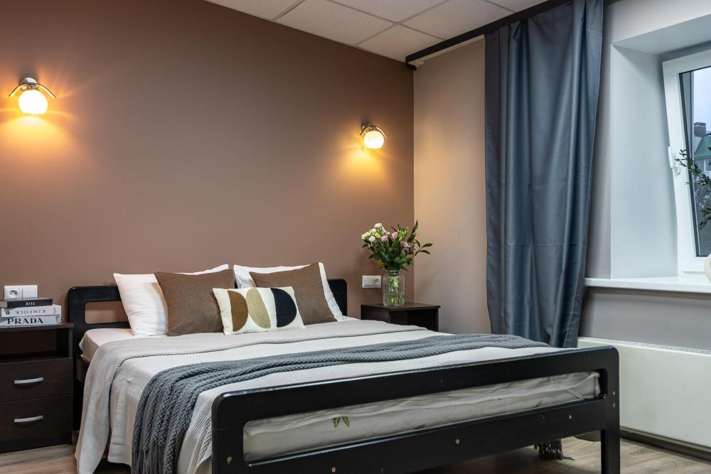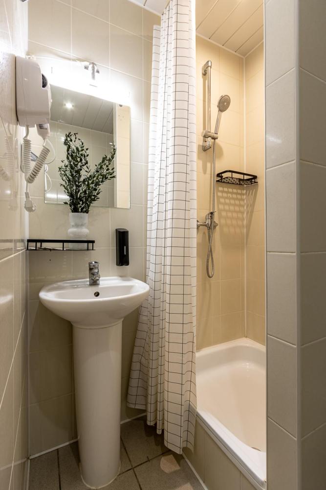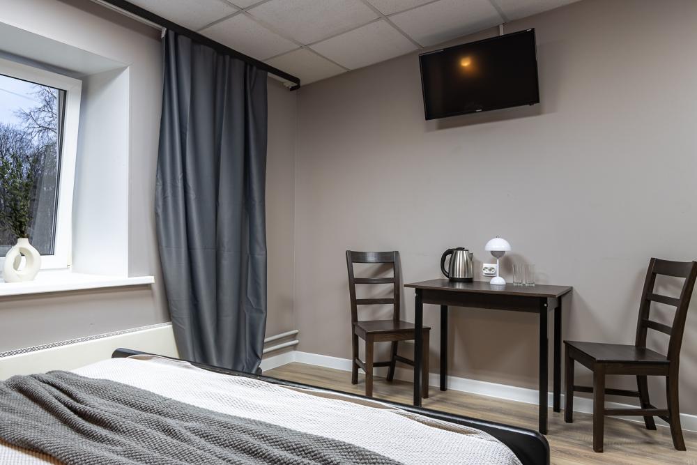 Номер оснащен: двуспальной кроватью, двумя тумбочками, шкафом двухстворчатым, столом, двумя стульями, двумя настенными светильниками, двумя прикроватными ковриками, телевизор, зеркало, чайные принадлежности. Подставка для обуви, рожок для обуви. Санузел: совмещенный - душ/туалет, индивидуальные принадлежности, полотенца, тапочки (по запросу). Основное освещение - потолочные лампы, пол - кафельная плитка. Вид на жилые дома.