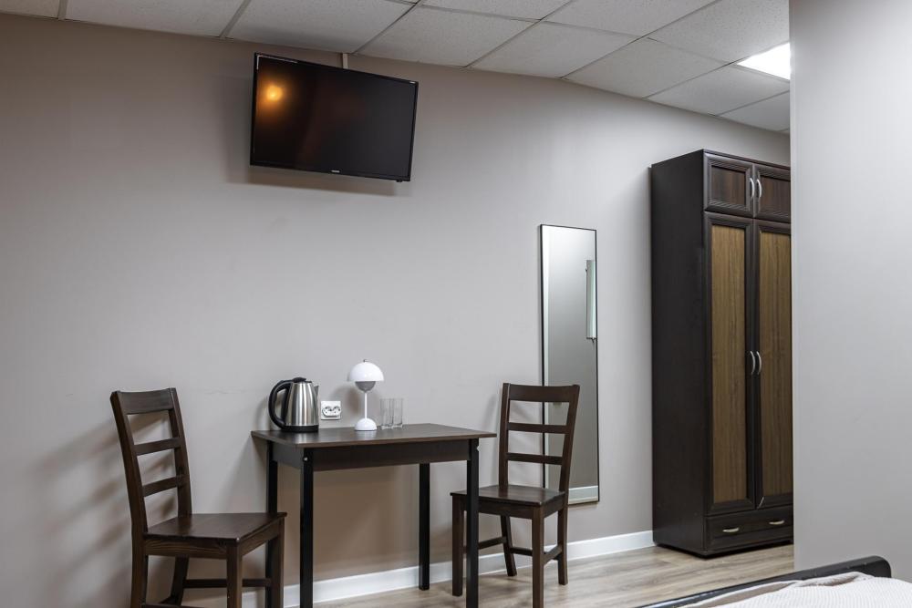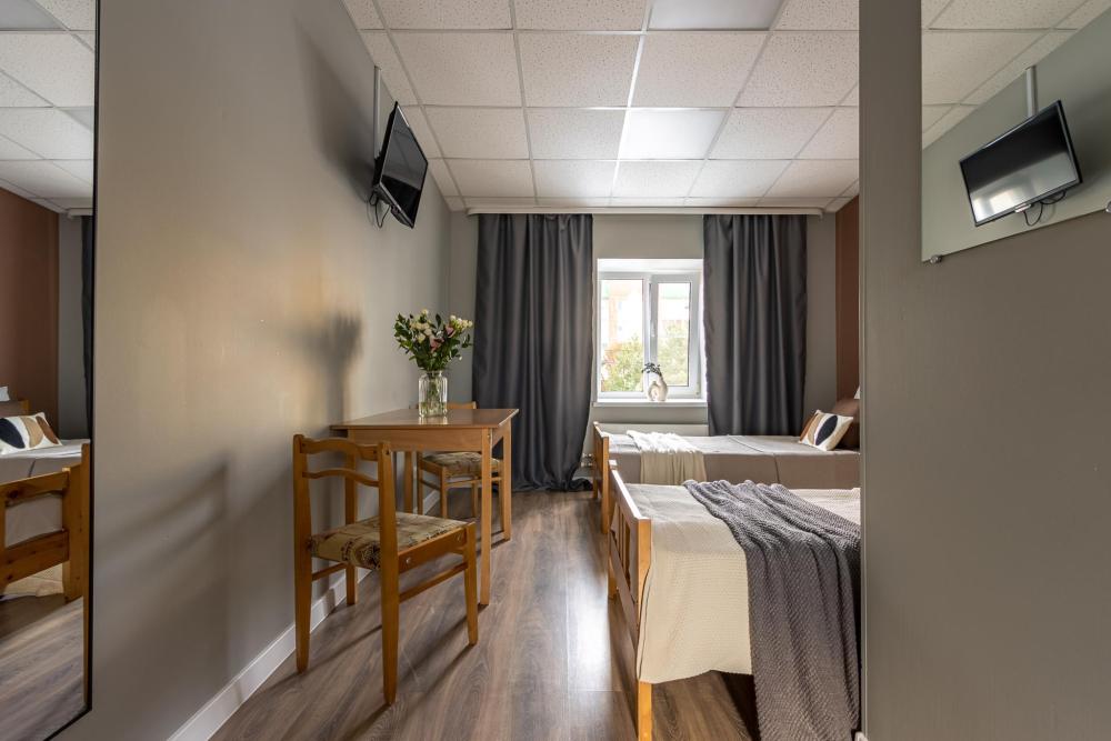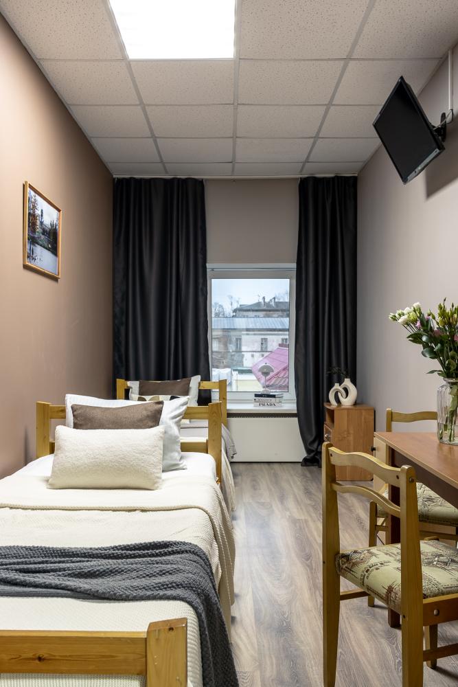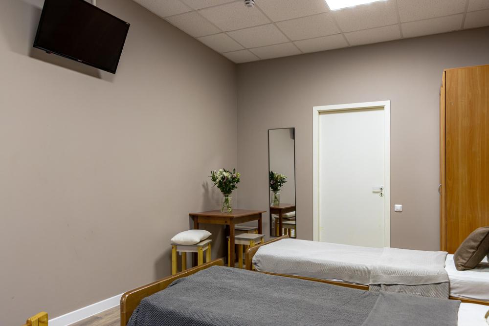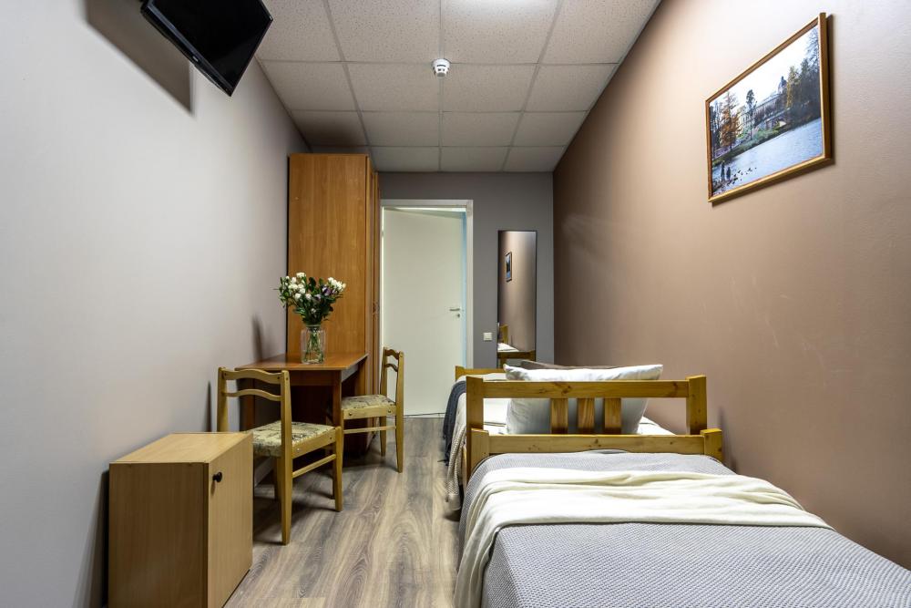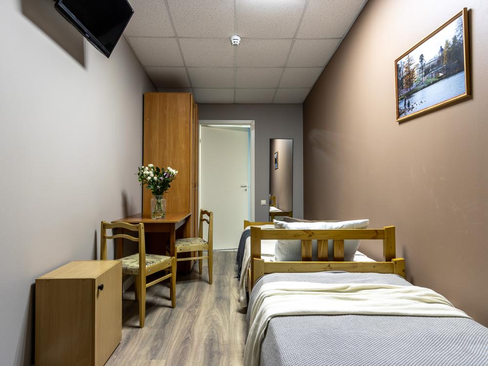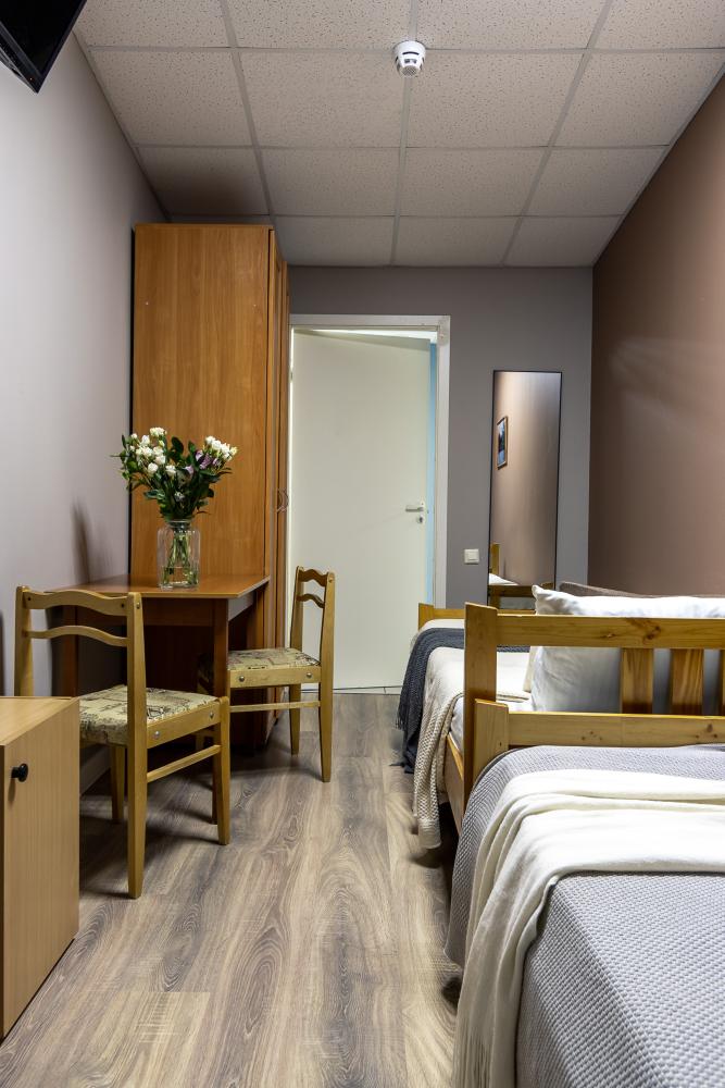 Номер стандарт двухместный с частичными удобствами: двумя 1,5 сп. кроватями кроватями, двумя тумбочками, шкафом двухстворчатым, столом, двумя стульями. Основное освещение - потолочные лампы, пол - кафельная плитка. С общим душем и туалетом на этаже, есть небольшой бытовой уголок с микроволновкой, чайником и холодильником на этаже. Вид на магазины.