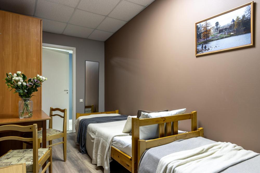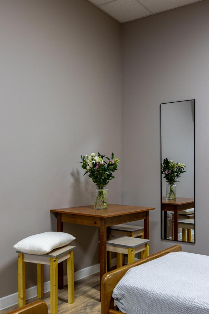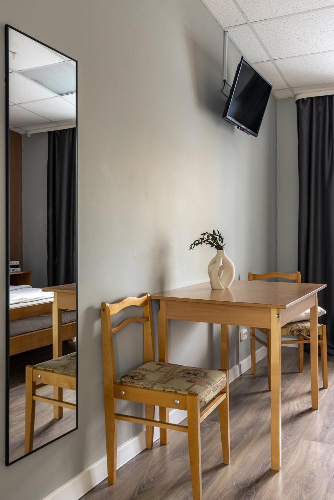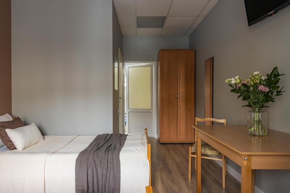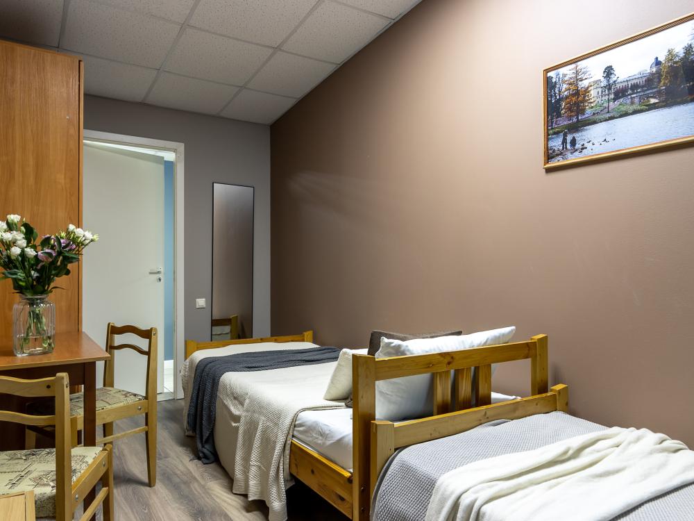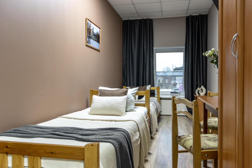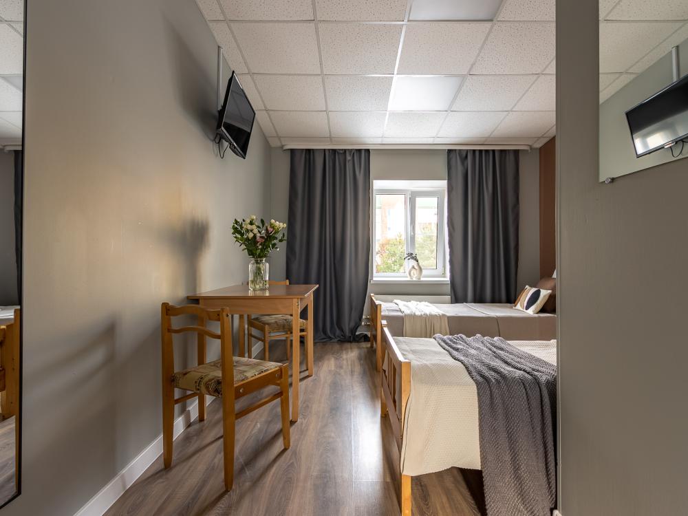 Номер стандарт двухместный с частичными удобствами: двумя 1,5 сп. кроватями кроватями, двумя тумбочками, шкафом двухстворчатым, столом, двумя стульями. Основное освещение - потолочные лампы, пол - кафельная плитка. С общим душем и туалетом на этаже, есть небольшой бытовой уголок с микроволновкой, чайником и холодильником на этаже. Вид на магазины.