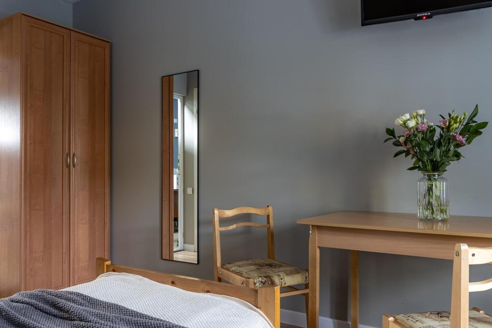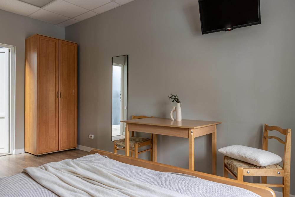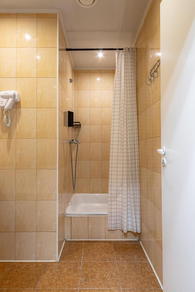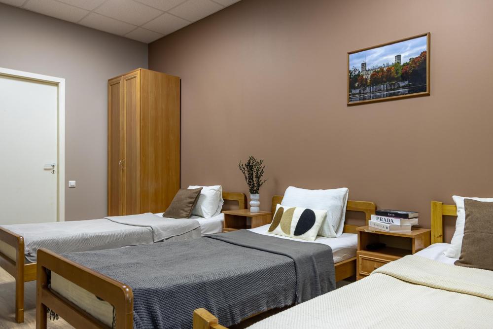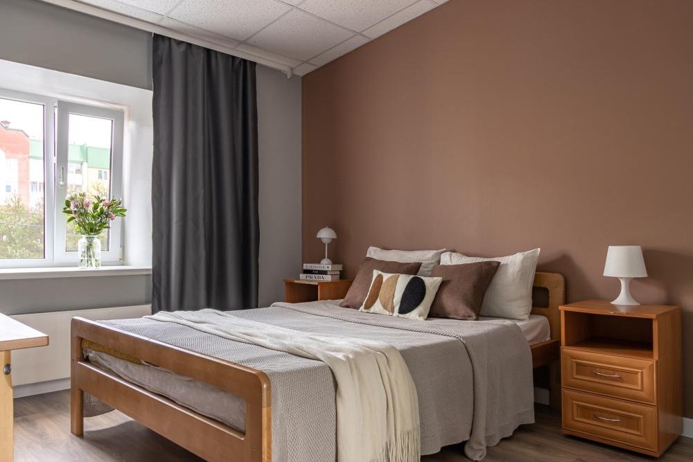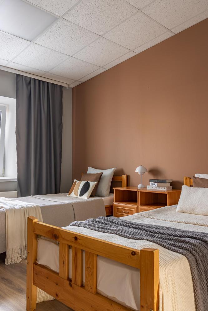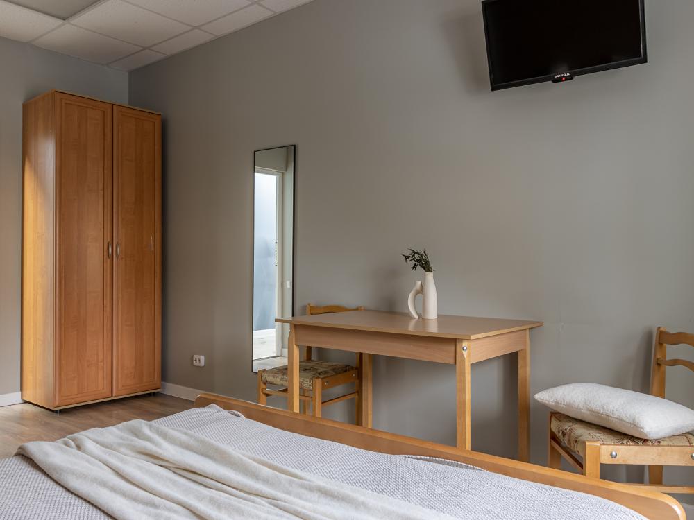 Номер стандарт двухместный с частичными удобствами: двумя 1,5 сп. кроватями кроватями, двумя тумбочками, шкафом двухстворчатым, столом, двумя стульями. Основное освещение - потолочные лампы, пол - кафельная плитка. С общим душем и туалетом на этаже, есть небольшой бытовой уголок с микроволновкой, чайником и холодильником на этаже. Вид на магазины.