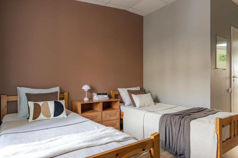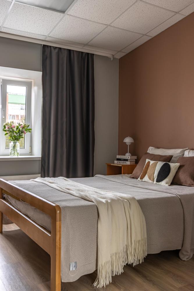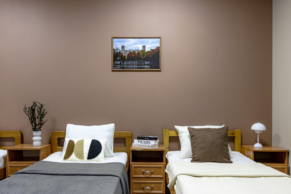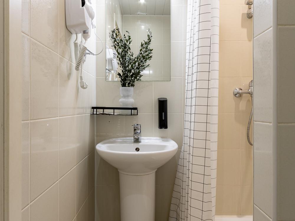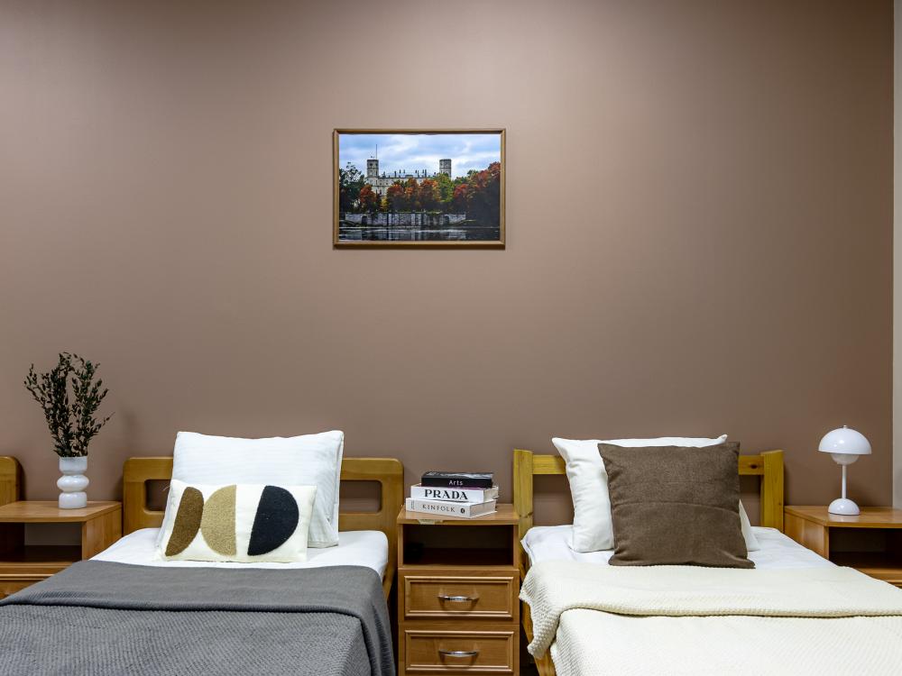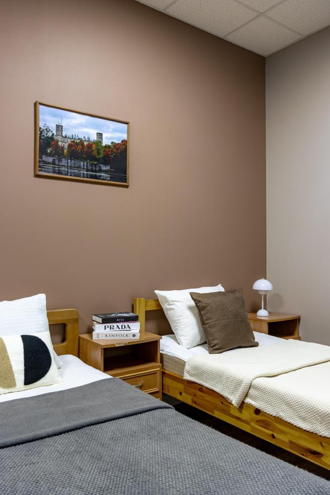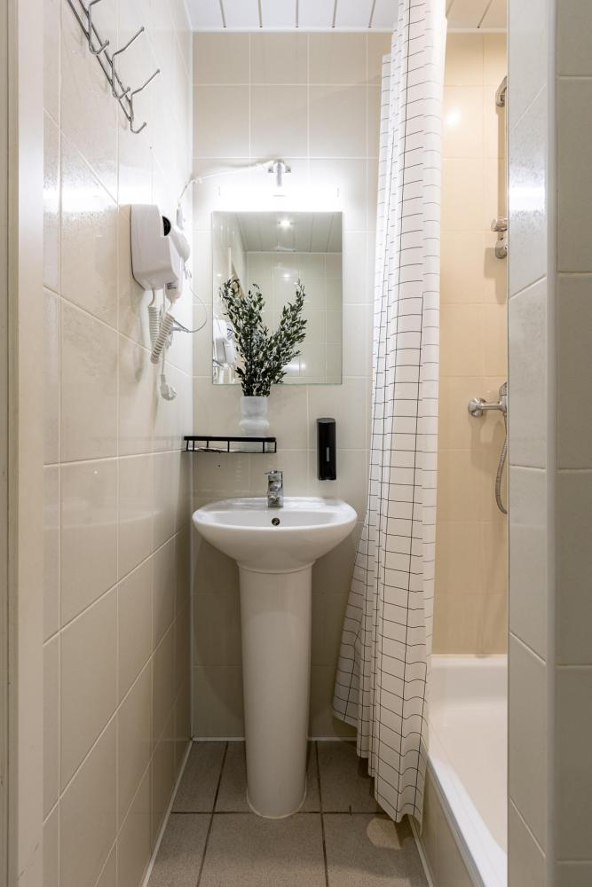 Номер стандарт двухместный с частичными удобствами: двумя 1,5 сп. кроватями кроватями, двумя тумбочками, шкафом двухстворчатым, столом, двумя стульями. Основное освещение - потолочные лампы, пол - кафельная плитка. С общим душем и туалетом на этаже, есть небольшой бытовой уголок с микроволновкой, чайником и холодильником на этаже. Вид на магазины.