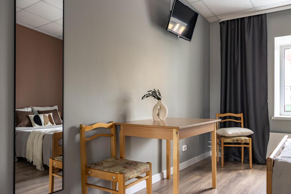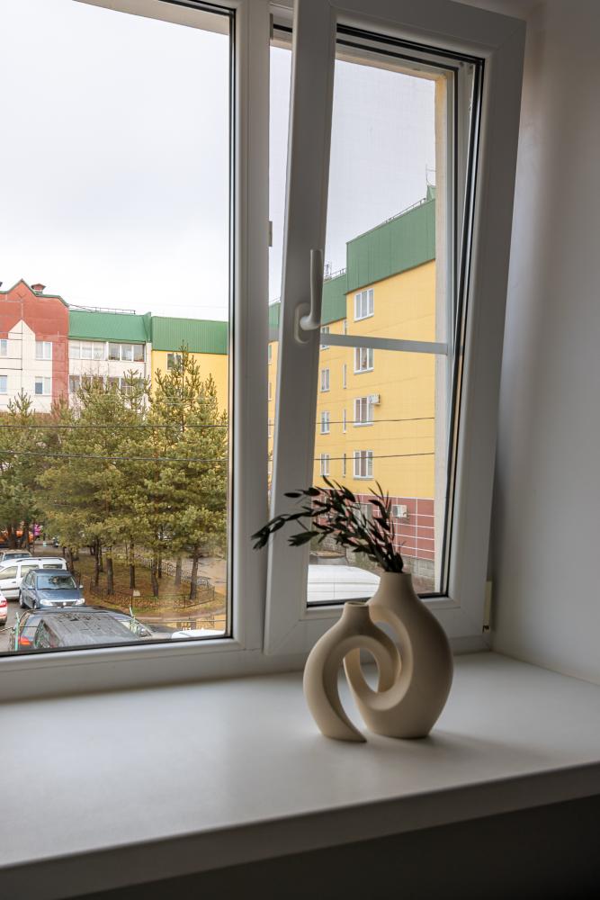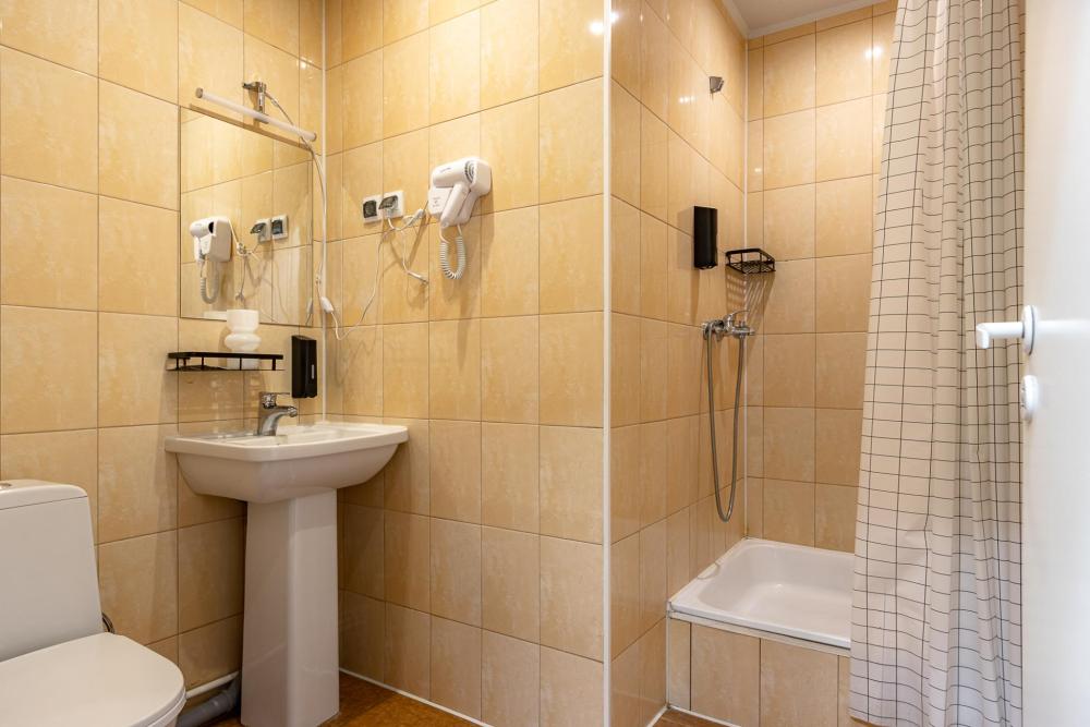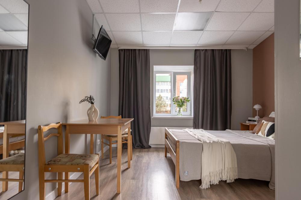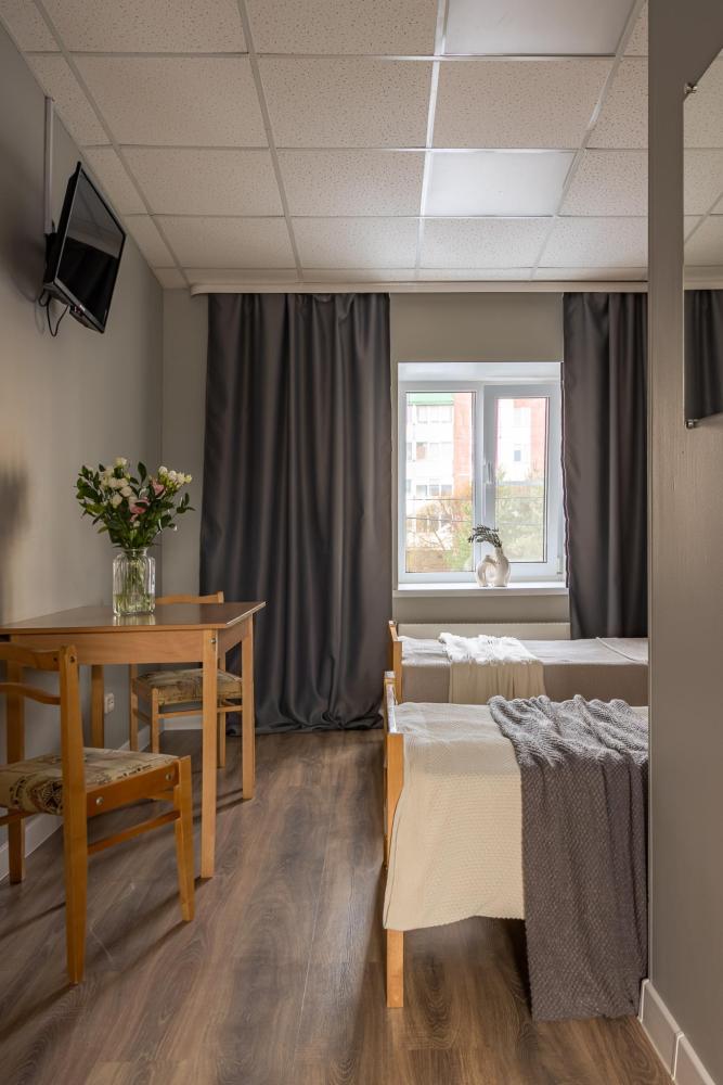 Номер улучшенный стандарт с двумя кроватями оснащен: двумя 1,5 сп. кроватями, двумя тумбочками, шкафом двухстворчатым, столом, двумя стульями, двумя прикроватными ковриками, телевизором, зеркалом. Санузел: совмещенный - душ/туалет, индивидуальные принадлежности, полотенца, тапочки можно приобрести за отдельную плату. Основное освещение - потолочные лампы, пол - кафельная плитка. Вид на жилые дома