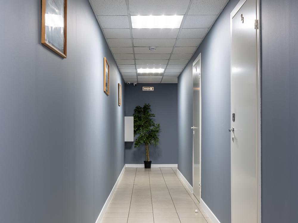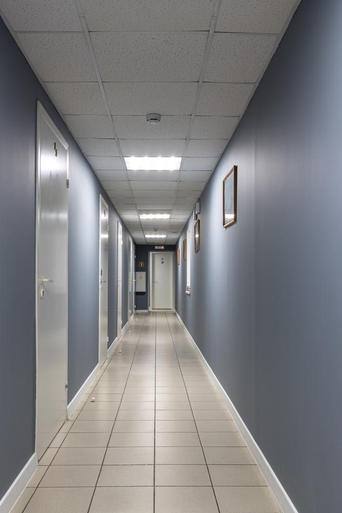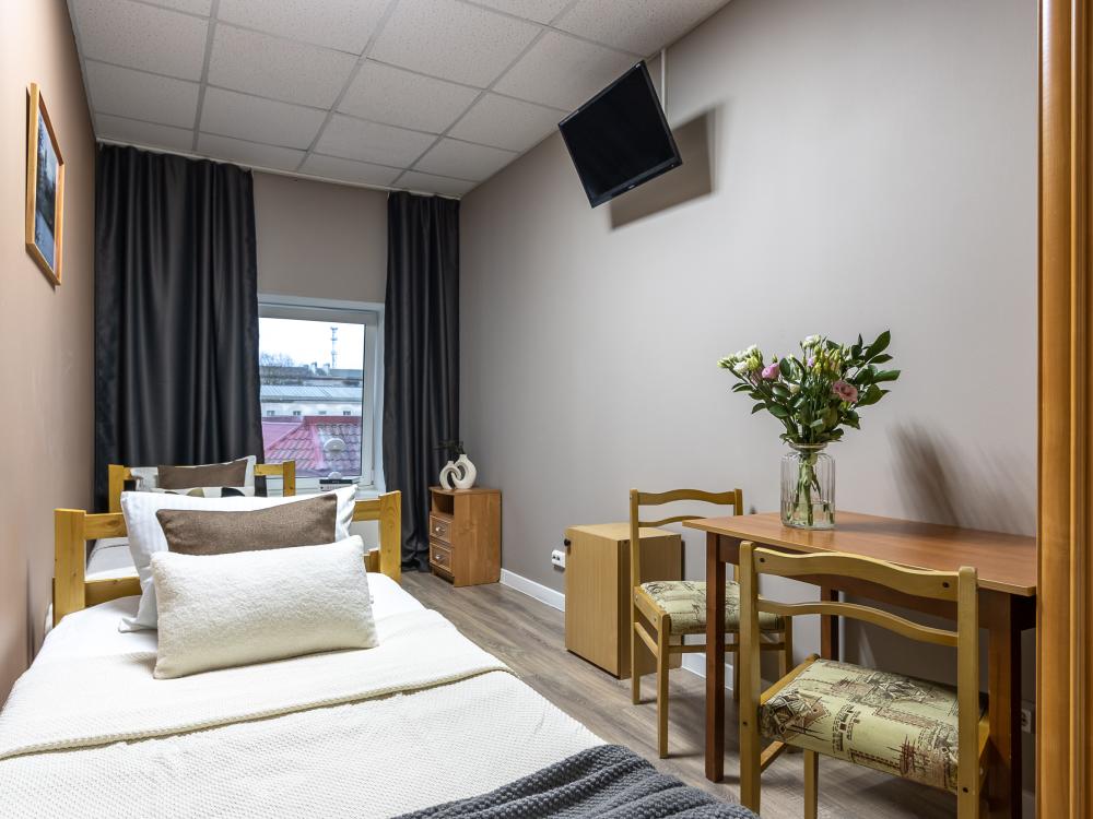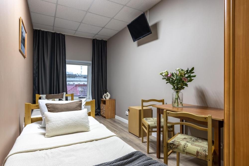 Номер стандарт одноместный с частичными удобствами: одной 1,5 сп. кроватью, тумбочкой, шкафом двухстворчатым, столом, двумя стульями. Основное освещение - потолочные лампы, пол - кафельная плитка. С общим душем и туалетом на этаже, есть небольшой бытовой уголок с микроволновкой, чайником и холодильником на этаже. Вид на магазины.