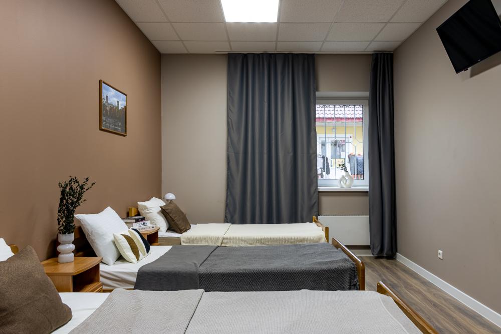 В номере три 1,5 спальные кровати, три тумбочками, шкаф двухстворчатый, стол, три стула, телевизор, зеркало. Общий душ и туалет на этаже, есть небольшой бытовой уголок с микроволновкой, чайником и холодильником на этаже. Основное освещение - потолочные лампы, пол - кафельная плитка. Вид на магазины.