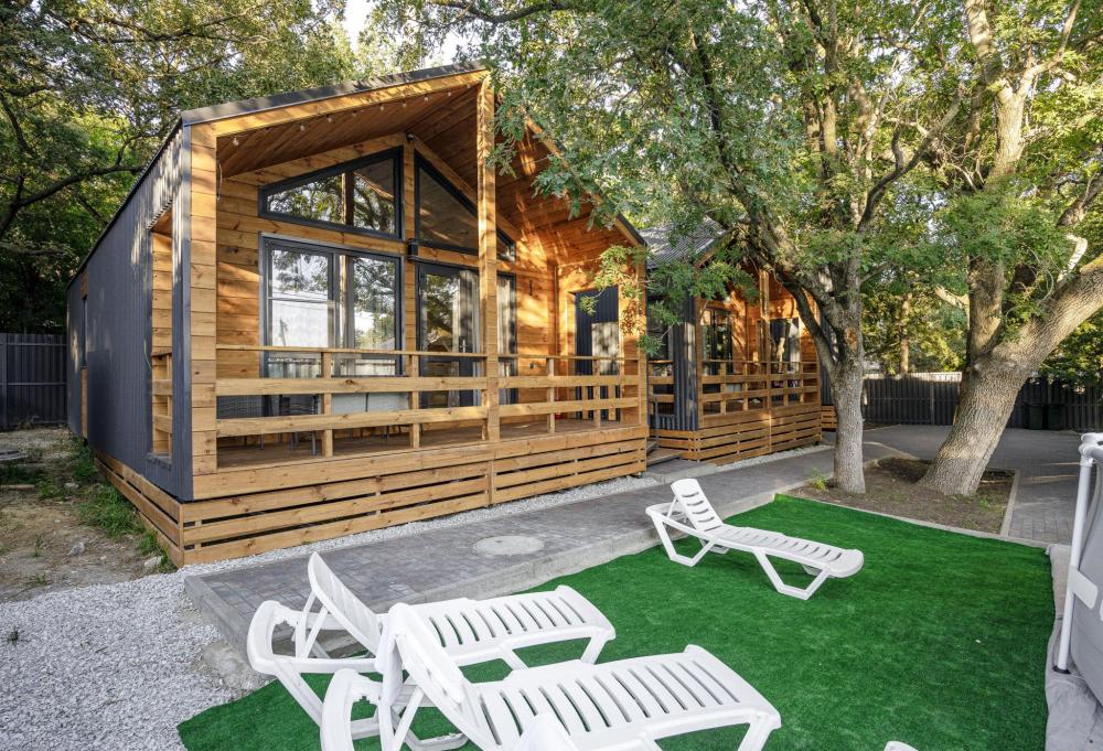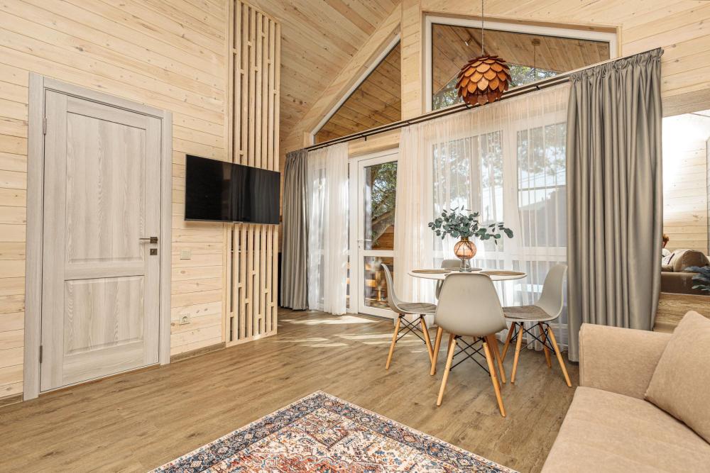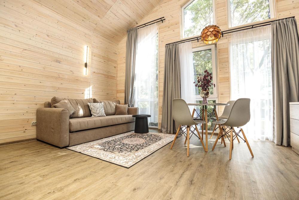 Коттедж семейный площадью 44 кв.м с видом во двор. Подходит для размещения 4 человек. Имеет спальню с приятным интерьером и гостинную. В номере: 1 двуспальная кровать, 1 двуспальный диван, телевизор, кондиционер, шкаф, вешалка, журнальный столик, холодильник, стулья, постельное бельё, полотенца. Индивидуальная ванная комната: душ, раковина, туалет, мыло. Личная терраса со стульями и столом.