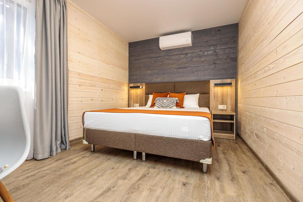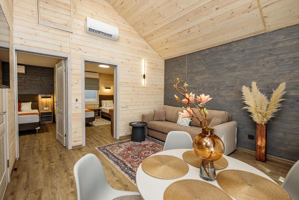 Двухкомнатный коттедж 2 площадью 44 кв.м с видом во двор. Подходит для размещения 6 человек (4 основных места и 2 дополнительных). Имеет 2 спальни и гостинная с приятным интерьером. В номере: 1 двуспальная кровать, 1 двуспальный диван, 2 односпальных кровати, телевизор, кондиционер, шкаф, вешалка, журнальный столик, холодильник, стулья. Индивидуальная ванная комната: душ, раковина, туалет. Личная терраса со стульями и столом.