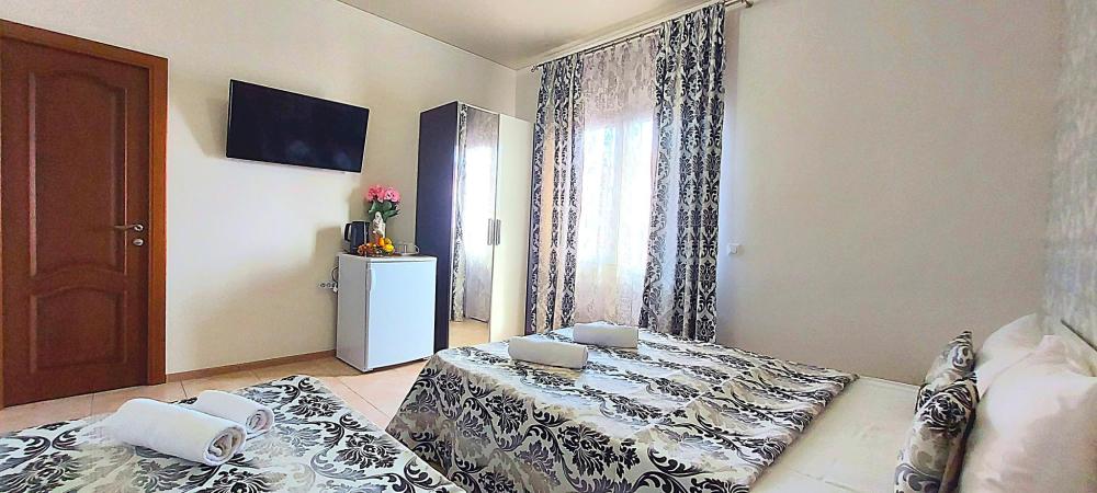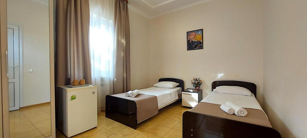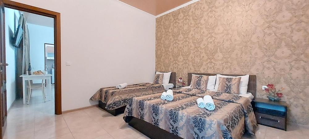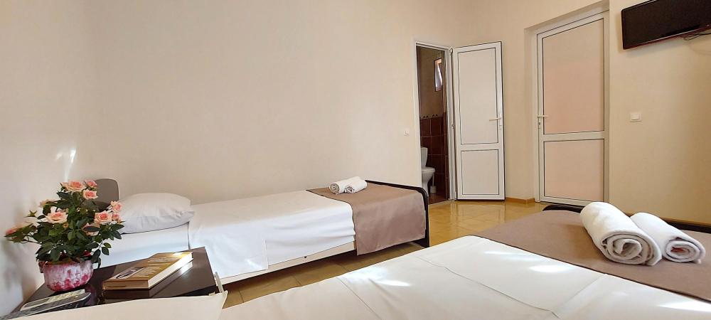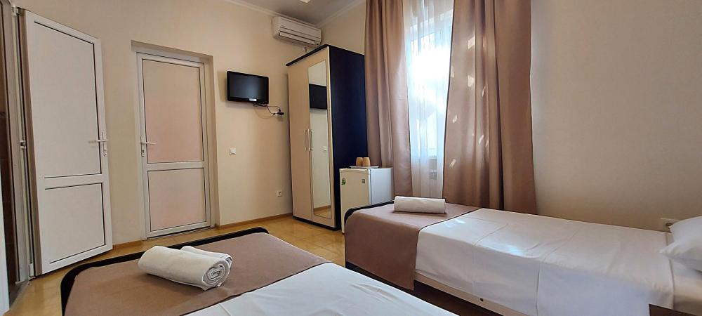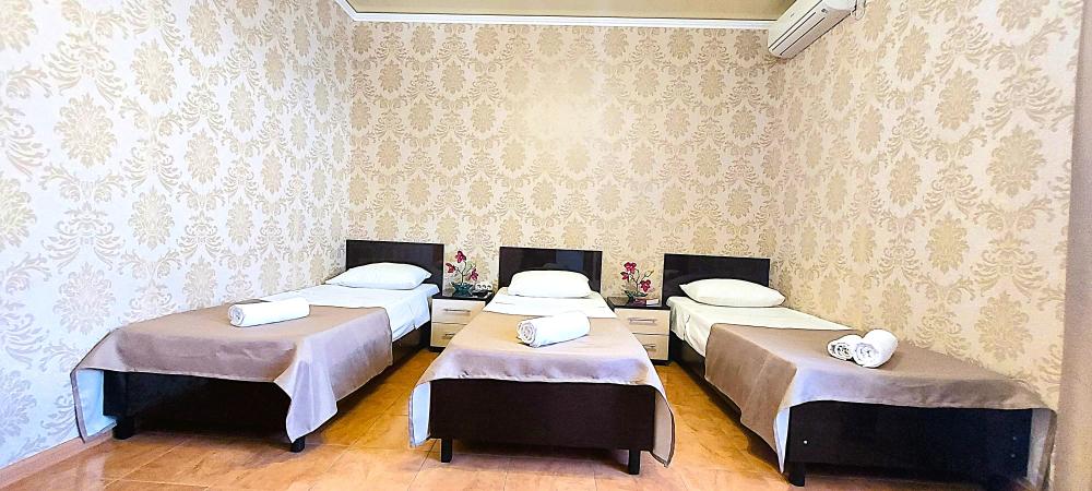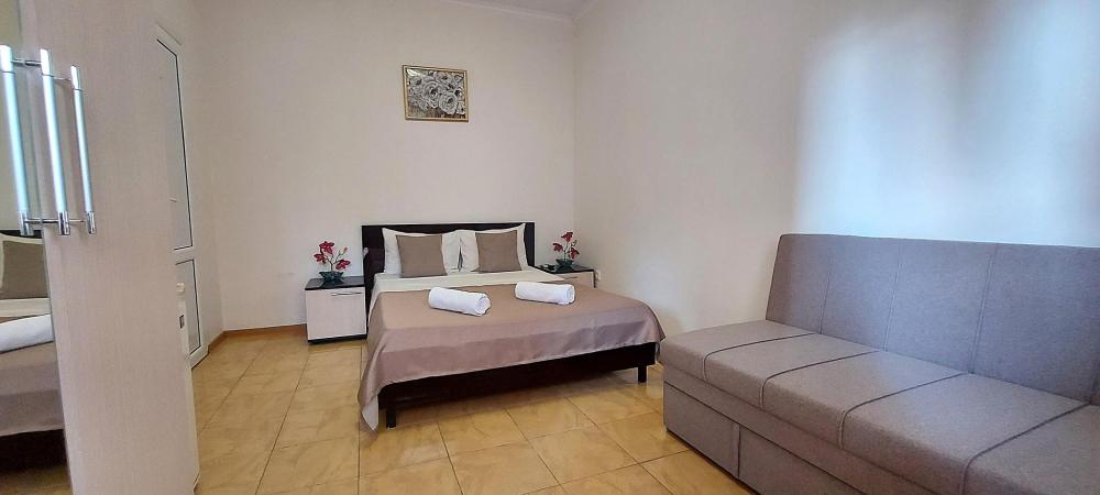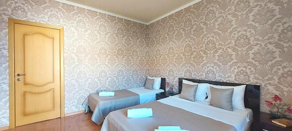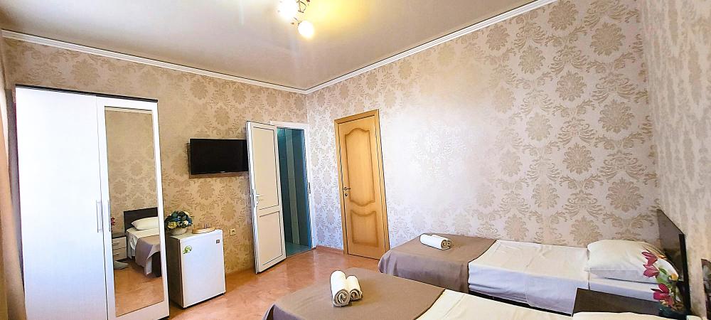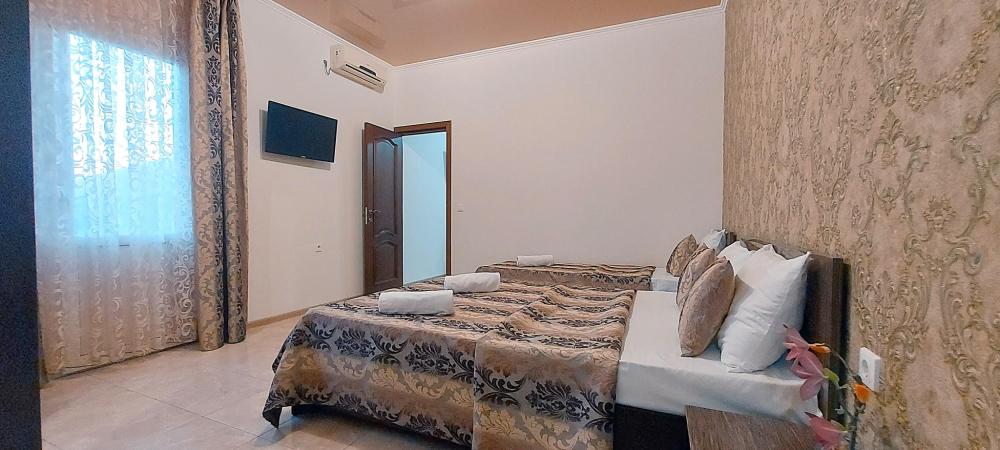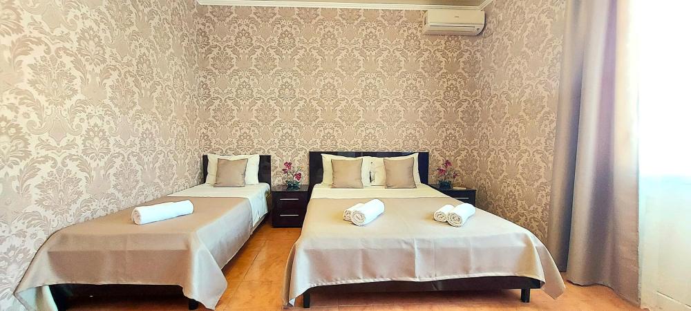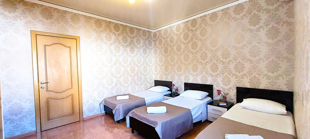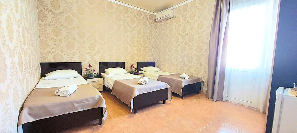 Семейный номер – это идеальный выбор для совместного путешествия с близкими. Двуспальная кровать обеспечит крепкий и спокойный сон после насыщенного активного дня, а удобный диван можно использовать как дополнительное спальное место или зону для отдыха. В отделке номера используются натуральные тёплые тона, а в интерьере - экостиль. Здесь уютно разместятся 3 взрослых человека, а при необходимости – двое взрослых с двумя детьми. В вашем распоряжении телевизор, кондиционер, бесплатный Wi-Fi и мини-холодильник, чтобы вы могли наслаждаться всеми привычными удобствами даже вдали от дома. Почувствуйте домашний уют и комфорт в наших семейных номерах.