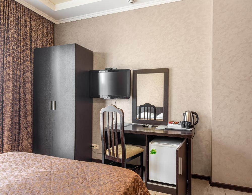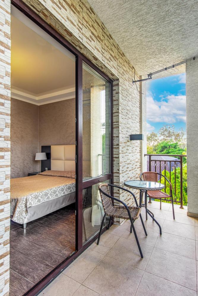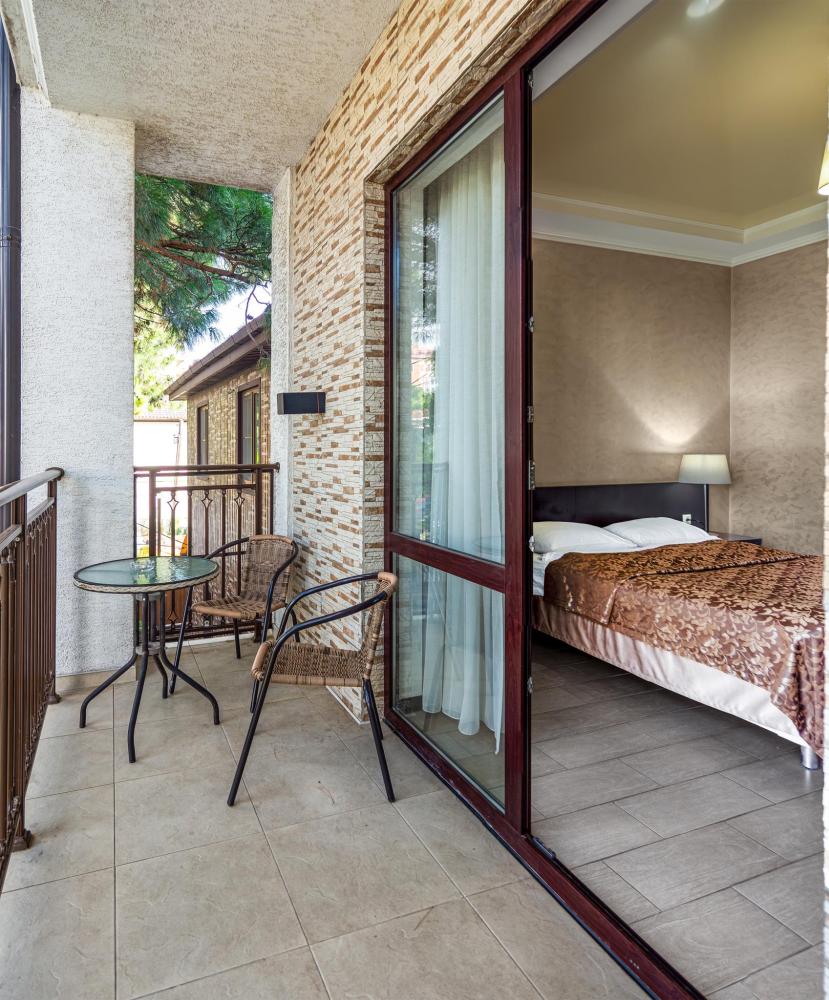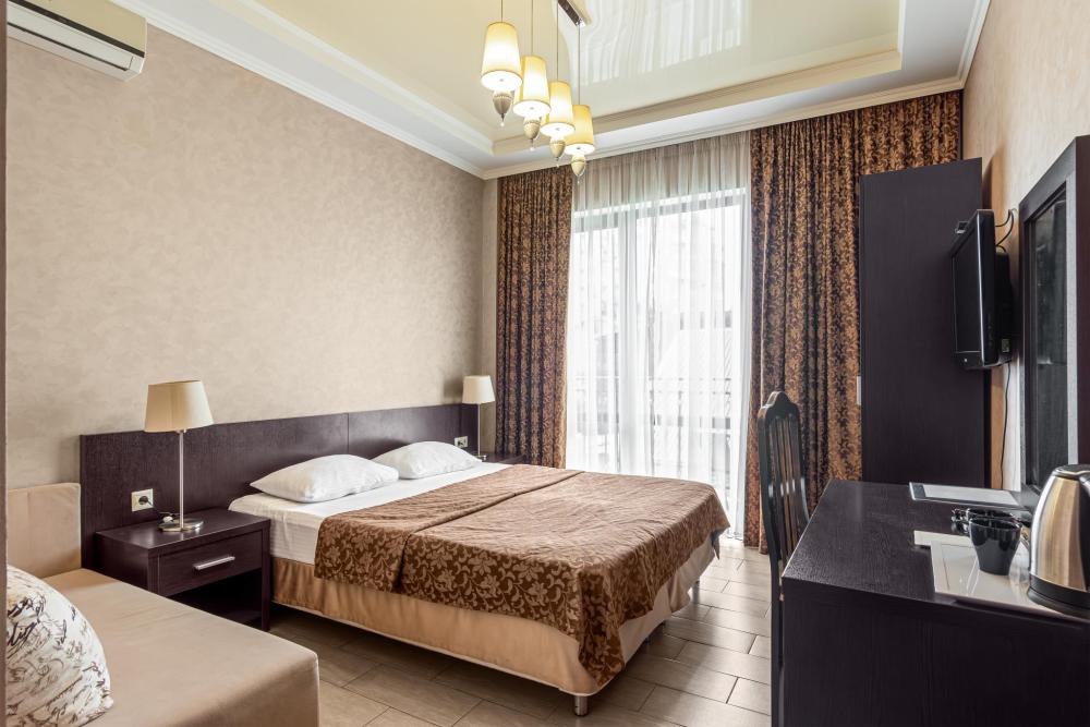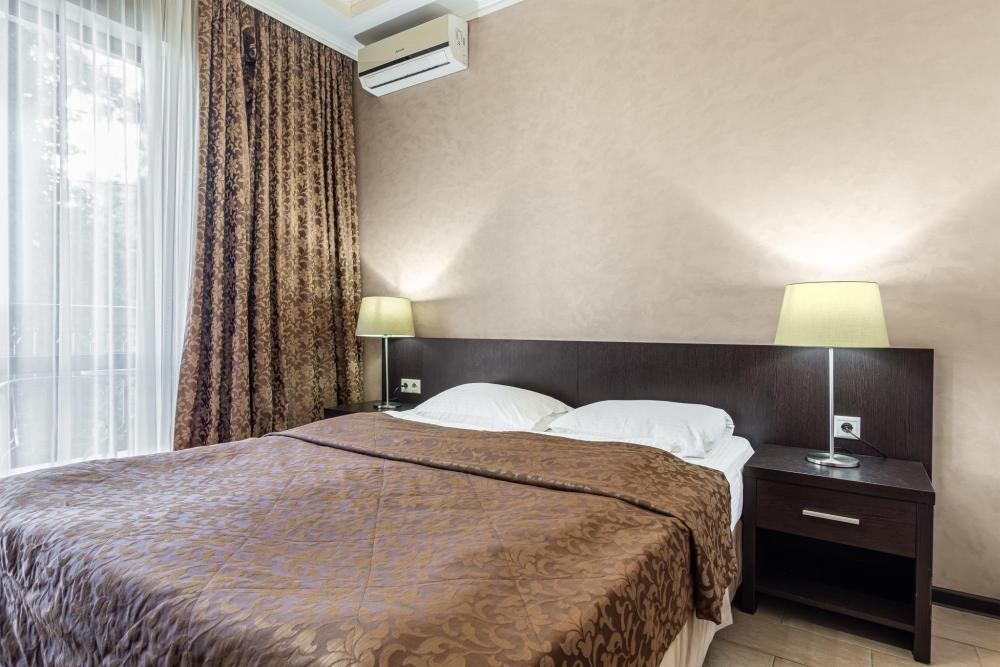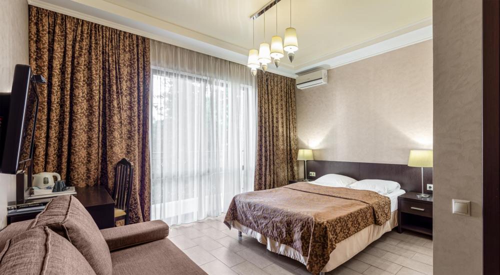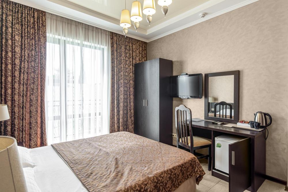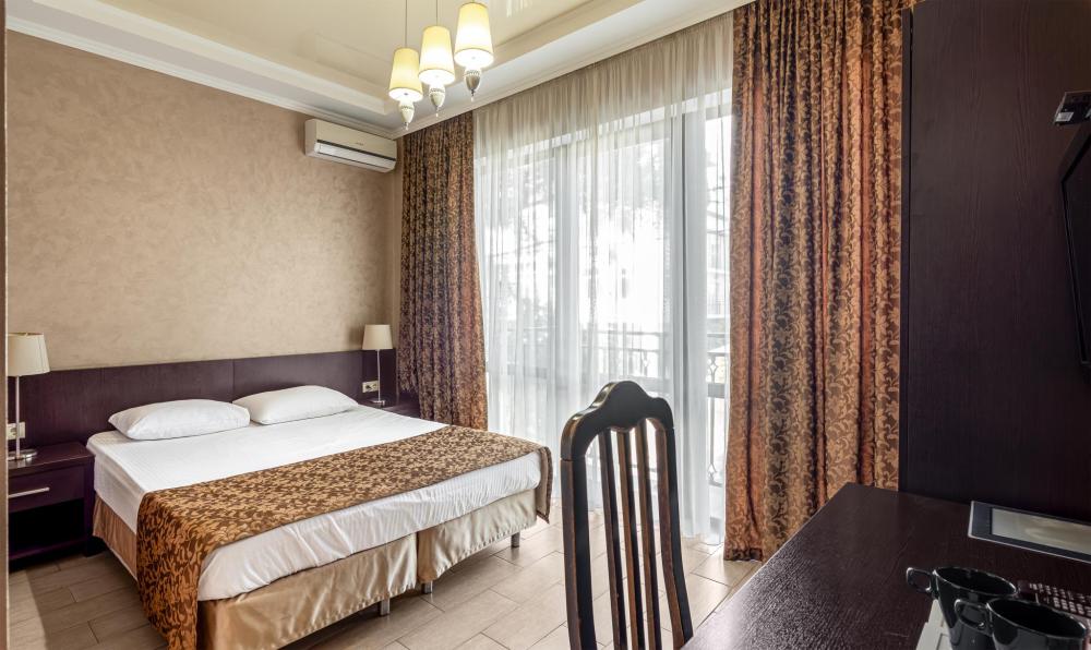 Двухместная комната стандарт с балконом. Стильная комната для двоих гостей, оснащена всеми необходимыми удобствами для полноценного отдыха. В комнате: двуспальная или две односпальные кровати, комплект мебели, кондиционер, холодильник, чайник, сейф, санузел с душем.