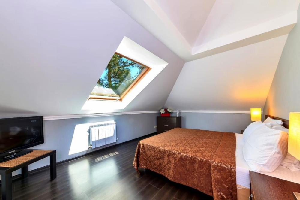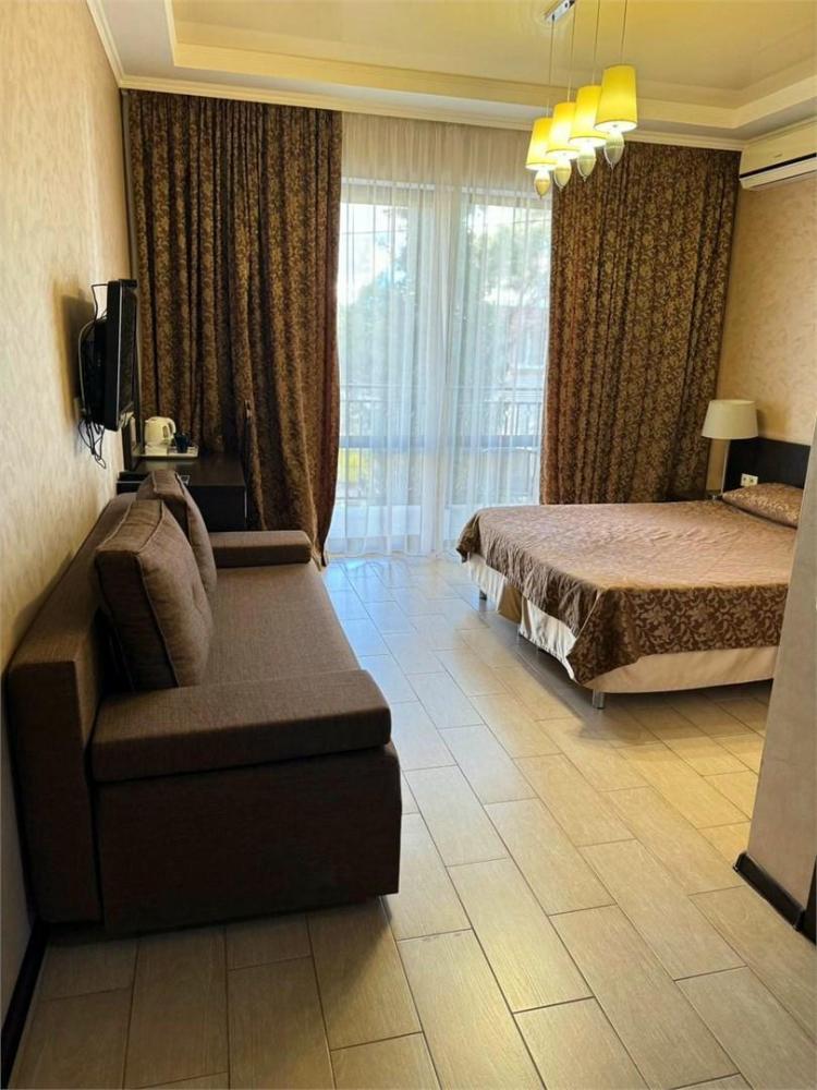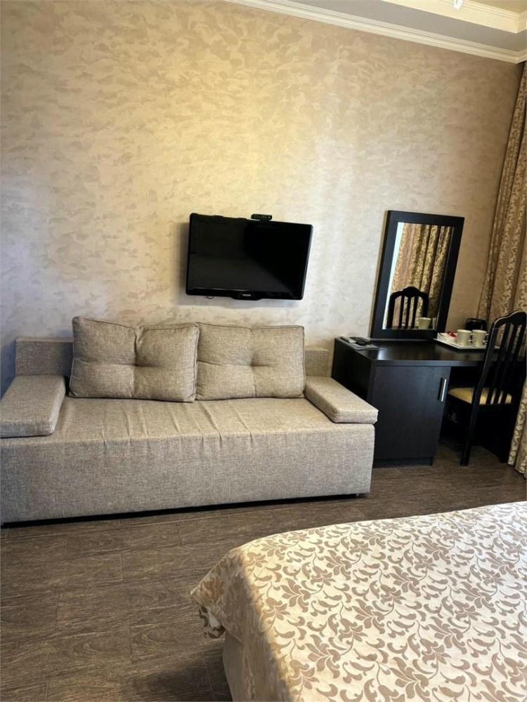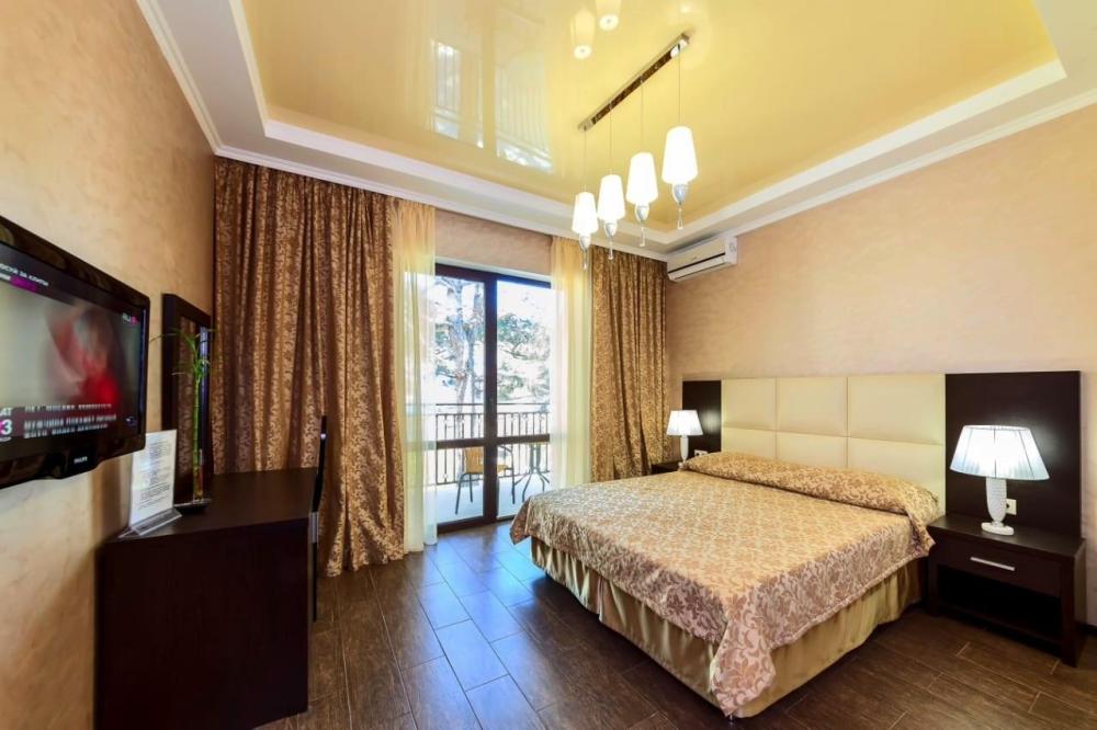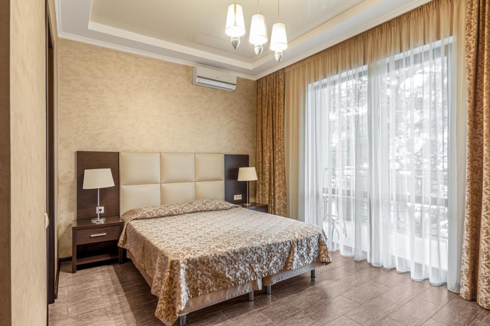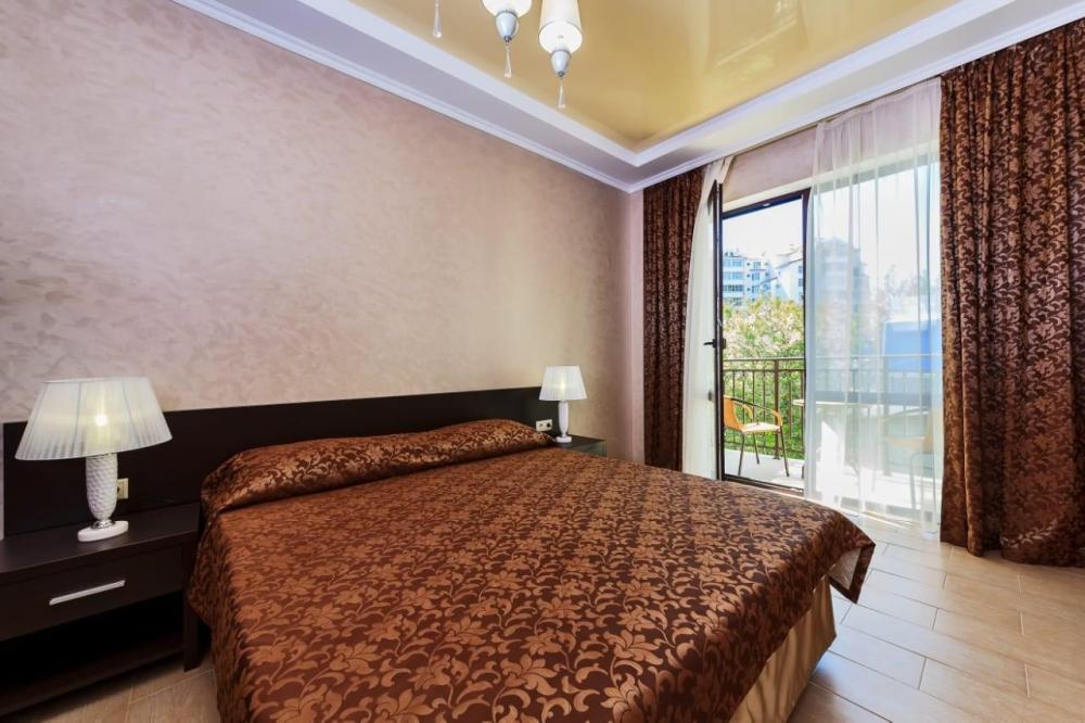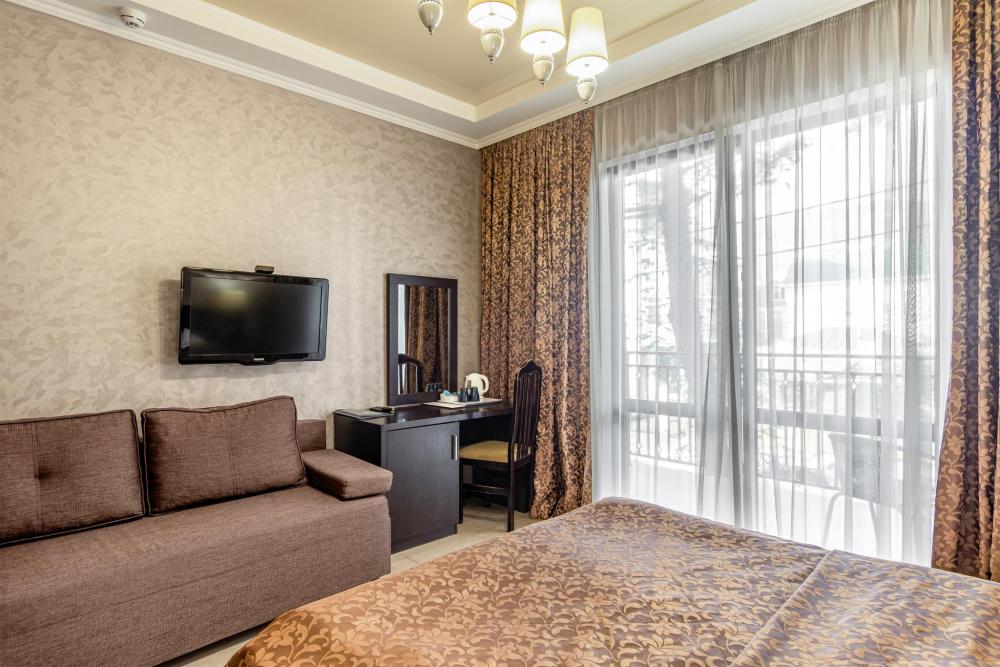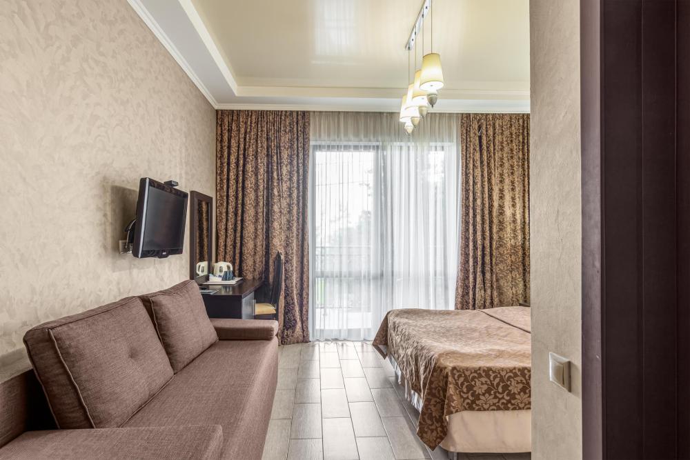 Четырехместная комната полулюкс с балконом, оборудованная всем необходимым для комфортного проживания. В комнате: двуспальная или две односпальные кровати, раскладной диван, комплект мебели, кондиционер, холодильник, чайник, сейф, санузел с душем.