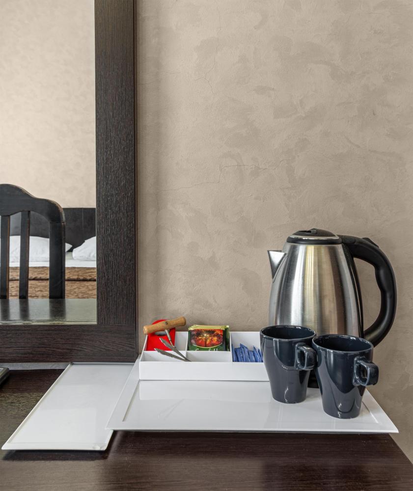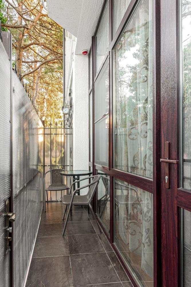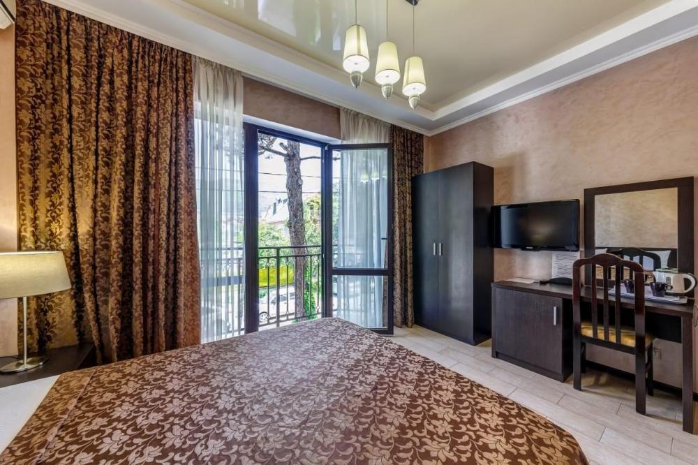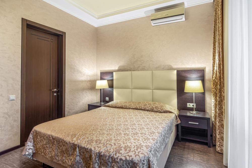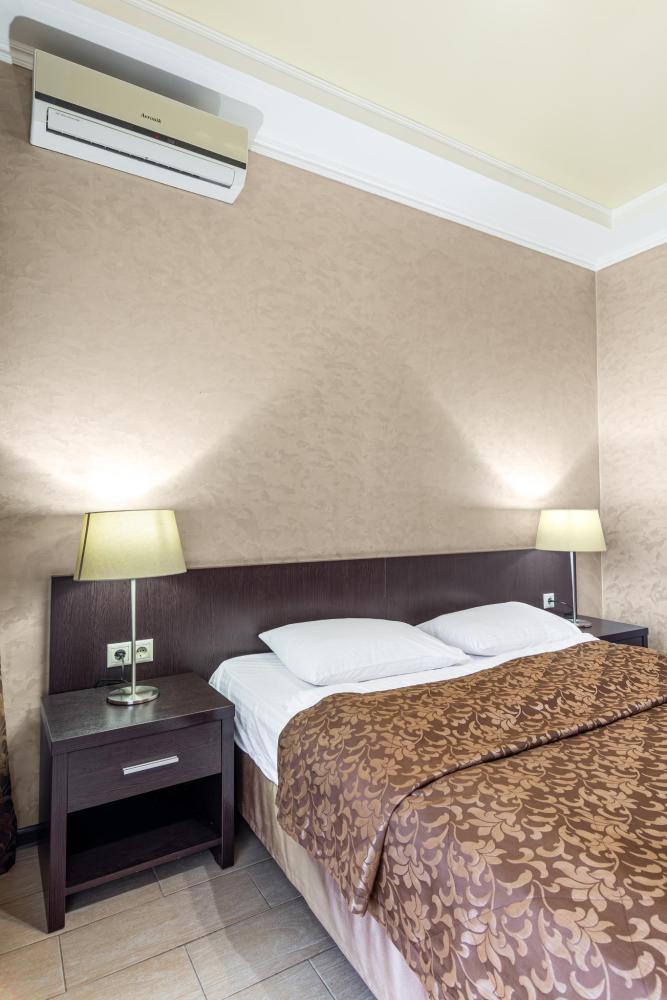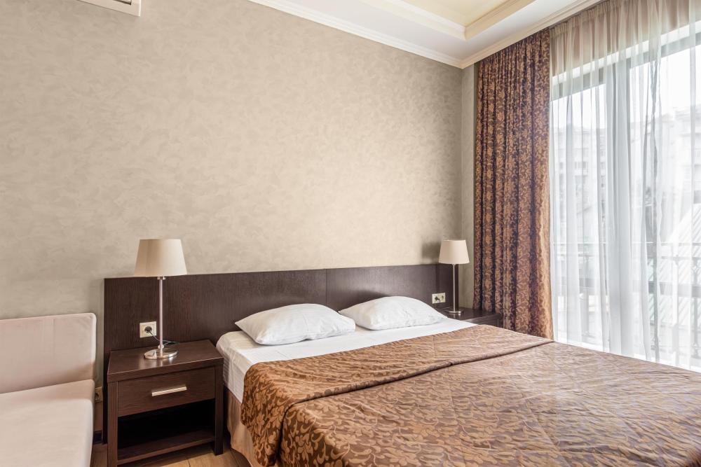 Двухместная комната стандарт с французским балконом. В комнате: двуспальная или две односпальные кровати, комплект мебели, кондиционер, холодильник, чайник, сейф, санузел с душем.