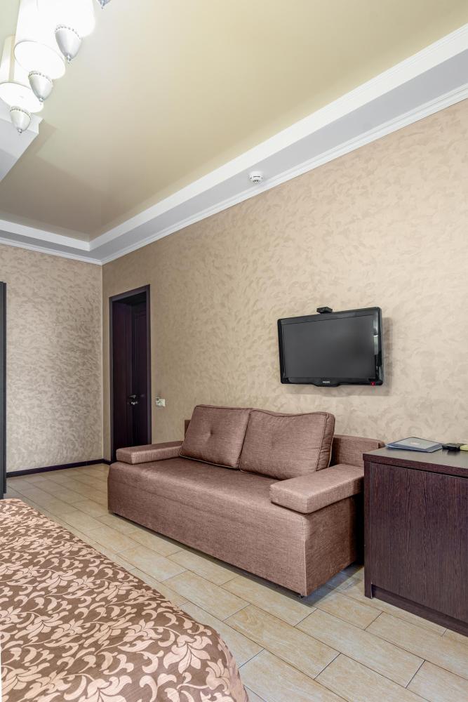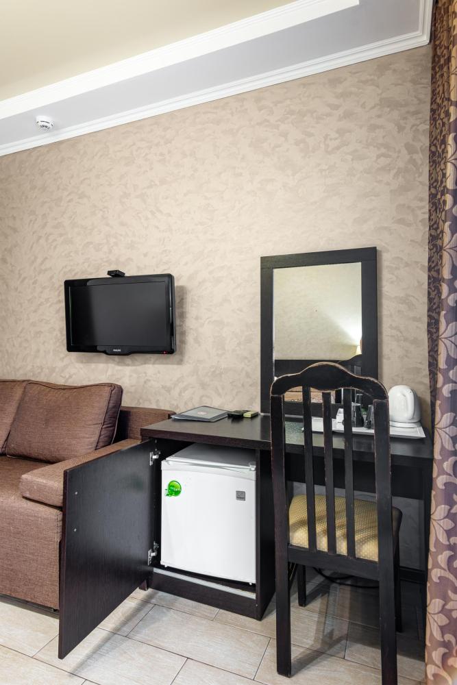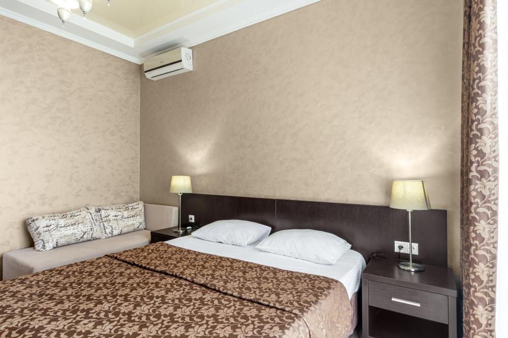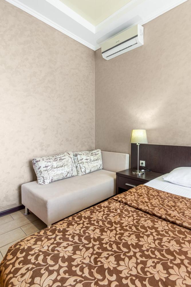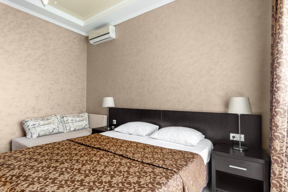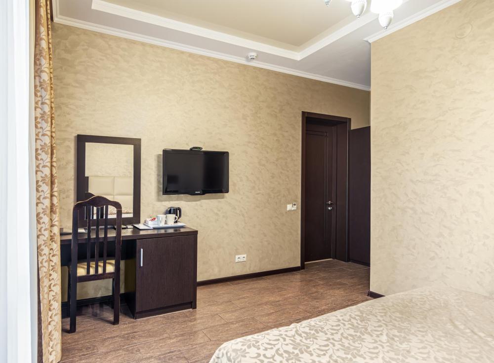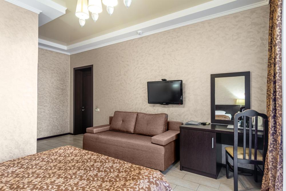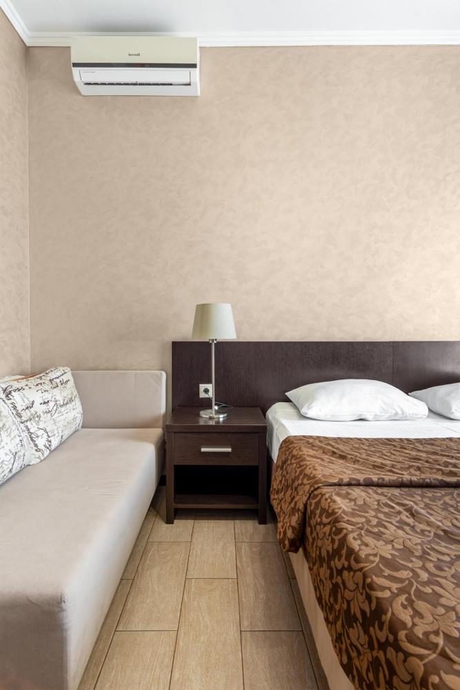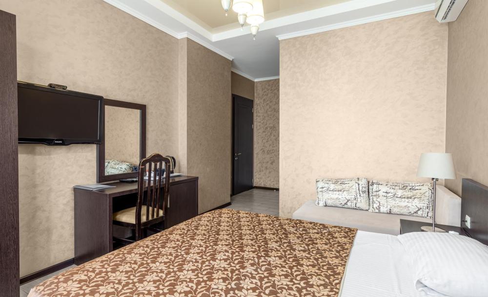 Трехместная комната полулюкс с балконом, оборудованная всем необходимым для комфортного проживания. В комнате: двуспальная и односпальная кровати или три односпальные кровати, комплект мебели, кондиционер, холодильник, чайник, сейф, санузел с душем.
