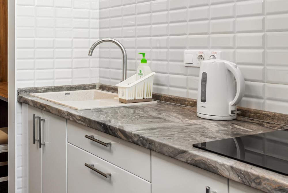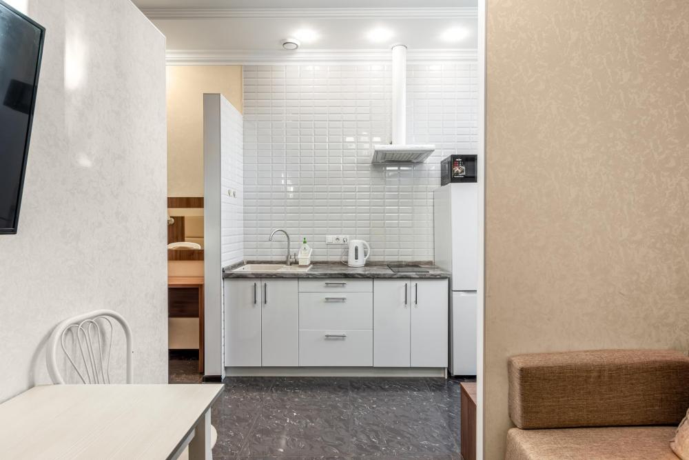 Четырехместная семейная студия с кухней. Четырехместная семейная студия-отличный вариант для семьи из 3-4 человек. Комната визуально разделена на спальную и гостиную зоны, а также имеет свою укомплектованную кухню и стиральную машину. Расположена на 1 этаже с собственной террасой.