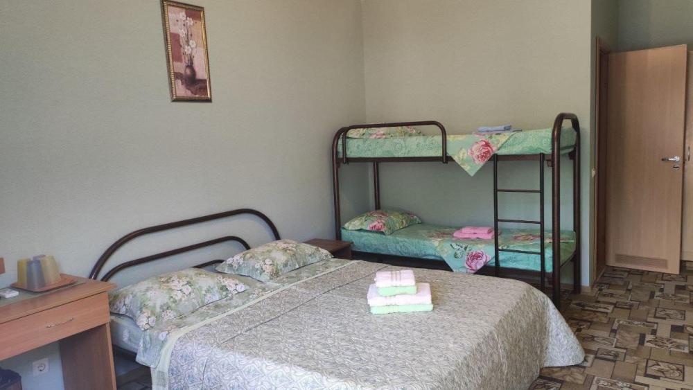 Уютная комната, оборудованная всем для комфортного отдыха. В комнате двуспальная кровать и двухъярусная кровать, плазменный ТВ с цифровыми каналами. Санузел оборудован просторным душем, а современный ремонт гарантирует отсутствие посторонних запахов. Гостям предоставляется хлопковое белье, удобный матрас и подушки. Вход в номер с общего балкона, где у каждой комнаты есть зона чаепития со столом и стульями.