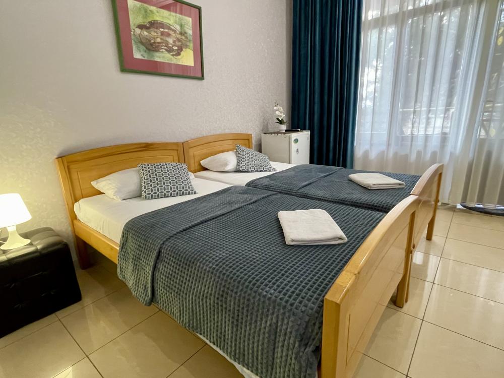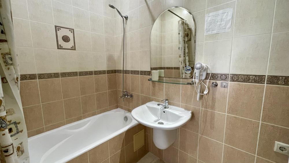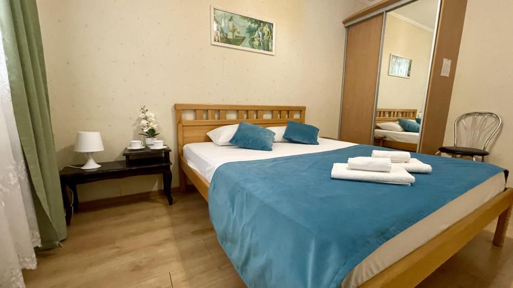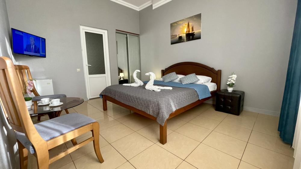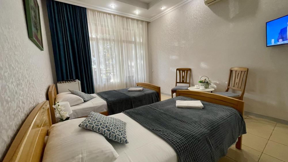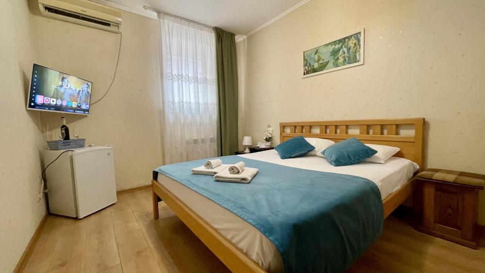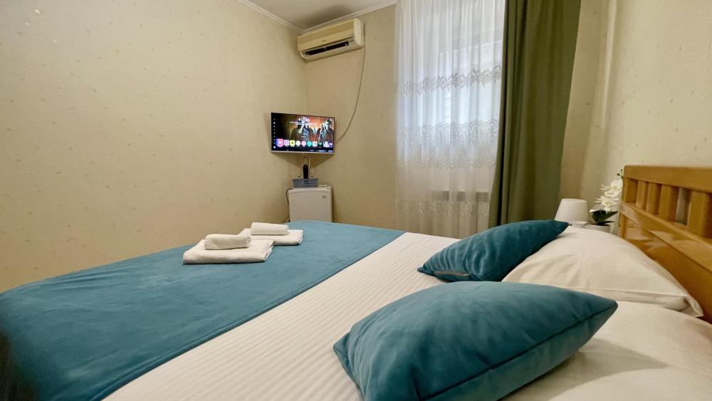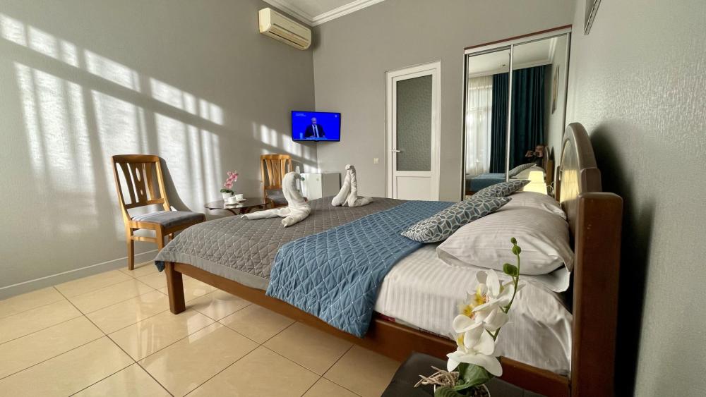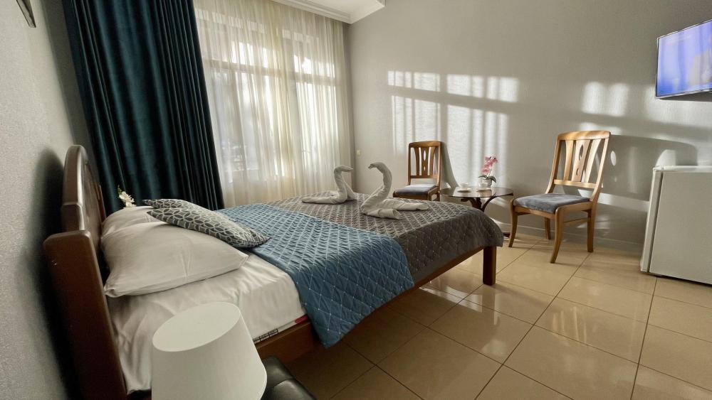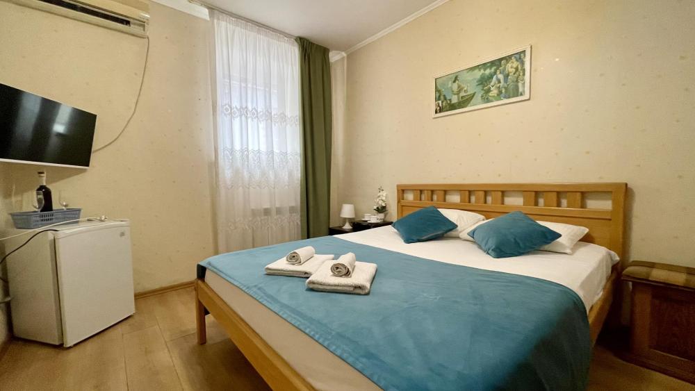 Двухкомнатный номер стандарт площадью 28 кв.м. для размещения до 4-х гостей. Для комфортного проживания гостей номер оснащен всем необходимым: двухспальная кровать, диван, 2 кондиционера, 2 телевизора, холодильник, чайник, шкаф, ванная комната, фен, набор полотенец.