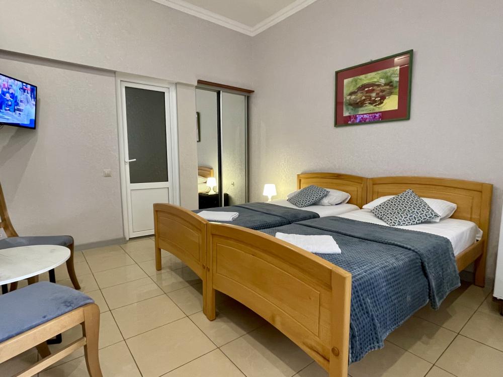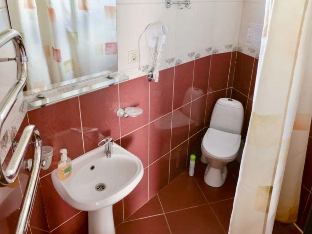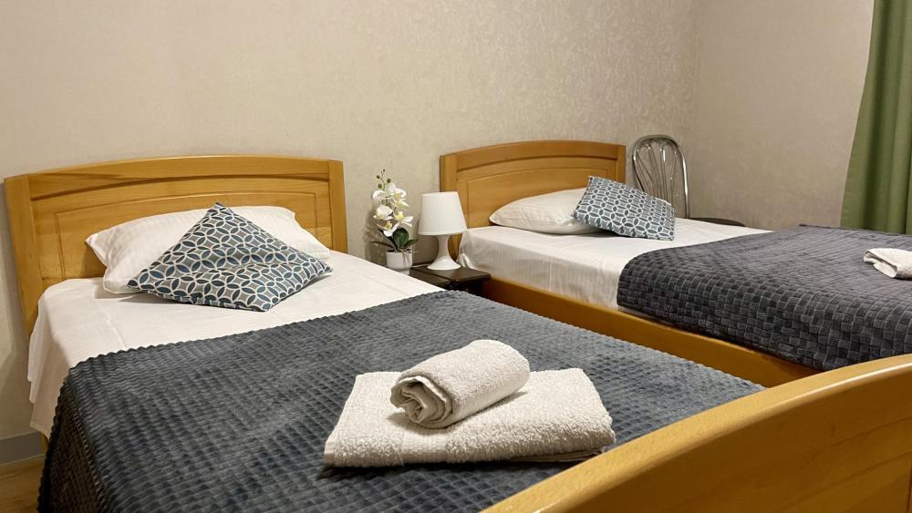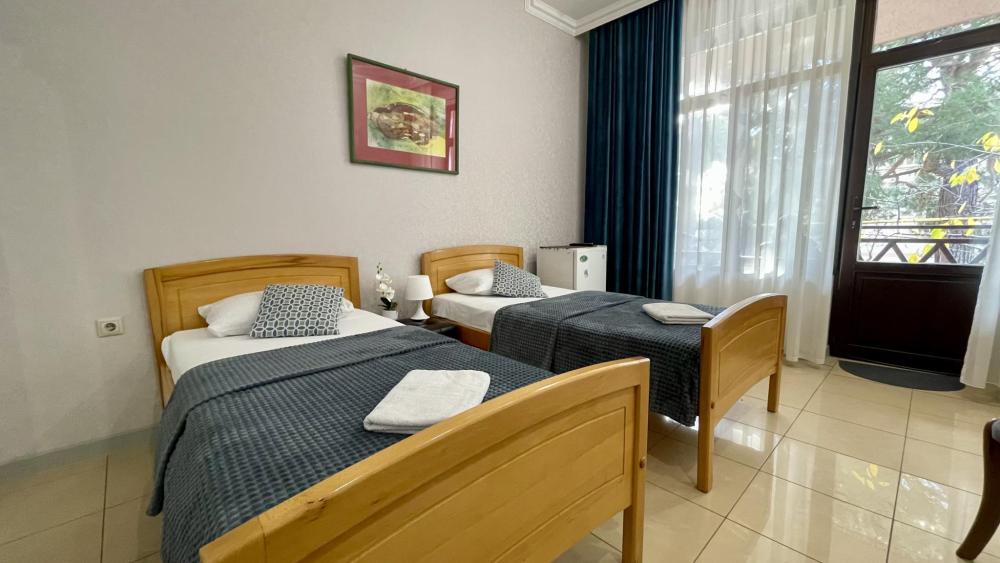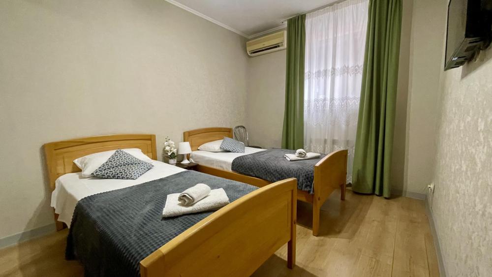 Номер эконом площадью 14 кв.м. для размещения до 2-х гостей. Оснащение номера: две односпальные кровати, кондиционер, телевизор, холодильник, чайник, шкаф, набор полотенец. Душ и туалет общие на этаже.