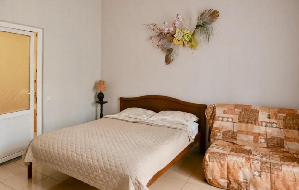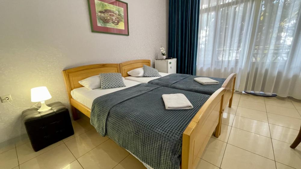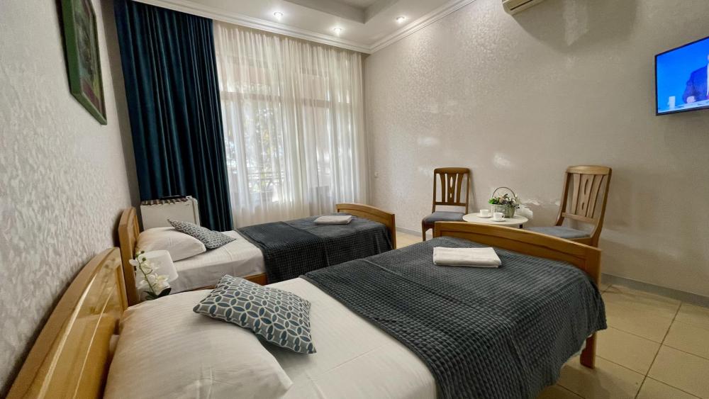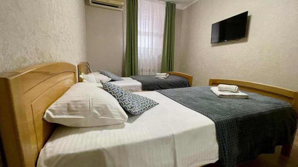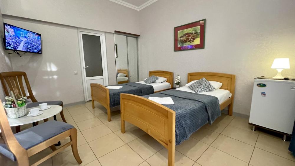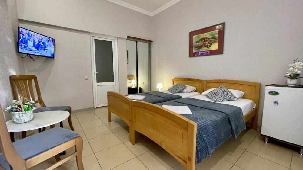 Четырехместный номер стандарт площадью 18 кв.м. для размещения до 4-х гостей. Для комфортного проживания гостей номер оснащен всем необходимым: двухспальная кровать, диван, кондиционер, телевизор, холодильник, чайник, шкаф, ванная комната, фен, набор полотенец.