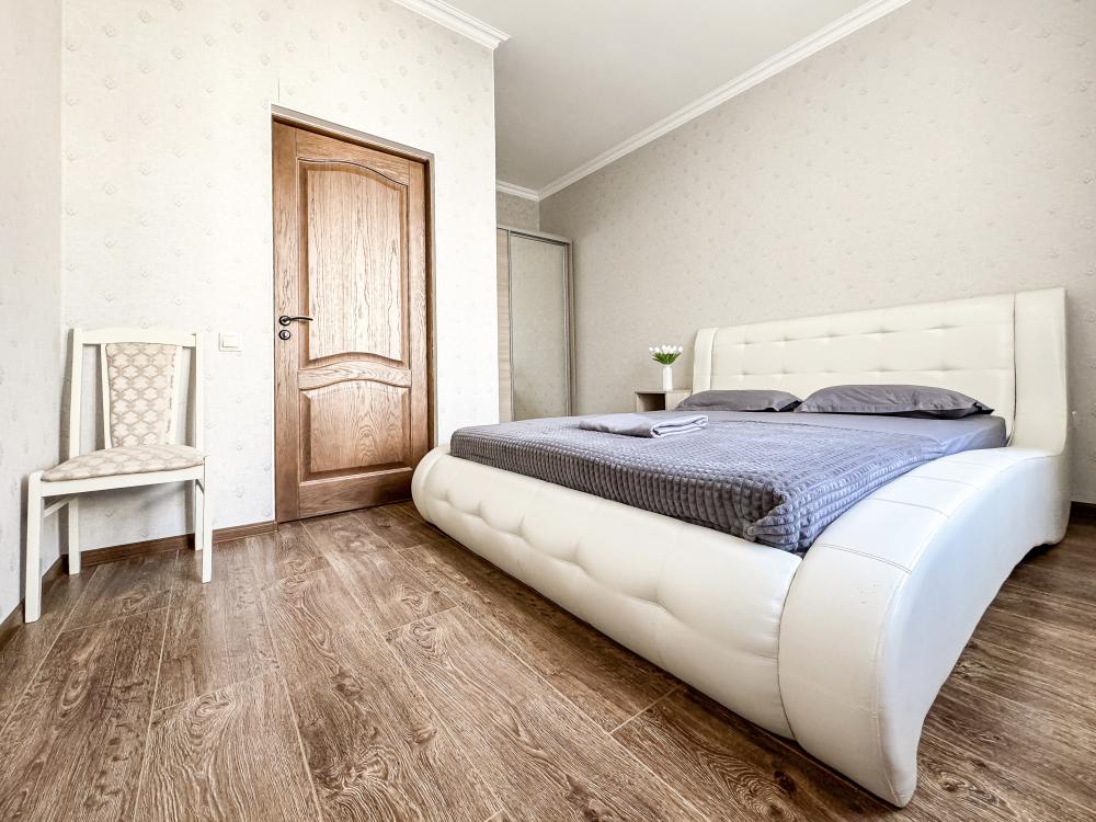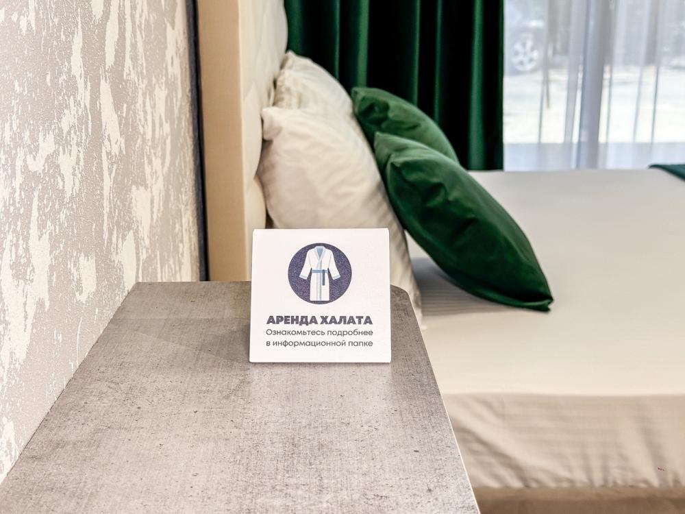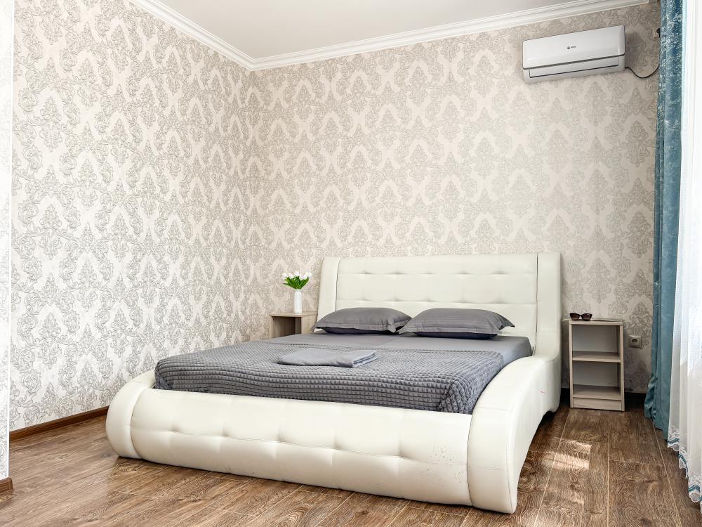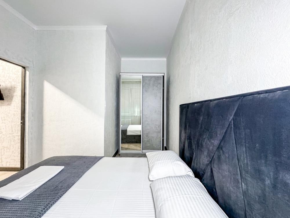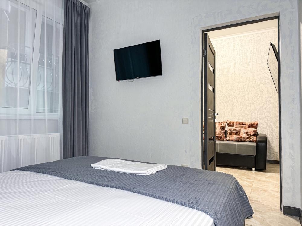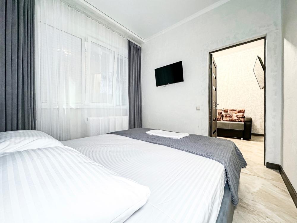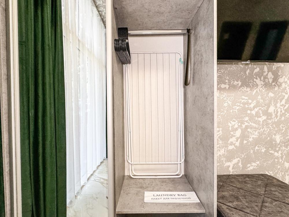 Двухкомнатный номер с двумя спальнями, площадь номера 40 кв.м. В каждой спальне двуспальная кровать, свой телевизор и кондиционер. В одной из спален + раскладной диван - где можно разместить +2 гостей. В прихожей номера шкаф купе с зеркалом в полный рост, холодильник, чайник, чашки. Прикроватные тумбы, розетки у кровати. В номере есть небольшой "мини" балкон, который смотрит на соседнее здание Утюг, доска, кухня на этаже
