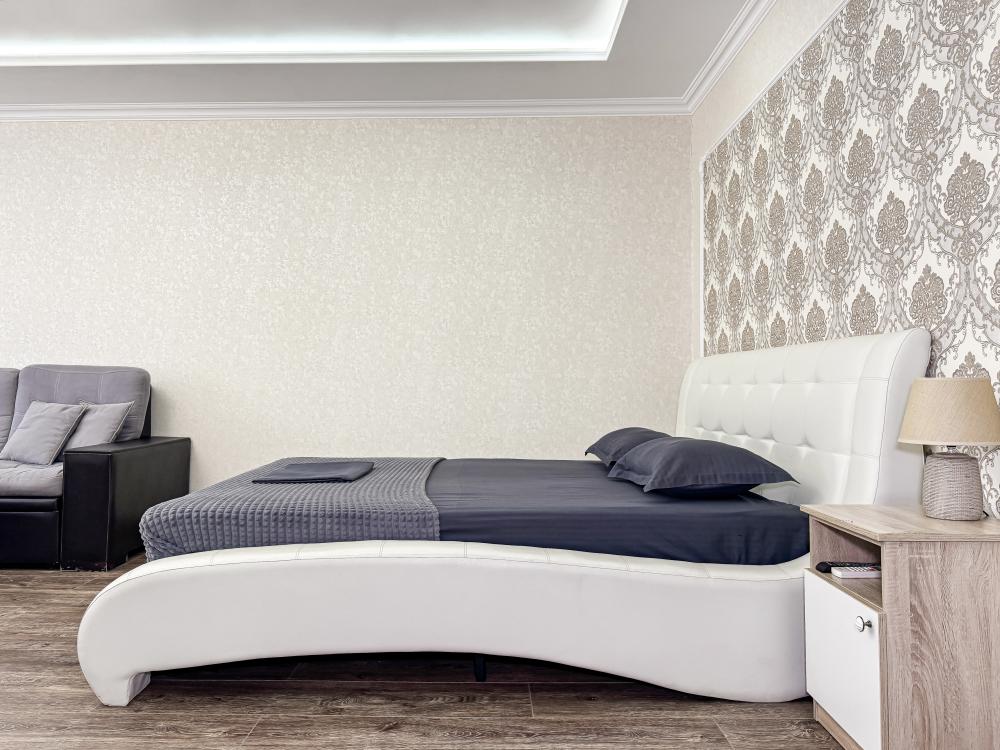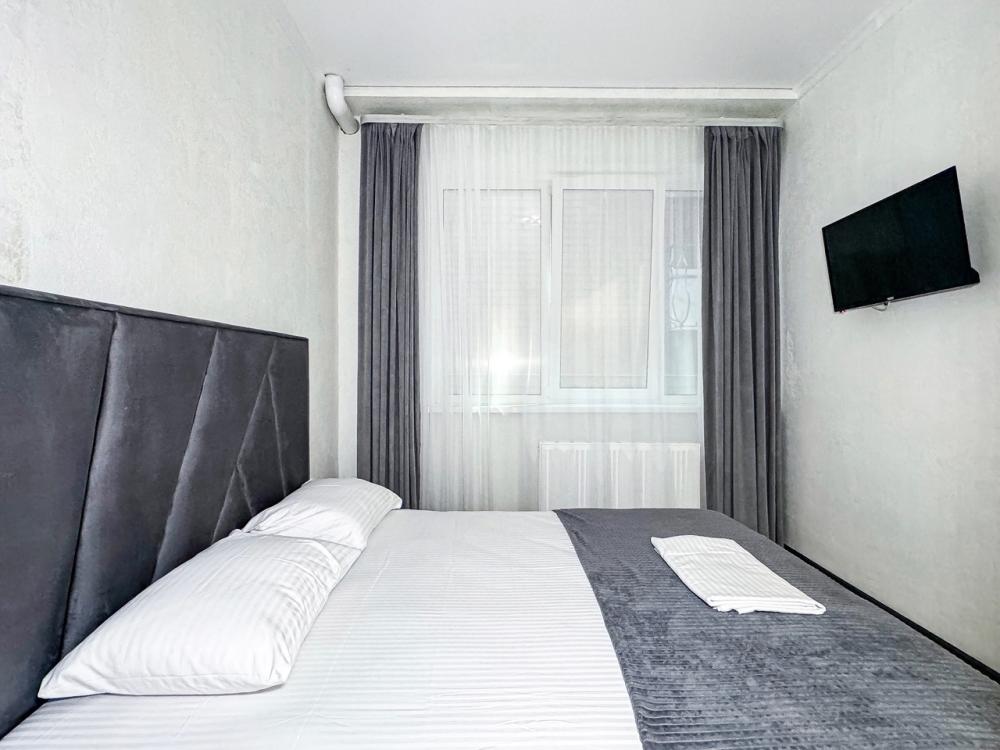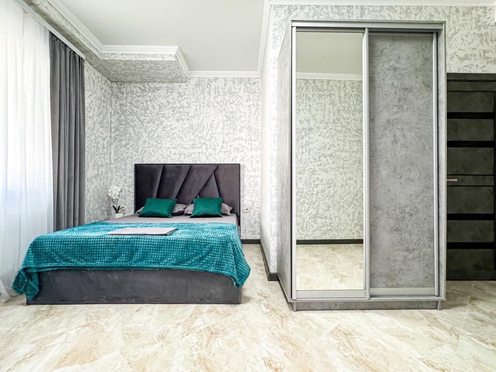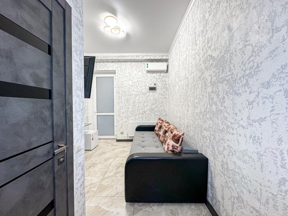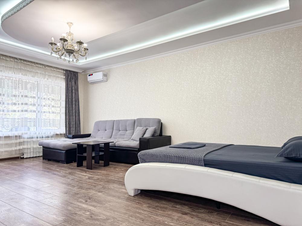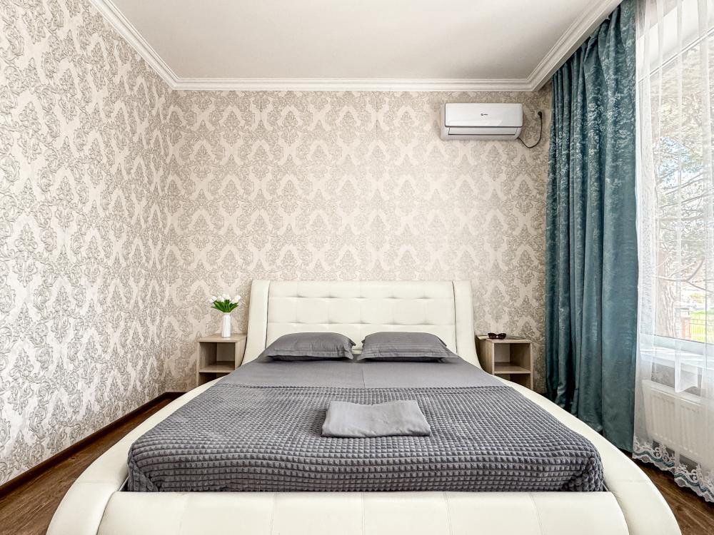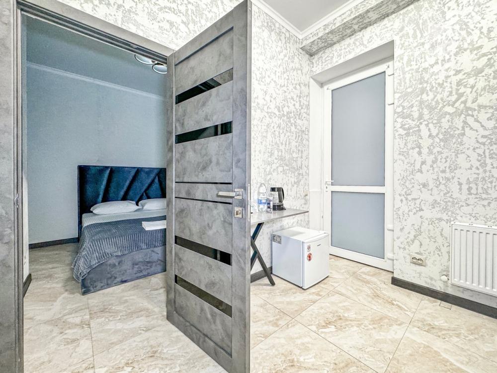 Двухкомнатный номер с двумя спальнями, площадь номера 40 кв.м. В каждой спальне двуспальная кровать, свой телевизор и кондиционер. В одной из спален + раскладной диван - где можно разместить +2 гостей. В прихожей номера шкаф купе с зеркалом в полный рост, холодильник, чайник, чашки. Прикроватные тумбы, розетки у кровати. В номере есть небольшой "мини" балкон, который смотрит на соседнее здание Утюг, доска, кухня на этаже