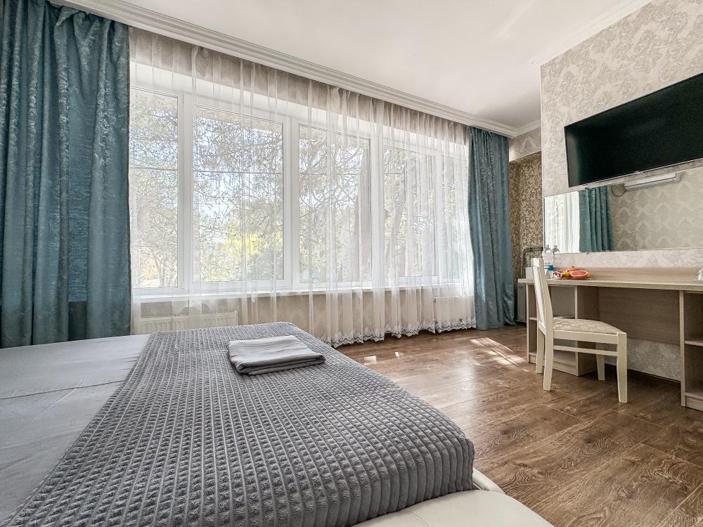 Улучшенный однокомнатный двухместный номер. 20 кв.м. Душ, туалет, фен, кондиционер, плазменный телевизор, шкаф купе с зеркалом в полный рост. Стол, стул, чайник, чашки, холодильник, прикроватные тумбы, розетки у кровати. WI FI. Гладильная доска, утюг и кухня на этаже. Вид с окна во двор