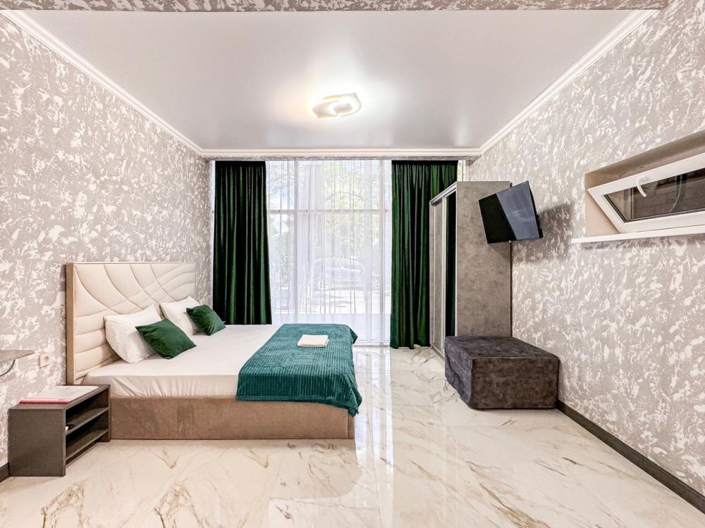 Двухкомнатный полулюкс 45 кв.м. Душ, туалет, фен. В прихожей большой холодильник. В каждой спальне широкая кровать, свой телевизор и кондиционер. В одной из спален балкон во двор. Во второй вид из окна во двор, так же стол и стулья. Холодильник, чайник, чашки. Платяной шкаф с зеркалом в полный рост, прикроватные тумбы, розетки у кроватей. WI FI, кухня, утюг с доской на этаже